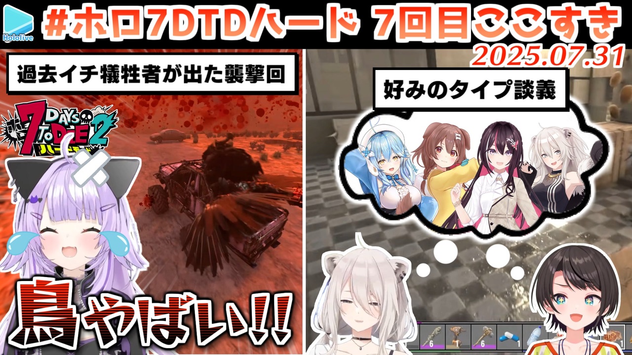 <a href="#" class="seekTime" data-seekTime="00:00" onclick="seekNicoPlayer('#00:00'); return false;">#00:00</a> また地下奴隷になるスバル<br><a href="#" class="seekTime" data-seekTime="02:20" onclick="seekNicoPlayer('#02:20'); return false;">#02:20</a> 足ぺろぺろ<br><a href="#" class="seekTime" data-seekTime="04:25" onclick="seekNicoPlayer('#04:25'); return false;">#04:25</a> 襲撃<br><a href="#" class="seekTime" data-seekTime="15:13" onclick="seekNicoPlayer('#15:13'); return false;">#15:13</a> キコNG<br><a href="#" class="seekTime" data-seekTime="16:12" onclick="seekNicoPlayer('#16:12'); return false;">#16:12</a> 邪魔するで~<br><a href="#" class="seekTime" data-seekTime="16:45" onclick="seekNicoPlayer('#16:45'); return false;">#16:45</a> ギリギリ悪くないわため<br><a href="#" class="seekTime" data-seekTime="17:32" onclick="seekNicoPlayer('#17:32'); return false;">#17:32</a> タイプの女の子<br><br>元動画様はこちら<br>【 ホロ7DTDハード】DAY7/激闘!!!襲撃がきちゃぁあああ!! 砂漠バイオーム編【ホロライブ/白上フブキ】<br><a href="https://youtu.be/DmZFKgBZa4A" target="_blank" rel="noopener nofollow">https://youtu.be/DmZFKgBZa4A</a><br><br>【ホロ7DTDハード】襲撃だ~~~~!!!!ゾンビVS人間のバトルしゅばあああああああああああああああ!!!!!:7days to die【ホロライブ/大空スバル】<br><a href="https://youtu.be/Kfu13pGNAms" target="_blank" rel="noopener nofollow">https://youtu.be/Kfu13pGNAms</a><br><br>【 ホロ7DTDハード 】砂漠で迎える襲撃日!!!頼むぞ、スタンバトン部隊【大神ミオ視点】<br><a href="https://youtu.be/DXR9ezmOvOw" target="_blank" rel="noopener nofollow">https://youtu.be/DXR9ezmOvOw</a><br><br>7【ホロ7DTDハード】砂漠襲撃‼ハードモードゾンビの世界で生き残るにぇ!!!!!【ホロライブ/さくらみこ】<br><a href="https://youtu.be/OHXmXlPFhZI" target="_blank" rel="noopener nofollow">https://youtu.be/OHXmXlPFhZI</a><br><br>【 DAY7 | ホロ7DTDハード 】砂漠の襲撃!スタンバトンで穴に落とせ🧟🔥【 猫又おかゆ視点/ホロライブ 】<br><a href="https://youtu.be/6oL0l9O9094" target="_blank" rel="noopener nofollow">https://youtu.be/6oL0l9O9094</a><br><br>【 ホロ7DTDハード | DAY7 】DAY7!砂漠の襲撃が来るッ!7Days to Die!【角巻わため/ホロライブ4期生】<br><a href="https://youtu.be/OD686BdxXUs" target="_blank" rel="noopener nofollow">https://youtu.be/OD686BdxXUs</a><br><br>【 ホロ7DTDハード 】6 砂漠での襲撃!!!イケるのか!?🏜️【常闇トワ視点/ホロライブ 】<br><a href="https://youtu.be/https://youtu.be/crRLj1xPAzI" target="_blank" rel="noopener nofollow">https://youtu.be/https://youtu.be/crRLj1xPAzI</a><br><br>【ホロ7DTDハード Day7】3回目の襲撃!砂漠エリアのクリアは果たして…?🌵【獅白ぼたん/ホロライブ】<br><a href="https://youtu.be/nc8F_PXNtqw" target="_blank" rel="noopener nofollow">https://youtu.be/nc8F_PXNtqw</a><br><br>【ホロ7DTDハード】砂漠の襲撃にそなえろ!【尾丸ポルカ/ホロライブ】<br><a href="https://youtu.be/ZiIT1_81v7k" target="_blank" rel="noopener nofollow">https://youtu.be/ZiIT1_81v7k</a><br><br>【 ホロ7DTDハード 】DAY5 | 砂漠の襲撃がくるぞ。【鷹嶺ルイ/ホロライブ】<br><a href="https://youtu.be/diGZ0qS3EV4" target="_blank" rel="noopener nofollow">https://youtu.be/diGZ0qS3EV4</a><br><br>【 ホロ7DTDハード 】砂漠で襲撃だあああ!!!【#輪堂千速 / hololivedev_is FLOWGLOW 】<br><a href="https://youtu.be/-lNsbpMDF0s" target="_blank" rel="noopener nofollow">https://youtu.be/-lNsbpMDF0s</a><br /><span style="color: #b7b7b7; font-size: 10px;">ホロライブ切り抜き/なめたけ <a href="https://t.co/CBwJLnYR2c" target="_blank" rel="noopener nofollow">https://t.co/CBwJLnYR2c</a></span>