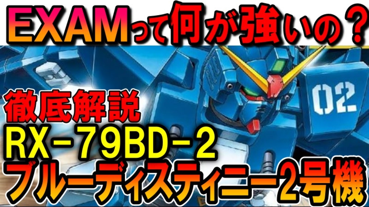 【EXAMシステムの完成機】RX-79BD-2ブルーディスティニー2号機。EXAMの強さ、使いこなし方などを徹底解説【機動戦士ガンダム外伝】<br><br>機動戦士ガンダム外伝ブルーディスティニーなど登場するMS、RX79-BD-2ブルーディスティニー2号機を解説、考察していきます。<br>今回は解説と考察が同じくらいです。<br>いいねに次回予告的なものも。<br><br>自分が過去にした考察のせいでマリオンの影に変なのがちらつくようになってしまいました<br>凄く困りました<br>EXAMの正体、真実については、3号機解説で触れる予定ですm(_ _)m<br><br>※2025年8月2日<br> ガンダム4号機と5号機の設定が逆になっていたものを修正<br> 動画後半のEXAMの条件に補足説明追加(また3号機の時に解説します)<br><br>現在連載中の小説を見てくださる方はこちら:<br>死に戻り34回目、もう疲れたので私アイドルになります!<br>※初期コンセプトは死に戻ったガルマがシャアを救うにはどうしたら良いのか的な物語を全部女の子でやった感じです。<br>※ここが駄目、もっとこうしたらなどのアドバイスも大歓迎です<br><a href="https://kakuyomu.jp/works/16817330662598051943" target="_blank" rel="noopener nofollow">https://kakuyomu.jp/works/16817330662598051943</a><br><br>質問、などありましたらこちらにも<br><a href="https://twitter.com/@i4S0LHspdgzBTor" target="_blank" rel="noopener nofollow">https://twitter.com/@i4S0LHspdgzBTor</a><br><br>清見元康名義でカクヨム、小説家になろう、たいあっぷなどに投稿しています。<br>もし良ければ応援お願いしますm(_ _)m<br><a href="https://kakuyomu.jp/users/GariD/works" target="_blank" rel="noopener nofollow">https://kakuyomu.jp/users/GariD/works</a><br><br>以前の作品(短編シリアス):<br>転生した厄災の大魔女はやがて聖女と呼ばれる<br><a href="https://ncode.syosetu.com/n0827ha/" target="_blank" rel="noopener nofollow">https://ncode.syosetu.com/n0827ha/</a><br><br>A.I.VOICE:結月ゆかり<br>VOICEVOX:ずんだもん<br><br>使用させていただいたずんだもん:<br>ずんだもん mini Deluxe(立ち絵) ver1.2<br><a href="https://seiga.nicovideo.jp/seiga/im10794509" target="_blank" rel="noopener nofollow">https://seiga.nicovideo.jp/seiga/im10794509</a><br><br>いつも広告、コメントありがとうございます。<br>励みになりますm(_ _)m<br><br><br><a target="_blank" href="https://qa.nicovideo.jp/faq/show/19424?site_domain=default" style="font-size: 13px;color: #657586; text-decoration: underline; line-height: 1.4">この動画は投稿者によって修正されました</a>
