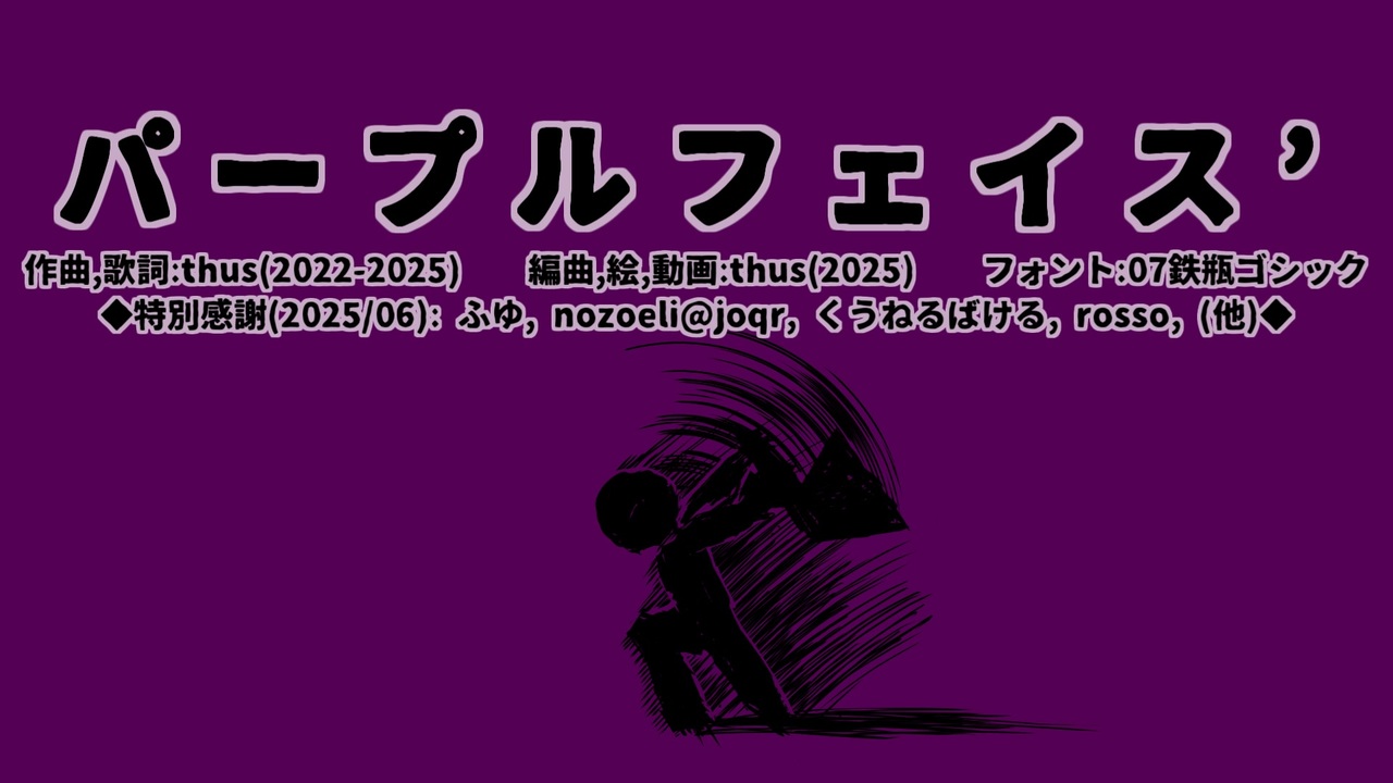 ◆「ボカロパンク投稿祭2025」出展作品です<br>(詳細:<a href="https://twipla.jp/events/646143" target="_blank" rel="noopener nofollow">https://twipla.jp/events/646143</a> )<br>・開催日時:2025/08/09<br>・主催:*yuuka(<a href="https://www.nicovideo.jp/user/46547596" target="_blank" rel="noopener">user/46547596</a> )<br>―<br><br> 死ねよ、良い加減。(カラオケ:<a href="https://www.nicovideo.jp/watch/sm45235995" class="watch">sm45235995</a> )<br> パンクが分からなさ過ぎてすごおい苛々し乍ら作りました。<br> パープルフェイスが未だ続くとは思わなかったって? 私も、この方向に広がるとは思いませんでした。でも此はどうも思っていたパープルフェイスとは違うパープルフェイスだったのでパープルフェイスになりました。そうだろう?<br><br> 先日、天卯ととり(鳥のはこにわ。)さん(<a href="https://x.com/torino_hakoniwa" target="_blank" rel="noopener nofollow">https://x.com/torino_hakoniwa</a> )がネットプリントをなさっていてですね。<br> 私はこういうのには元来余り興味が無かったのですが、何故か今回は気になってですね。ネットプリント終了6時間前くらいに、何だかこの儘遣り過ごすと不思議と後悔する様な気がしまして。初音さんとテトさんの使用経歴がある私は、初音さんとテトさんの2ショットだけでも印刷しようかなぁ~…と思い、thusさんは近くのコンビニに行って印刷してきた訳です。2絵で1枚だったらしく、折角なのでその儘にする保存用と半分に切って持ち歩く用と同じ物を2枚印刷しました。その印刷された写真と絵の、手に取って初めて分かる迚も綺麗なこと…! コンビニを出て暫く步いた後で「やっぱり別2絵のもう1枚も印刷すれば良かった」と思い始め、この儘にしたら此は絶対後悔するぞと思い、再度行ってもう2枚印刷してきた訳です。そして大きさぴったりのハードクリアファイルを2つ買ってきて、印刷した物を裏表で楽しめる様に違う写真を入れて、其を2セット作りました。其を作曲ノートに入れると、たった其だけなのに、こう、何と言いますか、人生が一気に楽しくなった気がしました。<br> キャラクター写真を例えば手帳に挟み徐に時々見て楽しむ方が居る事は知っており其は良い事だと思っていましたが、自分にはきっと分からないなぁと恐らくどこか羨ましく思っていました。其が、成程こんな風に嬉しい物なのだなぁと、綺麗なクリアケースに入った繊細な写真絵を裏表にくるくるし乍ら、ちゃんと其に感動できる自分に喜び、人生の楽しみが1つ増えた気がしました。<br> 結局写真を切らずに同じ鑑賞ケースを2セット作ったので、片方は家の机に飾り、もう一つは持ち歩く作曲ノートの内側に差しています。此で万一持ち歩く方を紛失しても、家にあるので安心です。<br> 天卯さん、ありがとう。<br><br>2025/08/11 00:36:2,525再生<br>2025/08/19 10:56:1万再生<br /><br><br><br>====================<br>| 2026/01/04 21:00「インスペクタの自死未遂」:<a href="https://www.nicovideo.jp/watch/sm45800854" class="watch">sm45800854</a><br>| 投稿曲マイリスト:<a href="https://www.nicovideo.jp/mylist/57867175" target="_blank" rel="noopener">mylist/57867175</a><br>|――――――――――――――――――<br>| pixivFANBOX:<a href="https://thus.fanbox.cc/" target="_blank" rel="noopener nofollow">https://thus.fanbox.cc/</a><br>| アルバム等配信中:<a href="https://thus-library.blogspot.com/search/label/discography" target="_blank" rel="noopener nofollow">https://thus-library.blogspot.com/search/label/discography</a><br>| つなぐ(依頼・リクエスト):<a href="https://tsunagu.cloud/users/thus" target="_blank" rel="noopener nofollow">https://tsunagu.cloud/users/thus</a><br>|――――――――――――――――――<br>| YouTube:<a href="https://youtube.com/@thus" target="_blank" rel="noopener nofollow">https://youtube.com/@thus</a><br>| X:<a href="https://x.com/thus_submission" target="_blank" rel="noopener nofollow">https://x.com/thus_submission</a><br>| 他全リンク:<a href="https://lit.link/thus" target="_blank" rel="noopener nofollow">https://lit.link/thus</a><br>|――――――――――――――――――<br>| オフボーカル等:<a href="https://piapro.jp/thus_999discommunication" target="_blank" rel="noopener nofollow">https://piapro.jp/thus_999discommunication</a><br>| 楽曲/動画の二次利用に関して:<a href="https://bit.ly/3JRQQiZ" target="_blank" rel="noopener nofollow">https://bit.ly/3JRQQiZ</a><br><span style="color: #262626;">| </span><span style="color: #262626;"><strong>歌詞図書館(ふりがな有るよ!):</strong></span><a href="https://thus-library.blogspot.com/" target="_blank" rel="noopener nofollow">https://thus-library.blogspot.com/</a><br>====================