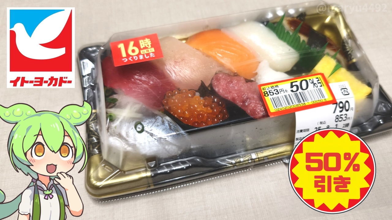 カラフルタウン岐阜には岐阜県で唯一のイトーヨーカドーが入っています。<br>映画を見に行ったついでに寄ってみることにしました。<br><br><br><br>【関連動画】<br>映画館で買った「デカいポップコーン(税込み1000円)」2025.08.03<br><a href="https://www.nicovideo.jp/watch/sm45247672" target="_blank" rel="noopener nofollow">https://www.nicovideo.jp/watch/sm45247672</a><br>おいしいもの総選挙2024で最高金賞受賞!食品スーパーバローの<br>「まぐろ握り鮨(1580円)」2024.09.29<br><a href="https://www.nicovideo.jp/watch/sm44155112" target="_blank" rel="noopener nofollow">https://www.nicovideo.jp/watch/sm44155112</a><br>ロピアの「魚萬握り4種盛(1200円)」<br><a href="https://www.nicovideo.jp/watch/sm44288979" target="_blank" rel="noopener nofollow">https://www.nicovideo.jp/watch/sm44288979</a><br><br>【参考】<br>イトーヨーカドー 柳津店<br><a href="https://stores.itoyokado.co.jp/208" target="_blank" rel="noopener nofollow">https://stores.itoyokado.co.jp/208</a><br>寿司ネタで人気の“えんがわ”とは?(マルハニチロ)<br><a href="https://umito.maruha-nichiro.co.jp/article173/" target="_blank" rel="noopener nofollow">https://umito.maruha-nichiro.co.jp/article173/</a><br><br>【使用した素材】(※敬称略) <br>(合成音声)VOICEVOX/ずんだもん/四国めたん<br><a href="https://voicevox.hiroshiba.jp/" target="_blank" rel="noopener nofollow">https://voicevox.hiroshiba.jp/</a> <br>(立ち絵)坂本アヒル<br> <a href="https://seiga.nicovideo.jp/seiga/im10788496?track" target="_blank" rel="noopener nofollow">https://seiga.nicovideo.jp/seiga/im10788496?track</a><br>(楽曲)甘茶の音楽工房/「楽しい麦畑」「フルーツパフェ」「お城の舞踏会」<br><a href="https://amachamusic.chagasi.com/" target="_blank" rel="noopener nofollow">https://amachamusic.chagasi.com/</a>