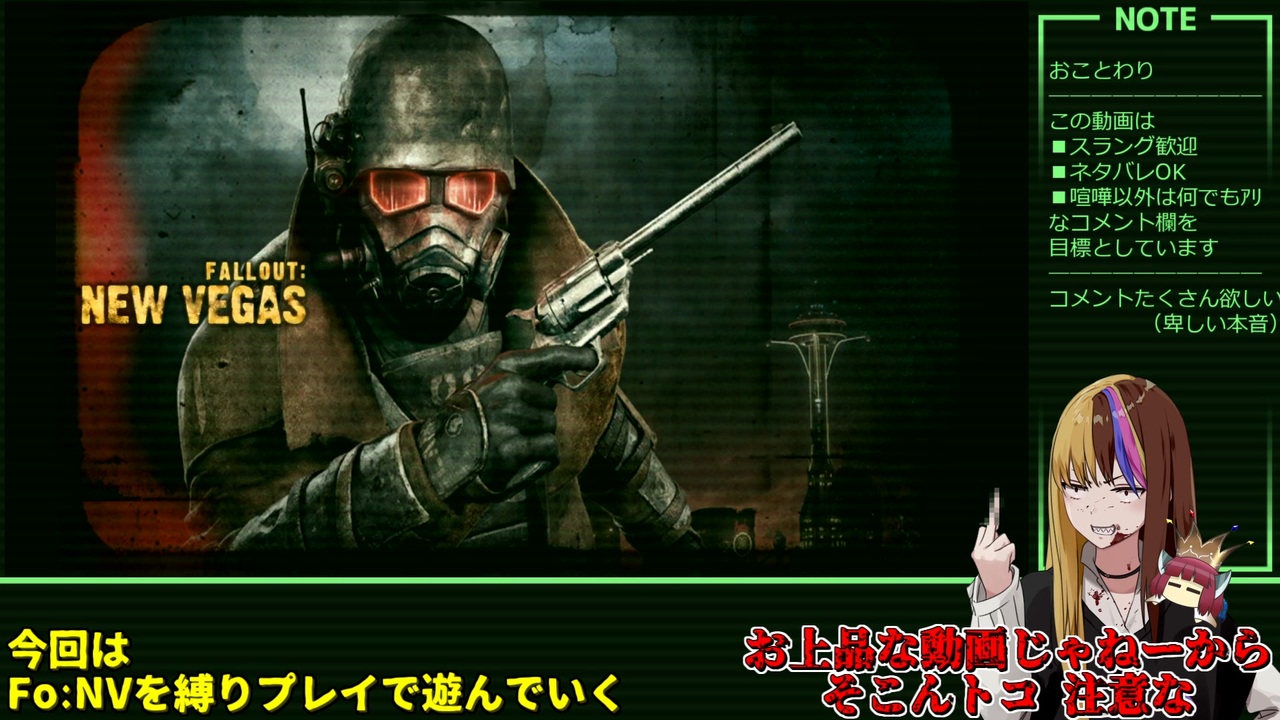ギャラきりがFallout:NewVegasを爆発物縛りで遊びます。<br><br>Part1 (この動画)<br>Part2 (<a href="https://www.nicovideo.jp/watch/sm45261950" class="watch">sm45261950</a>)<br>Part3 (<a href="https://www.nicovideo.jp/watch/sm45264610" class="watch">sm45264610</a>)<br>Part4 (<a href="https://www.nicovideo.jp/watch/sm45267874" class="watch">sm45267874</a>)<br><span style="color: #ff0000;">_________<br>***縛り内容***</span><br>武器 :Explosives 限定<br>防具 :DT/DR 0 限定<br>仲間 :コンパニオン 無し<br>難易度:Very Hard<br><span style="color: #00ff00;"><strong>__________<br>***クレジット***</strong></span><br>お借りした素材などは親作品をご確認下さい(文字数の都合)。<br>コモンズ/動画/静画などに登録されていないものなどを以下に記載します。<br><br>A.I.VOICE / 株式会社エーアイ 様<br>A.I.VOICE galaco / ヤマハ株式会社 様<br>VOICEROID+ 東北きりたんEX / 株式会社AHS 様<br>VOICEVOX / ヒホ 様<br>VOICEVOX:波音リツ / カノン 様<br>VOICEVOX:青山龍星 / VirVox Project 様<br><br>いらすとや 様<br>鉄瓶ゴシック/フロップデザイン 様<br>源界明朝/フロップデザイン 様<br /><span style="color: #0000ff;"><strong>_____________________<br>***以下共通説明文***</strong></span><br><br>ネタバレやスラングなど遠慮せず自由にコメントして頂ければ嬉しいです<br>進捗も たまに呟く Twitter <strong><u><a href="https://twitter.com/K_BubbleYesman" target="_blank" rel="noopener nofollow">https://twitter.com/K_BubbleYesman</a></u></strong>