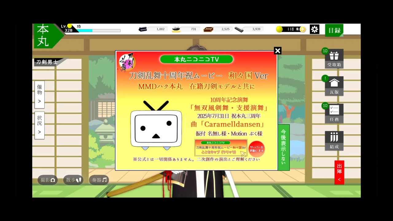 <span style="font-size: 16px;"><strong>刀剣乱舞十周年&刀ミュ十周年祝賀祭開催おめでとうございます!</strong></span><br>本当はルーキーズフェスタ最後の参加予定だったのですが、遅刻したなら本当のMMD本丸三周年記念に投稿することにしようとしたのに三周年の7月31日さえも遅刻しました(白目<br>でも、愛だけはがっつり込めました!!<br><br>MMD歴三年といううp主の成長と共に一緒に過ごしてきたMMD刀剣乱舞モデル達がわちゃわちゃしながら刀剣乱舞十周年お祝いしようと頑張る姿を少しでも楽しんでもらえれば幸いです。<br><br>【注意】この動画は、<span style="color: #ff0000; font-size: 16px;"><strong>何でも許せる方向き</strong></span>です。<br><br>※<strong>複数の同キャラ別式モデル</strong>が<strong>同時に登場</strong>します。<br>※二次創作/雰囲気動画。<br>※同キャラでも<strong>個体差があります</strong>。<br>※当本丸MMD本丸設定準拠の<strong>平和軸本丸の話</strong>です。シリアス軸本丸のシリアス要素は皆無です。<br>※お借りした全てのものへの不適切な発言や迷惑行為を禁止します<br><br>戦闘モショは全部刀剣乱舞無双を参考資料としてトレースもどきでの自力作成のため、カクカクです。<br>それでもなんとか十振分作成を完走したので、初心者MMDerの三年間の成長に優しい目で見て頂けると嬉しいです。<br><br>【2025/09/22 追記】<br>sao様、nohaha様、筑前国審神者様、ちとせ様、みくろ様、どんぐり様、紫陽花猫様、カイリ様、だめだ!様、スイカ様、あんこ様、白梟様、ララちゃんねる様、ねね・にゃんぱらり様、腹巻き様、綾弥浅葱様、じゅーいち様、wisteria様、hankichi84様、Ageha様、さな様、マロン様、日和見様、かなえ(hakka)様、まいむまいむ様、sura様、シアン様、ゆきっくま様、にゃーみぽん様、千日紅様、山城国審神者様、ぽんた様、mt_pan様、たちばな(橘 瑞来)様、テケリ・リ様、ちゃむ(Mu)様、ぶたぬき【極】様、ゴリラ国様、るか様、もがみ様、oage様<br><br>動画広告ありがとうございます!<br>またコメントやいいねをくださった皆様もありがとうございます、励みになります!<br /><strong>※転載禁止/Reproduction is prohibited./禁止私自转载<br>※AI学習禁止</strong><br>