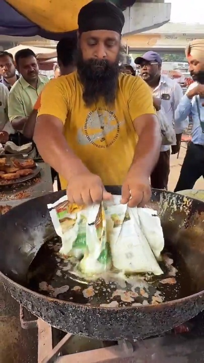 ホモと見るプラスチックの袋ごと油で揚げるインドの屋台