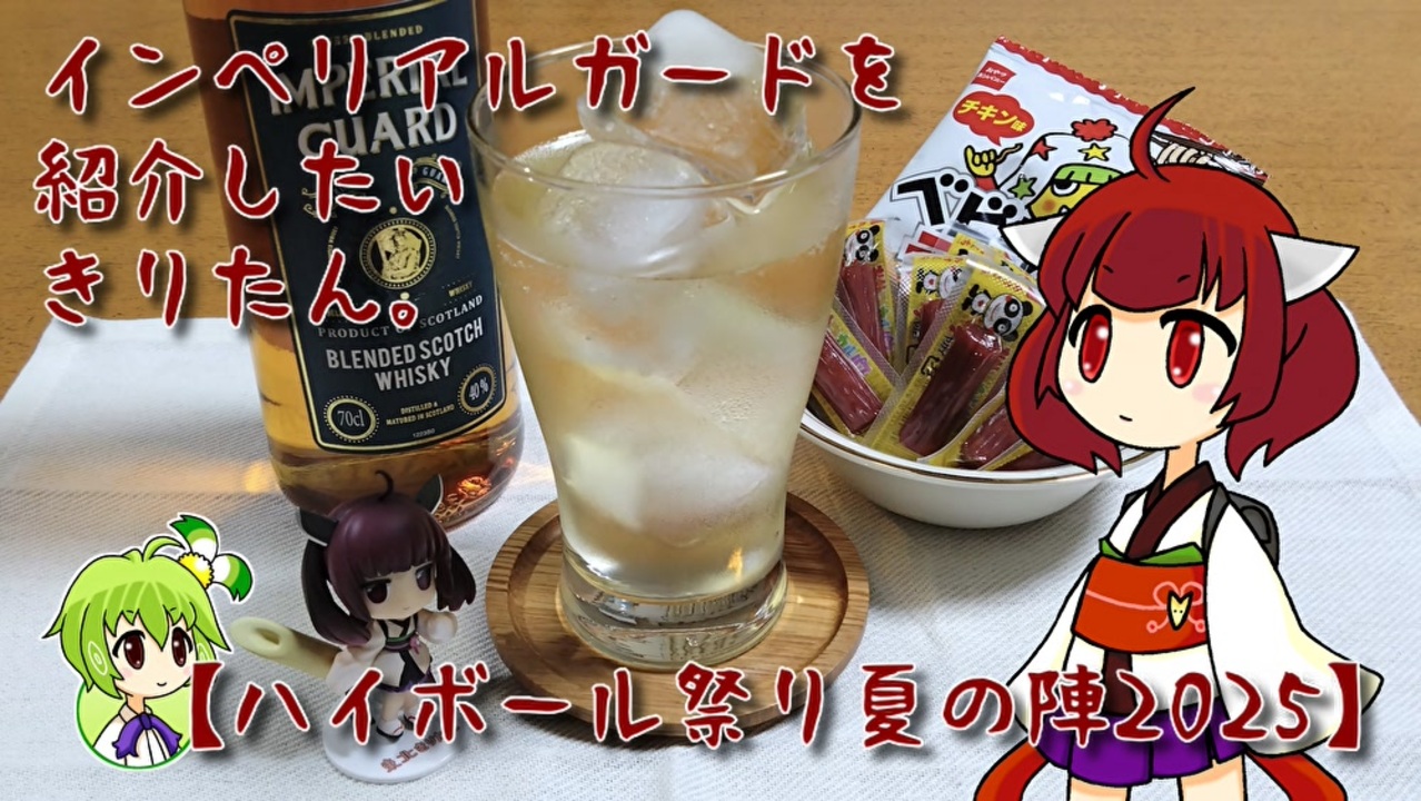 本動画は、蛸責屋烏賊狗斎様主催のハイボール祭り夏の陣2025に参加しています。<br>ハイボール祭り夏の陣2025の告知動画→<a href="https://www.nicovideo.jp/watch/sm45043250" class="watch">sm45043250</a><br>前回のハイボール祭り夏の陣2024(ジェムソンを紹介したいきりたん。)→<a href="https://www.nicovideo.jp/watch/sm44069910" class="watch">sm44069910</a><br><br>はい、はい。<br><br>「華やかな香りはテンプテーション」「流し斬りが完全に入ったキレのある後口」「千円どころか三十万クラウンの価値」みたいな感想にしようかと思いましたが、何一つ伝わりそうにないのでボツになりました。<br><br>[レシピ]<br>インペリアルガード :30ml<br>炭酸水 :120ml<br>氷 :適量<br><br>今回は他の動画投稿企画にも参加しておりますので、よろしければそちらもご覧ください。<br><br>とり料理祭2025夏はこちら→<a href="https://www.nicovideo.jp/watch/sm45267114" class="watch">sm45267114</a><br>ST発酵食品祭2025はこちら→<a href="https://www.nicovideo.jp/watch/sm45267118" class="watch">sm45267118</a>