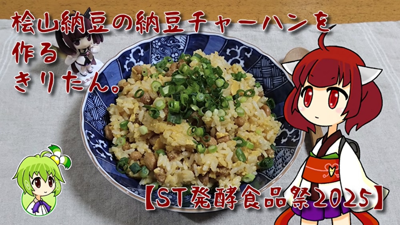 本動画は、カートン箱様主催のST発酵食品祭2025に参加しています。<br>ST発酵食品祭2025の告知動画→<a href="https://www.nicovideo.jp/watch/sm45141112" class="watch">sm45141112</a><br><br>ねぎさんことねぎー菜ちゃんは秋田県能代市のご当地キャラクターなので、思い出したように地元の特産品を紹介していくのです。<br>ちなみに能代市の桧山地区では、北限のお茶としても知られる檜山茶の栽培も行われていますので、機会があればいずれそちらも動画で取り上げたいですね。<br><br>[レシピ]<br>ご飯 :150g<br>桧山納豆 :40g<br>ごま油 :大さじ1g<br>めんつゆ :少々<br>鶏がらスープの素 :小さじ1<br>醤油 :小さじ1<br>塩 :少々<br>コショウ :少々<br><br>今回は他の動画投稿企画にも参加しておりますので、よろしければそちらもご覧ください。<br><br>ハイボール祭り夏の陣2025はこちら→<a href="https://www.nicovideo.jp/watch/sm45267111" class="watch">sm45267111</a><br>とり料理祭2025夏はこちら→<a href="https://www.nicovideo.jp/watch/sm45267114" class="watch">sm45267114</a><br><br>※きりたんのレンジでチン! は、特記がない限り全て600ワットです。<br><br>こちらのレシピを参考にさせて頂きました↓<br><a href="https://x.com/syunkon0507/status/1026260909461630976" target="_blank" rel="noopener nofollow">https://x.com/syunkon0507/status/1026260909461630976</a><br><br>桧山納豆のホームページはこちら↓<br><a href="http://www.hiyama710.com/" target="_blank" rel="noopener nofollow">http://www.hiyama710.com/</a>
