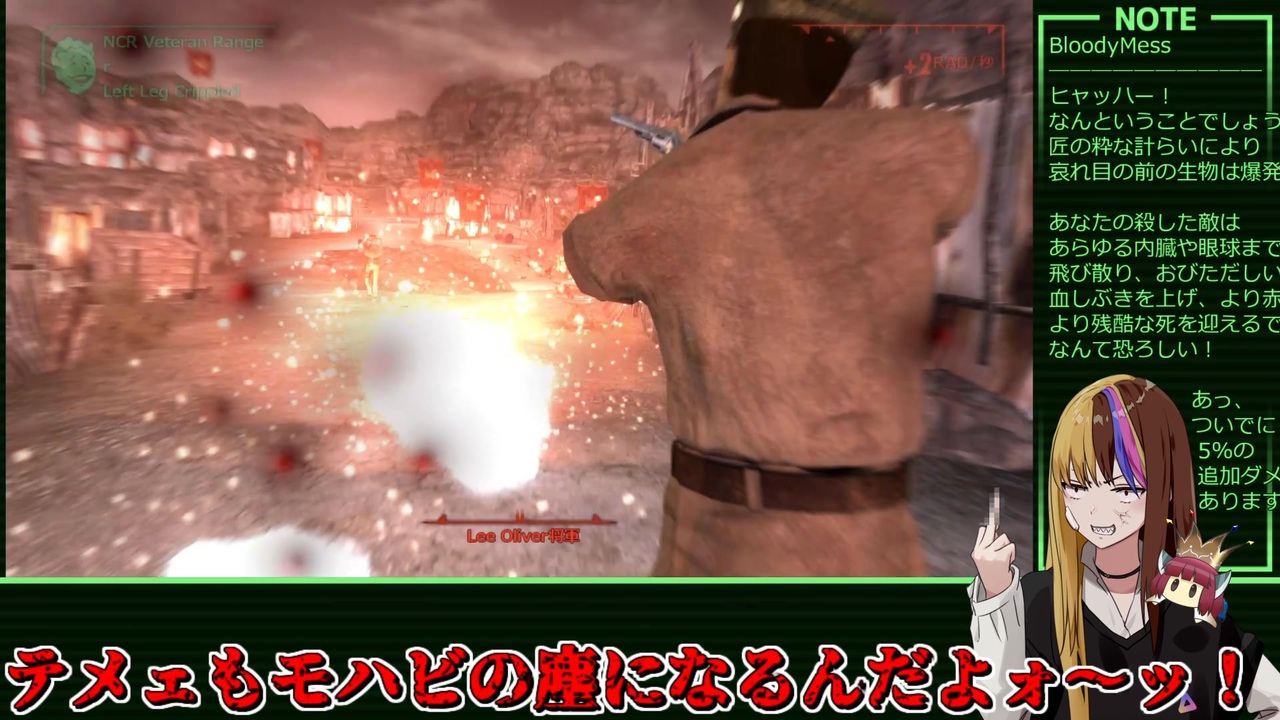 ギャラきりがFallout:NewVegasを爆発物縛りで遊びます。(最終回)<br><br>Part1 (<a href="https://www.nicovideo.jp/watch/sm45258556" class="watch">sm45258556</a>)<br>Part2 (<a href="https://www.nicovideo.jp/watch/sm45261950" class="watch">sm45261950</a>)<br>Part3 (<a href="https://www.nicovideo.jp/watch/sm45264610" class="watch">sm45264610</a>)<br>Part4 (この動画)<br><span style="color: #ff0000;"><strong>_________<br>***縛り内容***</strong></span><br>武器 :Explosives 限定<br>防具 :DT/DR 0 限定<br>仲間 :コンパニオン 無し<br>難易度:Very Hard<br><span style="color: #00ff00;"><strong>__________<br>***クレジット***</strong></span><br>お借りした素材などは親作品をご確認下さい(文字数の都合)。<br>コモンズ/動画/静画などに登録されていないものなどを以下に記載します。<br><br>A.I.VOICE / 株式会社エーアイ 様<br>A.I.VOICE galaco / ヤマハ株式会社 様<br>VOICEROID+ 東北きりたんEX / 株式会社AHS 様<br><br>いらすとや 様<br>鉄瓶ゴシック/フロップデザイン 様<br>源界明朝/フロップデザイン 様<br /><span style="color: #0000ff;"><strong>_____________________<br>***以下共通説明文***</strong></span><br><br>ネタバレやスラングなど遠慮せず自由にコメントして頂ければ嬉しいです<br>進捗も たまに呟く Twitter <strong><u><a href="https://twitter.com/K_BubbleYesman" target="_blank" rel="noopener nofollow">https://twitter.com/K_BubbleYesman</a></u></strong>