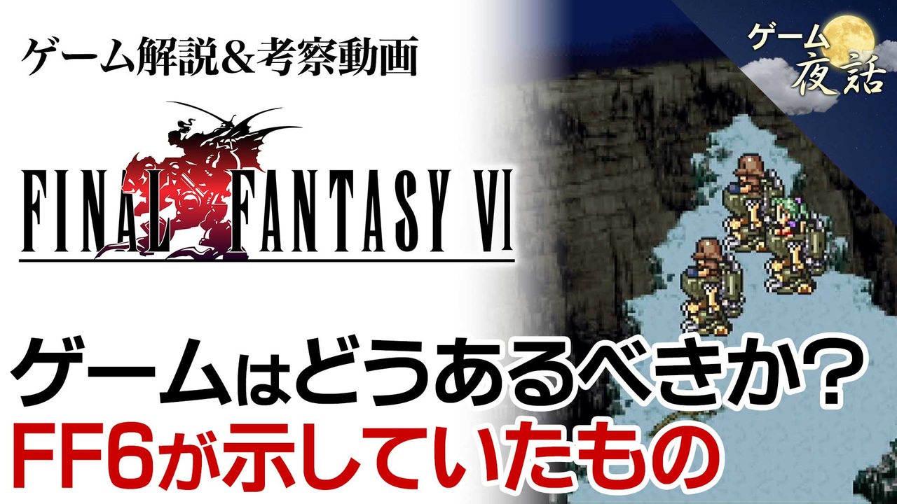 前回の動画にギフト・ニコニ広告して下さった方、ありがとうございました。<br>原則、「前編」「後編」合わせて毎回約30分を予定しています。<br><br>▼ゲーム夜話マイリスト<br><a href="https://www.nicovideo.jp/mylist/56973971" target="_blank" rel="noopener nofollow">https://www.nicovideo.jp/mylist/56973971</a><br><br>🔽<strong>第224回「ファイナルファンタジーⅥ」</strong><br>今回は、スーパーファミコンソフト「FF6」を通じて、<br>ゲーム魅力について考えてみました。<br><br>✅<strong>関連動画</strong><br>🔽「ファイナルファンタジー5」の魅力を解説<br><a href="https://www.nicovideo.jp/watch/sm44236941" class="watch">sm44236941</a><br><br>🔽「ファイナルファンタジー4」<br>前編:<a href="https://www.nicovideo.jp/watch/sm43372084" class="watch">sm43372084</a><br>中編:<a href="https://www.nicovideo.jp/watch/sm41641653" class="watch">sm41641653</a><br>後編:<a href="https://www.nicovideo.jp/watch/sm41645988" class="watch">sm41645988</a><br><br>🔽「ファイナルファンタジー7」<br>前編:<a href="https://www.nicovideo.jp/watch/sm36517304" class="watch">sm36517304</a><br>中編:<a href="https://www.nicovideo.jp/watch/sm36548832" class="watch">sm36548832</a><br>後編:<a href="https://www.nicovideo.jp/watch/sm36569558" class="watch">sm36569558</a><br><br>🔽「植松伸夫さんとFFシリーズの音楽」<br>前編:<a href="https://www.nicovideo.jp/watch/sm43512471" class="watch">sm43512471</a><br>後編:<a href="https://www.nicovideo.jp/watch/sm43532609" class="watch">sm43532609</a><br><br>🔽「吉田プロデューサーとFF14の再建」<br>前編:<a href="https://www.nicovideo.jp/watch/sm42382384" class="watch">sm42382384</a><br>中編:<a href="https://www.nicovideo.jp/watch/sm42412756" class="watch">sm42412756</a><br>後編:<a href="https://www.nicovideo.jp/watch/sm42452361" class="watch">sm42452361</a><br><br>■ゲーム夜話「X(旧:ツイッター」<a href="https://twitter.com/gameyawa" target="_blank" rel="noopener nofollow">https://twitter.com/gameyawa</a><br><br>© SQUARE ENIX<br>LOGO ILLUSTRATION:© YOSHITAKA AMANO<br>「記載されている会社名・製品名・システム名などは、各社の商標、または登録商標です。」
