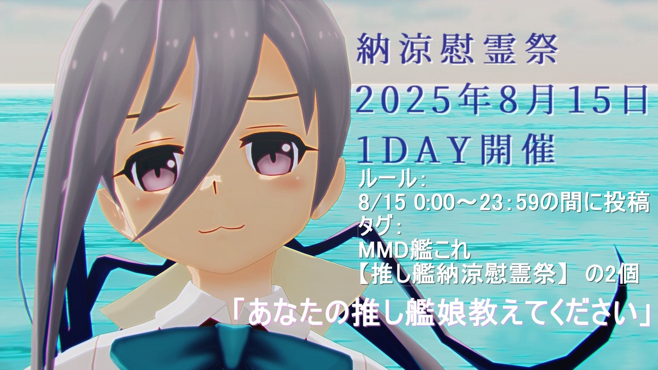 こんにちは、ねこまんまです。<br>終戦記念日にあわせて初イベント企画させて<br>いただきます。<br><br>もしよろしければ動画でも静画でもいいので<br>参加してもらえると嬉しいです。<br><br>※お盆休みで忙しいのは重々承知の上、お声を<br>かけさせていただいております。<br><br>ボカコレはボーカロイドのMMDモデルでないと参加できなくて<br>ランキング形式のイベントに艦これは参加できなかった<br>ので疑似的にランキングバトルができればいいかなと<br>おもいました。<br><br>皆様の愛のこもった艦これ動画おまちしておりますm(__)m<br>※過去作リメイクも可!<br><br><納涼慰霊祭><br>2025年8月15日<br>1DAY開催<br>8月15日23時台が最終ランキングとします!<br><br>ルール:<br>8/15 0:00~23:59の間に投稿<br>ジャンル:エンターテインメント<br>タグ:<br>MMD艦これ <br>【推し艦納涼慰霊祭】 <br><br>の2個コピペ推奨<br>※ランキングに参加したくない方は8/16まで<br>「MMD艦これ」タグを入れないでください。<br>【推し艦納涼慰霊祭】のみにしてください。<br>※過去作リメイクも可!<br><br>静画も同じタグで参加OK<br>※ランキングはありません。<br><br>納涼慰霊祭なので<br>注意事項:<br>①楽しく参加しましょう<br>②誹謗中傷コメントダメです。<br>③ランキングは上下をつけるものではありません。<br>④紳士は健全と思える程度にお願いします。<br>※局部ローアングル・きわどい水着は控えましょう。<br>※パンチラが多いとデバイス制限がかかると思われ。。。<br><br>-Credits-<br>全ての制作者様に感謝いたします。<br><br>■楽曲<br>柊マグネタイト様<br>アンテナ39 / 柊マグネタイト feat.初音ミク<br><a href="https://www.nicovideo.jp/watch/sm43936125" class="watch">sm43936125</a><br><br>■振付<br>かずは様<br>【かずは】アンテナ39 / 踊ってみた【オリジナル振付】<br><a href="https://www.nicovideo.jp/watch/sm44736914" class="watch">sm44736914</a><br><br>モーション・カメラ・表情:粉ふきスティック様 <a href="https://www.nicovideo.jp/watch/sm45193510" class="watch">sm45193510</a><br><br>model: へな羊様 清霜 <a href="https://3d.nicovideo.jp/works/td28676" target="_blank" rel="noopener">td28676</a><br><br>ステージ:怪獣対若大将P様 「柔らかな雲の午後」<a href="https://seiga.nicovideo.jp/seiga/im6519037" target="_blank" rel="noopener">im6519037</a><br><br>effect:サンドマン様 物理ベースシェーダsdPBR Ver. 4.80 <a href="https://www.nicovideo.jp/watch/sm43948524" class="watch">sm43948524</a> <br>ビームマンP様 水面エフェクトver5.0 <a href="https://www.nicovideo.jp/watch/sm21437138" class="watch">sm21437138</a><br><br>(敬称略・順不同)<br><br>#艦これ<br>#納涼慰霊祭<br>#MMD