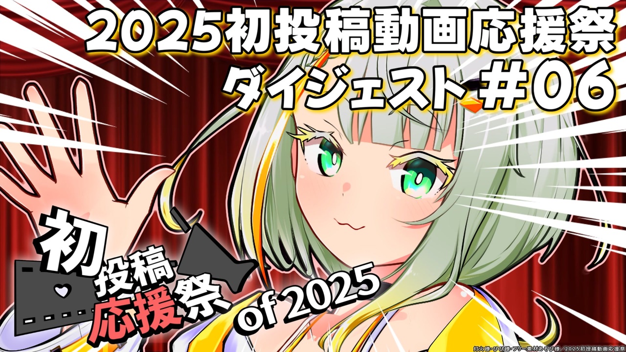 ※2025初投稿動画祭・応援祭はいずれも終了しました。<br>※ダイジェストの一覧 <a href="https://www.nicovideo.jp/user/9061662/mylist/78427843" target="_blank" rel="noopener nofollow">https://www.nicovideo.jp/user/9061662/mylist/78427843</a><br><br>2025初投稿動画応援祭主催公式によるダイジェスト動画の6回目となります。<br><br>■概要動画 <a href="https://www.nicovideo.jp/watch/sm44936211" class="watch">sm44936211</a><br>■詳細 <a href="https://note.com/yukun1007/n/nd3237b9b3898" target="_blank" rel="noopener nofollow">https://note.com/yukun1007/n/nd3237b9b3898</a><br><br>初投稿動画祭の情報とともに、<br>今回紹介致しました作品へのリンクをご用意しました!<br>是非とも、応援の全編もご覧頂けますと嬉しいです!<br><br><br>■ご紹介作品<br>マスターが初投稿する時<br>作品製作:つむぎ饅頭さん(<a href="https://www.nicovideo.jp/watch/sm45163883" class="watch">sm45163883</a>)<br><br>初投稿動画祭を機に動画投稿を始めてほしい九州そらASMR<br>作品製作:ぼあさん(<a href="https://www.nicovideo.jp/watch/sm45163095" class="watch">sm45163095</a>)<br><br>動画作成のコツ、真似るは学ぶだ!!<br>作品製作:すもびさん(<a href="https://www.nicovideo.jp/watch/sm45077229" class="watch">sm45077229</a>)<br><br>まずはハードルを下げてみませんか?<br>作品製作:サユズキさん(<a href="https://www.nicovideo.jp/watch/sm45169470" class="watch">sm45169470</a>)<br><br>動画投稿は、成長コンテンツである!……らしいです?<br>作品製作:ユキヒナさん(<a href="https://www.nicovideo.jp/watch/sm45163573" class="watch">sm45163573</a>)<br><br>殴り合おうぜ!!!!<br>作品製作:ただのモブさん(<a href="https://www.nicovideo.jp/watch/sm45164765" class="watch">sm45164765</a>)<br><br>カメラ制御を使った画面の動かし方<br>作品製作:ネクラマンサー焔さん(<a href="https://www.nicovideo.jp/watch/sm45154081" class="watch">sm45154081</a>)<br><br>ゆかりさん、動画投稿の楽しさと継続的に続ける秘訣を語る<br>作品製作:KisAragiさん(<a href="https://www.nicovideo.jp/watch/sm45175961" class="watch">sm45175961</a>)<br><br>■お願いごと<br>動画の内容に不備などがございましたら、公開後20時間前後以内に主催にご連絡ください。<br>(エンコード時間を鑑み、ギリギリでご連絡時の対応は難しいです…)<br><br>■その他<br>こちらの動画概要欄をご確認ください( <a href="https://www.nicovideo.jp/watch/sm45208656" class="watch">sm45208656</a> ) <br>全作品リスト( <a href="https://www.nicovideo.jp/user/57732881/mylist/78203288" target="_blank" rel="noopener nofollow">https://www.nicovideo.jp/user/57732881/mylist/78203288</a> )<br><br />--------------------<br>いつもどおりのぐっちーです。2023初投稿動画組。<br><br>■連絡先等: <a href="https://lit.link/gtzosns" target="_blank" rel="noopener nofollow">https://lit.link/gtzosns</a><br>■こいつ誰? <a href="https://dic.nicovideo.jp/u/9061662" target="_blank" rel="noopener nofollow">https://dic.nicovideo.jp/u/9061662</a><br><br>■2025初投稿動画応援祭まとめ <a href="https://docs.google.com/spreadsheets/d/1rqA0y3wEtagEH9YL5ug_gyD0y58WOXGrXpWCHHxhp8g" target="_blank" rel="noopener nofollow">https://docs.google.com/spreadsheets/d/1rqA0y3wEtagEH9YL5ug_gyD0y58WOXGrXpWCHHxhp8g</a><br><br>※アイコンは悠香さん、Thanks!