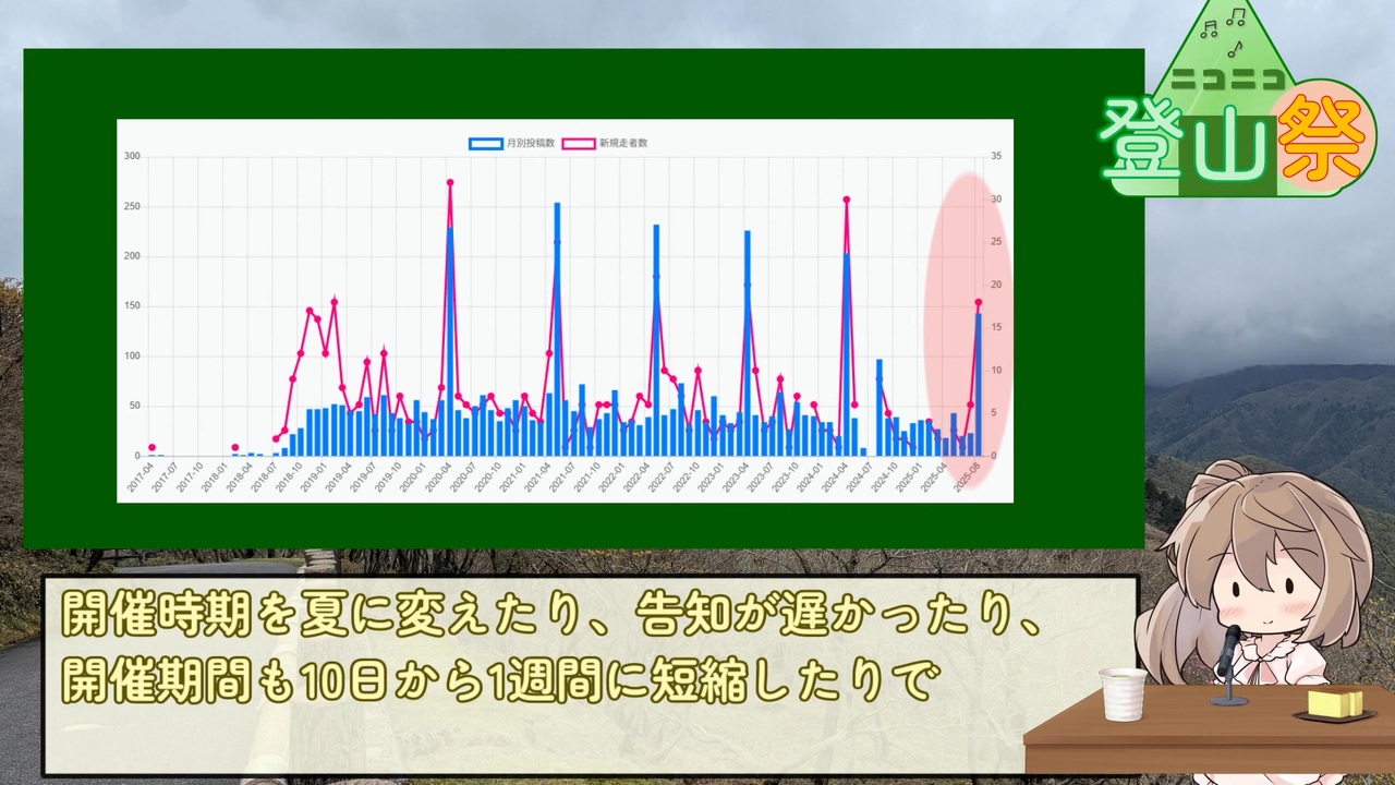 ニコニコ登山祭、閉幕です。<br>皆様のご参加、誠にありがとうございました。<br>今回も大いに盛り上がりましてとても嬉しいです!<br><br><strong>・アンケートについて</strong><br>ただいま、参加動画に対するアンケートを受付ています(アンケート受付期間:2025年8月31日まで)<br>アンケートフォーム <a href="https://forms.gle/MNyPbjkfAnKBvSRr6" target="_blank" rel="noopener nofollow">https://forms.gle/MNyPbjkfAnKBvSRr6</a><br><br> アンケートにご回答いただいた内容を踏まえて、ニコニコ登山祭のまとめ動画を配信いたしますので、是非ふるってご回答ください! 登山祭動画を全て見ていなくても、琴線に触れた動画が何か一つでもあったのならアンケートに回答いただけると嬉しいです!<br><br><strong>・マイリスト登録式動画リコメンドについて</strong><br>ニコニコ登山祭参加作品で気に入った作品はありましたか?<br>今回のニコニコ登山祭では、「マイリスト登録式動画リコメンド」を行いたいと思います!<br><br>方法は以下の通り<br> ① ニコニコ動画でオススメの登山祭動画を<strong>"マイリスト登録"</strong>する<br> ② X(旧Twitter) にて #ニコニコ登山祭 のタグを付けて、<strong>"マイリストのURLを公開"</strong>する<br>前述のアンケートの票に追加する形で計上を行います! どうぞふるってご参加ください!<br><br><strong>・参加動画マイリスト</strong><br> <a href="https://www.nicovideo.jp/mylist/78548212" target="_blank" rel="noopener">mylist/78548212</a><br> ※マイリストコメントはぼちぼち追記していきます<br><br><strong>・まとめ動画</strong><br> 今回は動画でライブ公開かな?(長い時間でも画質OKになったし・・・)<br> 是非皆さんいっしょに楽しみましょう!<br> 実施予定日:10月予定<br><br><strong>・主催(瓢箪屋)のTwitter</strong><br> <a href="https://twitter.com/hyotan_ya" target="_blank" rel="noopener nofollow">https://twitter.com/hyotan_ya</a>