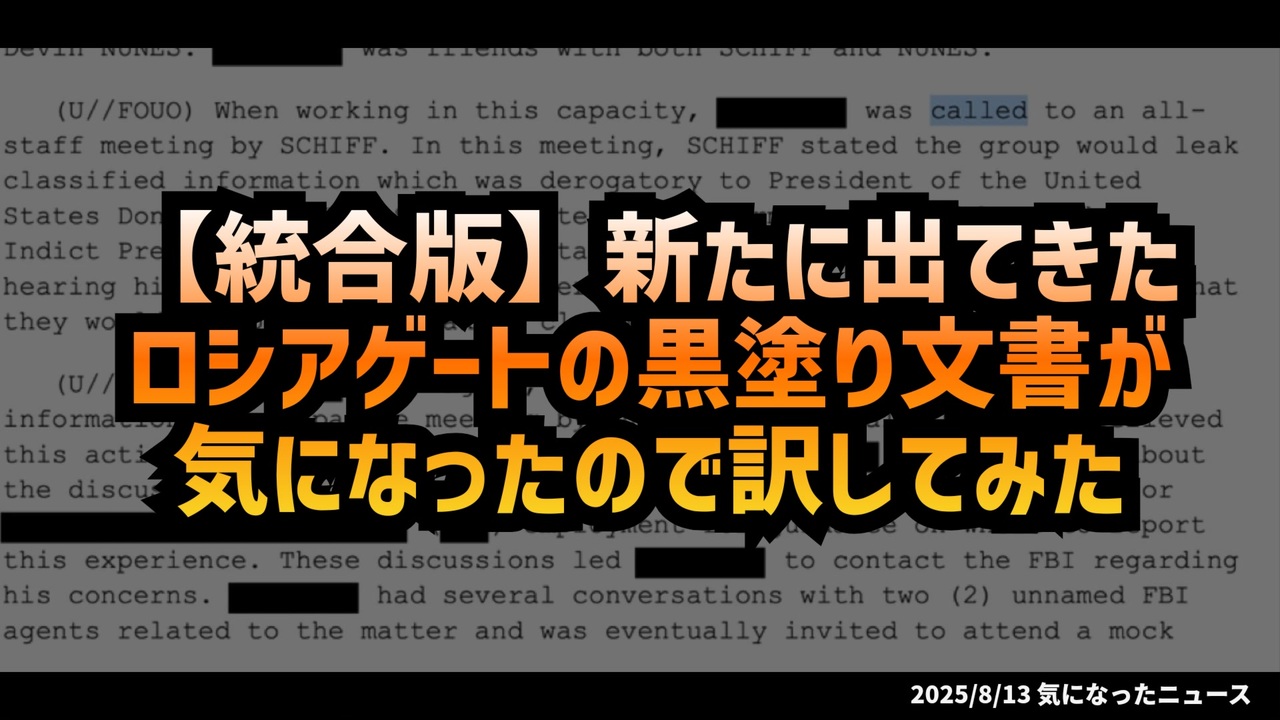 【①+②統合版】◆新たに出てきたロシアゲートの黒塗り文書が気になったので訳してみた◆新たに出てきたロシアゲートの黒塗り文書が気になったので訳してみた<br><br>アダム・シフ議員は、ヒラリー・クリントンが大統領になればCIA長官に任命されるはずだったが、計画が崩れ、報復としてトランプ大統領とフリン将軍を標的に「トランプ・ロシアゲート疑惑」を推進。新公開FBI文書で、シフが機密情報を集めメディアに漏らすよう指示していたことが判明。内部告発者がFBIに証言し、違法行為を報告。<br>①<a href="https://x.com/RealSLokhova/status/1955086320327377004?t=QZb6SQ1ATTvQAdcuBJ6HwA&s=19" target="_blank" rel="noopener nofollow">https://x.com/RealSLokhova/status/1955086320327377004?t=QZb6SQ1ATTvQAdcuBJ6HwA&s=19</a><br>②<a href="https://x.com/ElectionWiz/status/1955080252671070575?t=x0fYXbGbj_FyhlSa5Mpr8A&s=19" target="_blank" rel="noopener nofollow">https://x.com/ElectionWiz/status/1955080252671070575?t=x0fYXbGbj_FyhlSa5Mpr8A&s=19</a><br><br>◆今回の台本<a href="https://keiichiro8140.hatenablog.com/entry/20250813333222111" target="_blank" rel="noopener nofollow">https://keiichiro8140.hatenablog.com/entry/20250813333222111</a><br><br>◆チャンネル登録よろしくお願いします<a href="https://youtube.com/@k16_888?si=1S8pLN1Tf9bGiJyV" target="_blank" rel="noopener nofollow">https://youtube.com/@k16_888?si=1S8pLN1Tf9bGiJyV</a><br><br>◆もしも(BAN)の時のためのマイリンク集<a href="https://lit.link/K16_888" target="_blank" rel="noopener nofollow">https://lit.link/K16_888</a><br><br>気になったニュース 2025/8/13<br><br><br />著作権、肖像権に配慮して作成しております。<br><br>◆気になったニュースの台本!?<br>メモ代わりに作った台本をそのままあげてます<br><a href="https://keiichiro8140.hatenablog.com/." target="_blank" rel="noopener nofollow">https://keiichiro8140.hatenablog.com/.</a><br><br><br>ここからはシリーズ紹介<br><br><br>◆ ワクチン解毒・デトックス<br><a href="https://x.gd/fZweg" target="_blank" rel="noopener nofollow">https://x.gd/fZweg</a><br><br>◆ウイリアム・マキス博士のがん治療(イベルメクチン・フェンベンダゾール等)<br><a href="https://x.gd/AtFYS" target="_blank" rel="noopener nofollow">https://x.gd/AtFYS</a><br><br>◆予防接種健康被害救済制度<br><a href="https://x.gd/0xK9x" target="_blank" rel="noopener nofollow">https://x.gd/0xK9x</a><br><br>◆気になったニュース #1501~<br><br>◆ 【ショートver】気になったニュース<br><a href="https://x.gd/7MxXC" target="_blank" rel="noopener nofollow">https://x.gd/7MxXC</a><br><br>◆ 気になったニュース #1001~<br><a href="https://x.gd/Lp8gv" target="_blank" rel="noopener nofollow">https://x.gd/Lp8gv</a><br><br>◆ 気になったニュース #501~<br><a href="https://x.gd/EmbS4" target="_blank" rel="noopener nofollow">https://x.gd/EmbS4</a><br><br>◆ 気になったニュース #1~#500<br><a href="https://x.gd/uPhNb" target="_blank" rel="noopener nofollow">https://x.gd/uPhNb</a><br><br>◆ X(旧Twitter)・テレグラムで気になった情報<br><a href="https://x.gd/YG6FT" target="_blank" rel="noopener nofollow">https://x.gd/YG6FT</a><br><br>◆ 日比谷5万人パレードデ⚪生放送アーカイブ動画<br><a href="https://x.gd/3CHJv" target="_blank" rel="noopener nofollow">https://x.gd/3CHJv</a><br><br>◆日比谷5万人パレード⚪モのマイリスト作ってみました<br><a href="https://nico.ms/mylist/76828848?ref=sp_other" target="_blank" rel="noopener nofollow">https://nico.ms/mylist/76828848?ref=sp_other</a><br><br>◆3.30 令和の百姓⚪⚪<br><a href="https://www.nicovideo.jp/series/511791?ref=garage_share_other" target="_blank" rel="noopener nofollow">https://www.nicovideo.jp/series/511791?ref=garage_share_other</a><br><br>◆ 及川幸久さんの【XNEWS】シリーズ<br><a href="https://x.gd/3k78K" target="_blank" rel="noopener nofollow">https://x.gd/3k78K</a><br><br>◆これまでの動画<a href="https://x.gd/sPXoJ" target="_blank" rel="noopener nofollow">https://x.gd/sPXoJ</a><br><br>◆もしも(BAN)の時のためのマイリンク集<a href="https://lit.link/K-16_News44" target="_blank" rel="noopener nofollow">https://lit.link/K-16_News44</a><br><br>