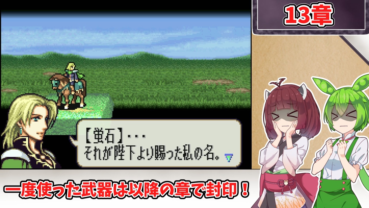 <span style="color: #85200c; font-size: 24px;"><strong><i>遂に帝国六将との直接対決!</i></strong></span><br><br><br><span style="font-size: 16px;"><strong>1:一度使用した武器種は、以降の章で使用する事を禁止する。<br>2:武器の使用の定義は『その武器を装備した状態で敵との戦闘が発生したタイミング』<br>または『その武器を売却したタイミング』<br>杖の場合は『対象に対して使用した時点(命中の可否は問わない)』とする。 </strong></span><br><span style="color: #ff0000; font-size: 16px;"><strong>※同盟軍、演出による戦闘イベントでは使用した判定にはならないこととする。</strong></span><span style="font-size: 16px;"><strong> <br>3:仲間候補のユニットを全員加入、生存させた状態でゲームをクリアする。<br>4:上級クラスのユニットは「武器を装備した状態」での戦闘を禁止する。<br>5:バグ技禁止</strong></span><br><br>この動画シリーズ【<a href="https://www.nicovideo.jp/series/516459" target="_blank" rel="noopener">series/516459</a>】<br>『トラ7』の同縛りプレイ【<a href="https://www.nicovideo.jp/series/482976" target="_blank" rel="noopener">series/482976</a>】<br>『烈火』の同縛りプレイ【<a href="https://www.nicovideo.jp/series/406473" target="_blank" rel="noopener">series/406473</a>】<br>『封印』の同縛りプレイ【<a href="https://www.nicovideo.jp/series/316824" target="_blank" rel="noopener">series/316824</a>】<br><br>前:【<a href="https://www.nicovideo.jp/watch/sm45262536" class="watch">sm45262536</a>】次:【<a href="https://www.nicovideo.jp/watch/sm45311939" class="watch">sm45311939</a>】<br><br><strong>使用したソフト</strong><br>VOICEROID+東北きりたんEX<br>VOICEROID+東北ずん子EX<br>VOICEROID2 東北イタコ<br>VOICEVOX:ずんだもん<br>VOICEPEAK:ずんだもん<br><strong>お借りした素材</strong><br>ニコニコモンズの皆様(コンテンツツリー参照)
