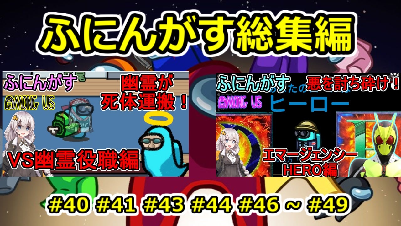 <a href="#" class="seekTime" data-seekTime="00:00" onclick="seekNicoPlayer('#00:00'); return false;">#00:00</a> #40 幽霊役職で死体を運搬せよ!:VS幽霊役職編<br><a href="#" class="seekTime" data-seekTime="02:54" onclick="seekNicoPlayer('#02:54'); return false;">#02:54</a> #41 死体を消滅させて通報させなくする!:死体消滅クラッカー編<br><a href="#" class="seekTime" data-seekTime="07:12" onclick="seekNicoPlayer('#07:12'); return false;">#07:12</a> #43 深海マップで起きた色々な事を動画にまとめたぜ!:海底のゴチャゴチャ編<br><a href="#" class="seekTime" data-seekTime="08:34" onclick="seekNicoPlayer('#08:34'); return false;">#08:34</a> #44 せっかくだから潜伏して牙を剝くぜ!:ステルスジャッカル編<br><a href="#" class="seekTime" data-seekTime="10:02" onclick="seekNicoPlayer('#10:02'); return false;">#10:02</a> #46 これだけ人がいるのに!?:ゴチャキル合い宇宙編<br><a href="#" class="seekTime" data-seekTime="16:52" onclick="seekNicoPlayer('#16:52'); return false;">#16:52</a> #47 シルんがす開演!?:ずんだもんVSあんこもん編<br><a href="#" class="seekTime" data-seekTime="25:31" onclick="seekNicoPlayer('#25:31'); return false;">#25:31</a> #48 トランザムは使うなよ!?:躍動するオーバーローダー編<br><a href="#" class="seekTime" data-seekTime="31:01" onclick="seekNicoPlayer('#31:01'); return false;">#31:01</a> #49 悪を討ち砕くぜ!エマージェンシー・HERO編<br><br>ボイロ・CeVIO実況者をメインとした宇宙人狼ゲーム「Among Us」の大規模コラボの「ふにんがす」<br>その凪尾視点の動画の総集編<br>#40 #41 #43 #44 #46 ~ #49 となっています <br>※#42 #45 および 一部シーンは都合によりカットしています 今回は特にカットシーンが多くて虫食い状態となってしまっていますが理由は元動画と比較したうえで察してください<br><br>YouTube高画質版:<a href="https://youtu.be/tgCPOFl4Vc8" target="_blank" rel="noopener nofollow">https://youtu.be/tgCPOFl4Vc8</a><br><br>超会議グッズ通販中!<br><a href="https://nagio-gta25252.booth.pm/" target="_blank" rel="noopener nofollow">https://nagio-gta25252.booth.pm/</a><br>ニコニコクリエイターサポート<br><a href="https://creator-support.nicovideo.jp/registration/2620730" target="_blank" rel="noopener nofollow">https://creator-support.nicovideo.jp/registration/2620730</a><br>ニコニコチャンネル<br><a href="https://ch.nicovideo.jp/nagio-gta?ref=pc_mypage_top" target="_blank" rel="noopener nofollow">https://ch.nicovideo.jp/nagio-gta?ref=pc_mypage_top</a><br>ニコニコパートナーパス<br><a href="https://nicoft.io/" target="_blank" rel="noopener nofollow">https://nicoft.io/</a><br>(↑いずれか加入でリスナー参加型専用ゲームサーバーにアクセスできるぞ!)<br><br>Twitter:<a href="https://twitter.com/naoreisen" target="_blank" rel="noopener nofollow">https://twitter.com/naoreisen</a><br> <br>前回 GTA5:カオス磯野モード:父親の奇行にドン引き編:<a href="https://www.nicovideo.jp/watch/sm45272497" class="watch">sm45272497</a><br>前回 ふにんがすAmongUs:重要な情報を見逃す編:<a href="https://www.nicovideo.jp/watch/sm45256372" class="watch">sm45256372</a><br>前回 パーティアニマルズ:イタズラ妨害狸編:<a href="https://www.nicovideo.jp/watch/sm45113701" class="watch">sm45113701</a><br>前回 GTA5手配度MAX:ガンダムジークアクス編:<a href="https://www.nicovideo.jp/watch/sm44705857" class="watch">sm44705857</a><br>前回 凪尾クラフト:トライアルチャンバー編:<a href="https://www.nicovideo.jp/watch/sm44573824" class="watch">sm44573824</a><br>前回 猫ミームブラック企業動画:<a href="https://www.nicovideo.jp/watch/sm43364794" class="watch">sm43364794</a><br>前回 GTA動画:KICK BACK PV再現:<a href="https://www.nicovideo.jp/watch/sm41527305" class="watch">sm41527305</a>