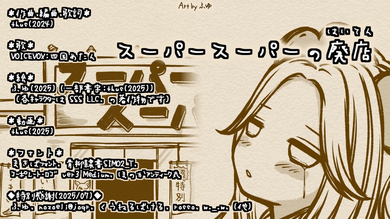 投稿者:thus[ザス]<br>動画のタイトル名読み:スーパースーパーノハイテン フィーチャリングシコクメタン オリジナルキョクノツモリ<br>―<br>歌:VOICEVOX:四国めたん<br>Art by ふゆ(Links:<a href="https://lit.link/fuyunoe" target="_blank" rel="noopener nofollow">https://lit.link/fuyunoe</a> )<br>※各キャラクターはSSS LLC.の著作物です(詳細:<a href="https://zunko.jp/guideline.html" target="_blank" rel="noopener nofollow">https://zunko.jp/guideline.html</a> )<br>―<br>◆「ボカコレ2025夏ex」出展作品です<br>(詳細(Detail):<a href="https://vocaloid-collection.jp/exhibition/" target="_blank" rel="noopener nofollow">https://vocaloid-collection.jp/exhibition/</a> )<br>・開催日時(Date):2025/8/(21 19:00 - 25 23:59)<br>・主催(Host):株式会社ドワンゴ (Link: <a href="https://dwango.co.jp/" target="_blank" rel="noopener nofollow">https://dwango.co.jp/</a> )<br>・投稿祭公式アカウント<br>―Tiktok:<a href="https://www.tiktok.com/@the_voca_colle" target="_blank" rel="noopener nofollow">https://www.tiktok.com/@the_voca_colle</a><br>―X:<a href="https://x.com/the_voca_colle" target="_blank" rel="noopener nofollow">https://x.com/the_voca_colle</a><br>―YouTube:<a href="https://www.youtube.com/@the_voca_colle" target="_blank" rel="noopener nofollow">https://www.youtube.com/@the_voca_colle</a><br>―――<br><br> 突然のさよなら。カラオケ:<a href="https://www.nicovideo.jp/watch/sm45289107" class="watch">sm45289107</a><br> ふゆさんとは、滅茶苦茶長い相談を逐次しながら絵を描いていただき、そして何度も見ていただきながら動画を作りました。凄い、ご負担を掛けたと思います…。それらを跋え、愈々公開できることを迚も楽しみにしながら、この文章を書いています。楽しみですね、ふゆさん。<br> ボカコレさんが新しくエキシビションという枠を作られたそうなので、早速今回は此方に出してみることにしました。こうして、のび太と北斗神拳奥義習得の修行が始まった訳です。「かかって来いやァ!」と勇ましい怒号を飛ばすドラえもん。<br> 話が逸れそうになりました。前回のボカコレは7000曲だったか8000曲だったか投稿されたらしいですね。凄い数になってきました。その8000曲くらいを同時に再生したら、鼓膜殺戮兵器が完成です。もはや騒音。騒音と言えば最近いつだったか、夜中にリズミカルな重低音が聞こえてきたのですが、ジャイウワァァンがリサイタルを開いていたそうです。15kmも離れているのに。誰も来なかったらしく、ウワァァンと泣いていました。ジャイウワァァンだけに。\ツクテーン/<br> 危ない、また話が逸れそうになった。否でも、もう文字数もなくなってきたからこれくらいにしましょうか。次回はケンシロウの潮干狩りでもお楽しみ下さい。<br><br>2025/09/01 07:21:2,525再生<br><br>―<br>上書修正:新聞日付、クレジット間違い<br /><br><br><br>====================<br>| 2026/01/04 21:00「インスペクタの自死未遂」:<a href="https://www.nicovideo.jp/watch/sm45800854" class="watch">sm45800854</a><br>| 投稿曲マイリスト:<a href="https://www.nicovideo.jp/mylist/57867175" target="_blank" rel="noopener">mylist/57867175</a><br>|――――――――――――――――――<br>| pixivFANBOX:<a href="https://thus.fanbox.cc/" target="_blank" rel="noopener nofollow">https://thus.fanbox.cc/</a><br>| アルバム等配信中:<a href="https://thus-library.blogspot.com/search/label/discography" target="_blank" rel="noopener nofollow">https://thus-library.blogspot.com/search/label/discography</a><br>| つなぐ(依頼・リクエスト):<a href="https://tsunagu.cloud/users/thus" target="_blank" rel="noopener nofollow">https://tsunagu.cloud/users/thus</a><br>|――――――――――――――――――<br>| YouTube:<a href="https://youtube.com/@thus" target="_blank" rel="noopener nofollow">https://youtube.com/@thus</a><br>| X:<a href="https://x.com/thus_submission" target="_blank" rel="noopener nofollow">https://x.com/thus_submission</a><br>| 他全リンク:<a href="https://lit.link/thus" target="_blank" rel="noopener nofollow">https://lit.link/thus</a><br>|――――――――――――――――――<br>| オフボーカル等:<a href="https://piapro.jp/thus_999discommunication" target="_blank" rel="noopener nofollow">https://piapro.jp/thus_999discommunication</a><br>| 楽曲/動画の二次利用に関して:<a href="https://bit.ly/3JRQQiZ" target="_blank" rel="noopener nofollow">https://bit.ly/3JRQQiZ</a><br><span style="color: #262626;">| </span><span style="color: #262626;"><strong>歌詞図書館(ふりがな有るよ!):</strong></span><a href="https://thus-library.blogspot.com/" target="_blank" rel="noopener nofollow">https://thus-library.blogspot.com/</a><br>====================<br><br><a target="_blank" href="https://qa.nicovideo.jp/faq/show/19424?site_domain=default" style="font-size: 13px;color: #657586; text-decoration: underline; line-height: 1.4">この動画は投稿者によって修正されました</a>