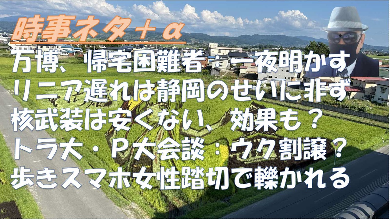 ◆政経プラットフォーム<br>トランプVSプーチン、そしてネタニヤフ首相が糸引く狡猾な駆け引きの行方? 宇山卓栄氏 #416<br><br>トランプ-プーチン会談でウクライナ領土譲渡が決まるか【及川幸久】<br><br>◆TTMつよし<br>【自民党の終焉】高市早苗vs橋下徹が勃発 田母神敏夫「自民は反日に乗っ取られている」<br><br>◆すずぽん<br>日経平均株価が2日連続で史上最高値更新!⇨で、国民の生活は?<br><br>◆和田秀樹<br>"逆老害"という新提案<br><br>SATORISM TV LIVE.196「悪意のない大暴言スペシャル!核武装しても無駄論!」<br><br>【続報】大阪メトロ中央線は午前5時25分に全線で運転再開 万博“帰宅困難者”はパビリオンで一夜 未就学児含む36人が救急搬送(14日午前5時半現在)<br><br>◆烏賀陽弘道<br>多くの人が大阪万博会場から帰れず、酷暑の下、苦しみながら徹夜しているのに、こういうヨイショ記事を流す日経新聞や、哀れ。<br><br>野口健さん、環境破壊が各地で問題化しているメガソーラーについて私見をつづる「特に外資は…閉鎖する際に大量の廃物が残されてしまう」<br><br>東京―大阪間のリニア開業は2060年? 工事遅延続々…「静岡悪者論」も今は昔、問題山積リニア開発の現在地<br><br>橋下氏 生TVで何度も謝罪→大阪民泊で外国人客の路上タバコ散乱、ゴミ騒音VTR見て蒼白「特区民泊推進した僕の責任です。申し訳ありません」<br><br>不死鳥・ムネオ氏が“石破おろし”に喝「裏金議員のケジメができていない」旧安倍派の幹部たちに「“党内改革”と言う資格があるか。黙っていてもらいたい」<br><br>参政党初鹿野議員への告訴受理 名誉毀損疑い、神奈川県警<br><br>•2025.8.14リチャード・コシミズチャンネル第91回<br>AM9:30 ~<br>•日本は、今も中国以上の大国だった。中国は粉飾大国。GDPも成長率も人口も失業率も全部嘘。日本は、世界が羨望する夢の国であり、さらに魅力ある国になる。日本人は日本の良さを知らない。<br><br>◆鳥集徹<br>日本人も団体でカメラを撮りまくる無遠慮さやアジア諸国へ買春旅行に行く男たちの醜さが批判された。<br>外国人を非難するにしても、そんな過去があったことは、同じ日本人として忘れてはならないと思う。<br><br>【甲子園】開星・野々村監督(73)「広陵問題」をバッサリ。匿名のSNSによるバッシングに「批判する者は名を名乗れ! 卑怯だ」<br><br>【シンママ】偽装離婚して貰える給付金額を検討する【現代の錬金術?】<br><br>【悲報】歩きスマホの女性、踏切の内側を外側と勘違して、電車に轢かれ死亡