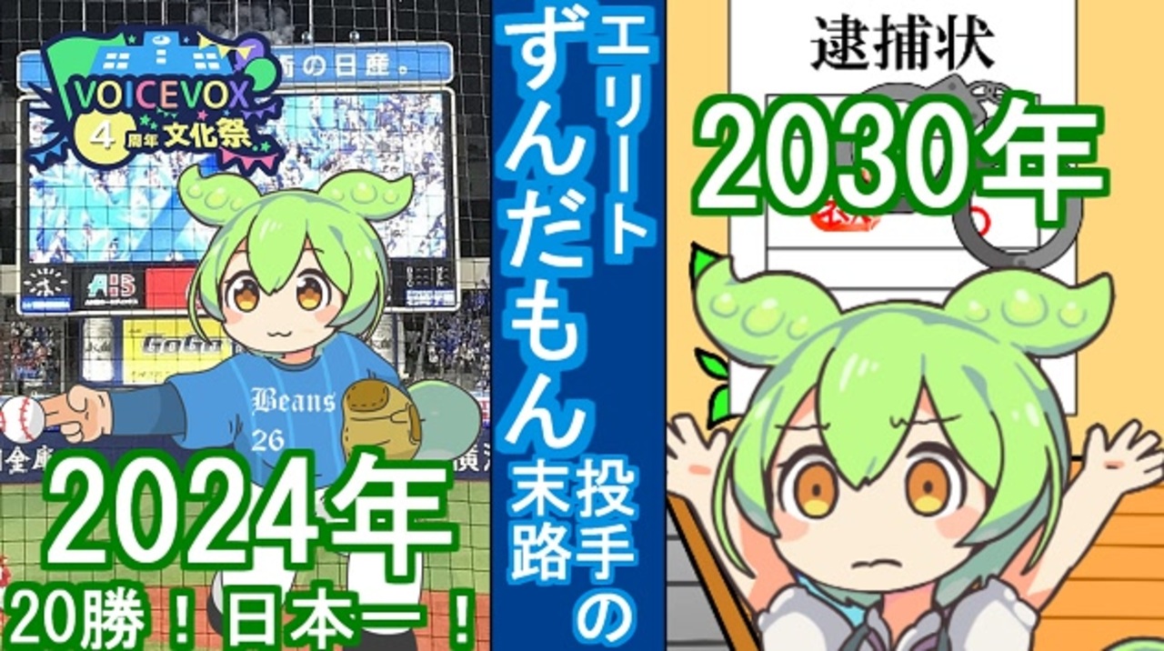 VOICEVOX4周年文化祭 第2弾は、<br>ずんだもん投手の末路を描いた、フィクション動画です。<br><span style="font-size: 10px;">※元ネタは、千葉ロッテマリーンズ強○○件です。<br>※「feat.小川博」とありますが、<br>登場人物、年代設定を大幅に改造しております。<br>ま、基本的にやってることは変わりませんがね。</span><br><br><span style="font-size: 18px;"><strong>どうやって<br>2024年の日本一胴上げ投手が、<br>2030年に不祥事を働いて<br>逮捕されたのか。<br>スーパーエースが堕ちて行く過程を、<br>お楽しみください。</strong></span><br><br><span style="font-size: 10px;">※この動画は、実在する出来事、事件には何一つ関係がありません。<br>※親作品は、動画の奥付に記載します。<br>※表示時間の関係上、親作品表記は一部省略しますが、親作品登録はしております。</span><br><br>この動画UP後の親作品記載漏れ<br>・投げられた女性…いらすとや様<br><br><a target="_blank" href="https://qa.nicovideo.jp/faq/show/19424?site_domain=default" style="font-size: 13px;color: #657586; text-decoration: underline; line-height: 1.4">この動画は投稿者によって修正されました</a>
