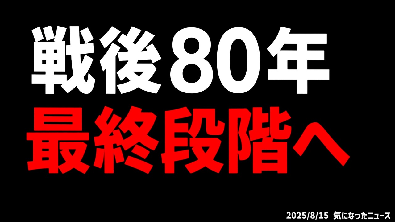 普段より長めで遅くなりました┏○))<br><br>◆戦後80年 最終段階へ<br><br>あらすじ/予告編 <br>日本は、静かな侵略の最終段階に突入しています。政治のハッキング、メディアの掌握、教育による刷り込み、価値観のすり替え、スマホによる思考停止という段階を経て、外国の影響が拡大し、国民の誇りが失われています。動画は、気づきと行動を促し、遅すぎる前に変えることを呼びかけます。<br><br><a href="https://x.com/oota3150/status/1954408677579919854?t=7Yxx1slnLMFUeWnwg34uUg&s=19" target="_blank" rel="noopener nofollow">https://x.com/oota3150/status/1954408677579919854?t=7Yxx1slnLMFUeWnwg34uUg&s=19</a><br><br>◆今回の台本<a href="https://keiichiro8140.hatenablog.com/entry/202508155552222" target="_blank" rel="noopener nofollow">https://keiichiro8140.hatenablog.com/entry/202508155552222</a><br><br>◆チャンネル登録よろしくお願いします<a href="https://youtube.com/@k16_888?si=1S8pLN1Tf9bGiJyV" target="_blank" rel="noopener nofollow">https://youtube.com/@k16_888?si=1S8pLN1Tf9bGiJyV</a><br><br>◆もしも(BAN)の時のためのマイリンク集<a href="https://lit.link/K16_888" target="_blank" rel="noopener nofollow">https://lit.link/K16_888</a><br><br>気になったニュース 2025/8/15<br><br />著作権、肖像権に配慮して作成しております。<br><br>◆気になったニュースの台本!?<br>メモ代わりに作った台本をそのままあげてます<br><a href="https://keiichiro8140.hatenablog.com/." target="_blank" rel="noopener nofollow">https://keiichiro8140.hatenablog.com/.</a><br><br><br>ここからはシリーズ紹介<br><br><br>◆ ワクチン解毒・デトックス<br><a href="https://x.gd/fZweg" target="_blank" rel="noopener nofollow">https://x.gd/fZweg</a><br><br>◆ウイリアム・マキス博士のがん治療(イベルメクチン・フェンベンダゾール等)<br><a href="https://x.gd/AtFYS" target="_blank" rel="noopener nofollow">https://x.gd/AtFYS</a><br><br>◆予防接種健康被害救済制度<br><a href="https://x.gd/0xK9x" target="_blank" rel="noopener nofollow">https://x.gd/0xK9x</a><br><br>◆気になったニュース #1501~<br><br>◆ 【ショートver】気になったニュース<br><a href="https://x.gd/7MxXC" target="_blank" rel="noopener nofollow">https://x.gd/7MxXC</a><br><br>◆ 気になったニュース #1001~<br><a href="https://x.gd/Lp8gv" target="_blank" rel="noopener nofollow">https://x.gd/Lp8gv</a><br><br>◆ 気になったニュース #501~<br><a href="https://x.gd/EmbS4" target="_blank" rel="noopener nofollow">https://x.gd/EmbS4</a><br><br>◆ 気になったニュース #1~#500<br><a href="https://x.gd/uPhNb" target="_blank" rel="noopener nofollow">https://x.gd/uPhNb</a><br><br>◆ X(旧Twitter)・テレグラムで気になった情報<br><a href="https://x.gd/YG6FT" target="_blank" rel="noopener nofollow">https://x.gd/YG6FT</a><br><br>◆ 日比谷5万人パレードデ⚪生放送アーカイブ動画<br><a href="https://x.gd/3CHJv" target="_blank" rel="noopener nofollow">https://x.gd/3CHJv</a><br><br>◆日比谷5万人パレード⚪モのマイリスト作ってみました<br><a href="https://nico.ms/mylist/76828848?ref=sp_other" target="_blank" rel="noopener nofollow">https://nico.ms/mylist/76828848?ref=sp_other</a><br><br>◆3.30 令和の百姓⚪⚪<br><a href="https://www.nicovideo.jp/series/511791?ref=garage_share_other" target="_blank" rel="noopener nofollow">https://www.nicovideo.jp/series/511791?ref=garage_share_other</a><br><br>◆ 及川幸久さんの【XNEWS】シリーズ<br><a href="https://x.gd/3k78K" target="_blank" rel="noopener nofollow">https://x.gd/3k78K</a><br><br>◆これまでの動画<a href="https://x.gd/sPXoJ" target="_blank" rel="noopener nofollow">https://x.gd/sPXoJ</a><br><br>◆もしも(BAN)の時のためのマイリンク集<a href="https://lit.link/K-16_News44" target="_blank" rel="noopener nofollow">https://lit.link/K-16_News44</a><br><br>