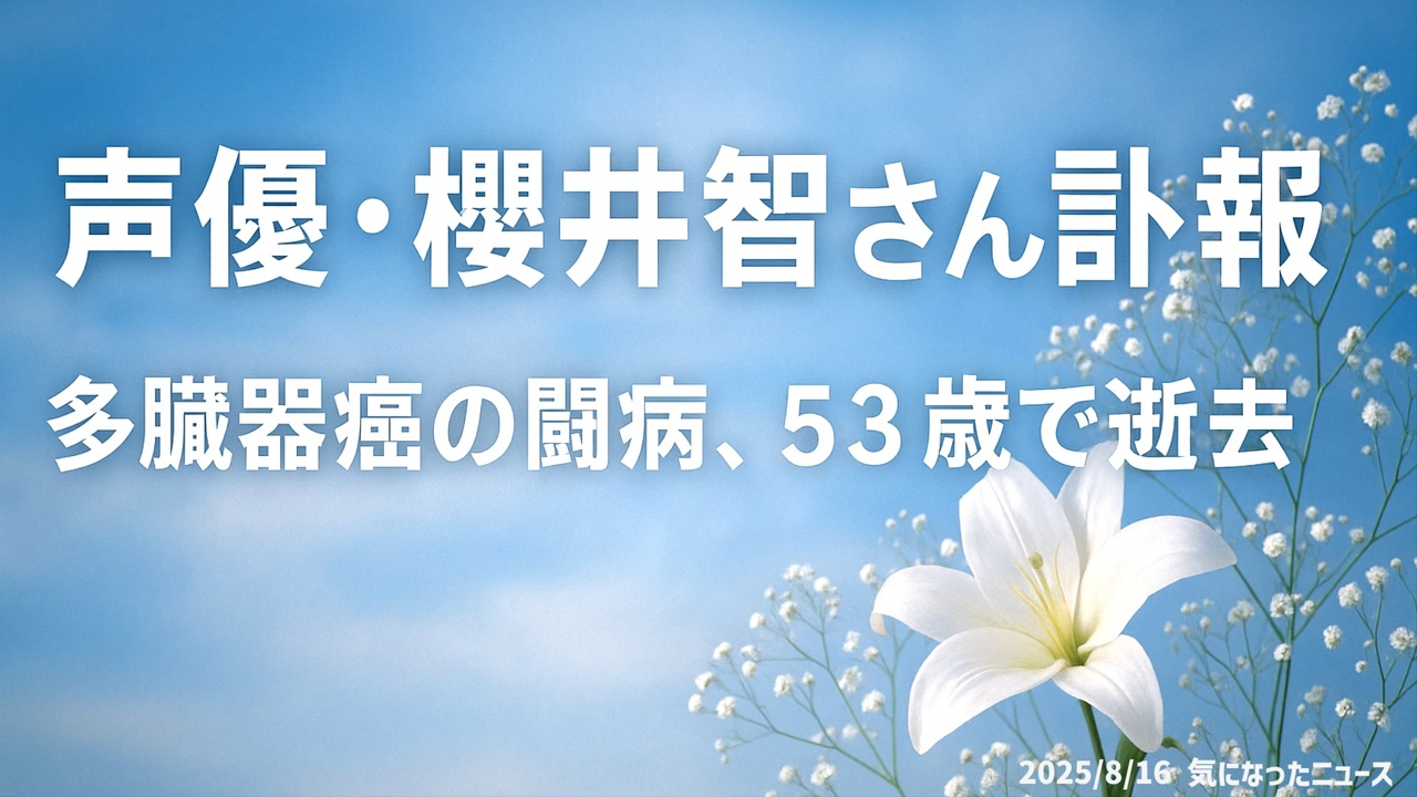 【訃報】◆声優・櫻井智さん 多臓器癌の闘病、53歳で逝去<br><br>声優の櫻井智さんが53歳で逝去。長年、多臓器癌と闘いながら数々の名作アニメで活躍した彼女の代表作には、『マクロス7』のミレーヌ・ジーナス、『怪盗セイント・テール』の主人公、『るろうに剣心』の巻町操、『ポケットモンスター』のシロナなど。2023年に余命1年の宣告を受け、抗がん剤や放射線治療を続けていたが、8月4日の緊急入院後、症状が悪化。SNSではファンから追悼の声が広がる。彼女の功績は永遠に語り継がれるだろう<a href="https://www.oricon.co.jp/news/2401459/?utm_source=Twitter&utm_medium=social&ref_cd=jstw001" target="_blank" rel="noopener nofollow">https://www.oricon.co.jp/news/2401459/?utm_source=Twitter&utm_medium=social&ref_cd=jstw001</a><br><br>◆今回の台本<a href="https://keiichiro8140.hatenablog.com/entry/202508166662222" target="_blank" rel="noopener nofollow">https://keiichiro8140.hatenablog.com/entry/202508166662222</a><br><br>◆チャンネル登録よろしくお願いします<a href="https://youtube.com/@k16_888?si=1S8pLN1Tf9bGiJyV" target="_blank" rel="noopener nofollow">https://youtube.com/@k16_888?si=1S8pLN1Tf9bGiJyV</a><br><br>◆もしも(BAN)の時のためのマイリンク集<a href="https://lit.link/K16_888" target="_blank" rel="noopener nofollow">https://lit.link/K16_888</a><br><br>気になったニュース 2025/8/16<br><br />著作権、肖像権に配慮して作成しております。<br><br>◆気になったニュースの台本!?<br>メモ代わりに作った台本をそのままあげてます<br><a href="https://keiichiro8140.hatenablog.com/." target="_blank" rel="noopener nofollow">https://keiichiro8140.hatenablog.com/.</a><br><br><br>ここからはシリーズ紹介<br><br><br>◆ ワクチン解毒・デトックス<br><a href="https://x.gd/fZweg" target="_blank" rel="noopener nofollow">https://x.gd/fZweg</a><br><br>◆ウイリアム・マキス博士のがん治療(イベルメクチン・フェンベンダゾール等)<br><a href="https://x.gd/AtFYS" target="_blank" rel="noopener nofollow">https://x.gd/AtFYS</a><br><br>◆予防接種健康被害救済制度<br><a href="https://x.gd/0xK9x" target="_blank" rel="noopener nofollow">https://x.gd/0xK9x</a><br><br>◆気になったニュース #1501~<br><br>◆ 【ショートver】気になったニュース<br><a href="https://x.gd/7MxXC" target="_blank" rel="noopener nofollow">https://x.gd/7MxXC</a><br><br>◆ 気になったニュース #1001~<br><a href="https://x.gd/Lp8gv" target="_blank" rel="noopener nofollow">https://x.gd/Lp8gv</a><br><br>◆ 気になったニュース #501~<br><a href="https://x.gd/EmbS4" target="_blank" rel="noopener nofollow">https://x.gd/EmbS4</a><br><br>◆ 気になったニュース #1~#500<br><a href="https://x.gd/uPhNb" target="_blank" rel="noopener nofollow">https://x.gd/uPhNb</a><br><br>◆ X(旧Twitter)・テレグラムで気になった情報<br><a href="https://x.gd/YG6FT" target="_blank" rel="noopener nofollow">https://x.gd/YG6FT</a><br><br>◆ 日比谷5万人パレードデ⚪生放送アーカイブ動画<br><a href="https://x.gd/3CHJv" target="_blank" rel="noopener nofollow">https://x.gd/3CHJv</a><br><br>◆日比谷5万人パレード⚪モのマイリスト作ってみました<br><a href="https://nico.ms/mylist/76828848?ref=sp_other" target="_blank" rel="noopener nofollow">https://nico.ms/mylist/76828848?ref=sp_other</a><br><br>◆3.30 令和の百姓⚪⚪<br><a href="https://www.nicovideo.jp/series/511791?ref=garage_share_other" target="_blank" rel="noopener nofollow">https://www.nicovideo.jp/series/511791?ref=garage_share_other</a><br><br>◆ 及川幸久さんの【XNEWS】シリーズ<br><a href="https://x.gd/3k78K" target="_blank" rel="noopener nofollow">https://x.gd/3k78K</a><br><br>◆これまでの動画<a href="https://x.gd/sPXoJ" target="_blank" rel="noopener nofollow">https://x.gd/sPXoJ</a><br><br>◆もしも(BAN)の時のためのマイリンク集<a href="https://lit.link/K-16_News44" target="_blank" rel="noopener nofollow">https://lit.link/K-16_News44</a><br><br>