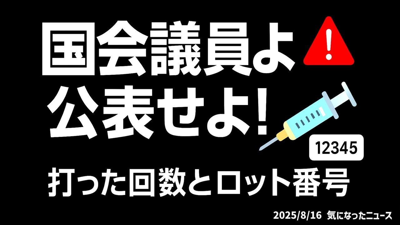 ◆国会議員よ!打った回数とロット番号を公表せよ!<br><br>あらすじ/予告編 <br>日本社会の影に潜む謎を追う。帰化申請で氏名まで日本人化可能という驚きの制度から始まり、新型コロナワクチンの死亡認定1031人のうち66%が報告漏れだった事実が浮上。死亡一時金の実態、超過死亡グラフの操作疑惑、声優豊崎愛生の夫のくも膜下出血死、お笑い芸人岩尾望の帯状疱疹発症、そして国会議員のワクチン接種情報公表要求。これらを繋ぐのは、メディアが報じない重大ニュース。国民の健康と制度の闇を問い、真相に迫る衝撃の展開。恐れず情報を拡散せよ!<br><br><a href="https://x.com/natsuki_aoi123/status/1955888273542537375?t=L0EgcGFxedwKI18cQ3OVyw&s=19" target="_blank" rel="noopener nofollow">https://x.com/natsuki_aoi123/status/1955888273542537375?t=L0EgcGFxedwKI18cQ3OVyw&s=19</a><br>帰化と氏名変更<br><br><a href="https://x.com/JINKOUZOUKA_jp/status/1955532944011120713?t=meEofV4sqDd8BJ6kKYLikA&s=19" target="_blank" rel="noopener nofollow">https://x.com/JINKOUZOUKA_jp/status/1955532944011120713?t=meEofV4sqDd8BJ6kKYLikA&s=19</a><br>ワクチン死亡認定と報告制度<br><br><a href="https://x.com/mezameworld/status/1949790195194249615?t=sQXgzYGkDGqsuXE9LhZHXw&s=19" target="_blank" rel="noopener nofollow">https://x.com/mezameworld/status/1949790195194249615?t=sQXgzYGkDGqsuXE9LhZHXw&s=19</a><br>超過死亡グラフ操作<br><br><a href="https://x.com/fraisst/status/1956351963739906265?t=u_hzx072IUbB7fpt9XtjcQ&s=19" target="_blank" rel="noopener nofollow">https://x.com/fraisst/status/1956351963739906265?t=u_hzx072IUbB7fpt9XtjcQ&s=19</a><br>声優夫の急逝<br><br><a href="https://x.com/fraisst/status/1956366260784296414?t=5HJcODROJmnbiGeivU7axQ&s=19" target="_blank" rel="noopener nofollow">https://x.com/fraisst/status/1956366260784296414?t=5HJcODROJmnbiGeivU7axQ&s=19</a><br>帯状疱疹報告<br><br><a href="https://x.com/PH0917/status/1956123352571232370?t=OJe33AiXUEWNbF-UiStHsA&s=19" target="_blank" rel="noopener nofollow">https://x.com/PH0917/status/1956123352571232370?t=OJe33AiXUEWNbF-UiStHsA&s=19</a><br>国会議員ワクチン公表要請<br><br><br>◆今回の台本<a href="https://keiichiro8140.hatenablog.com/entry/20250816666888999" target="_blank" rel="noopener nofollow">https://keiichiro8140.hatenablog.com/entry/20250816666888999</a><br><br>◆もしも(BAN)の時のためのマイリンク集<a href="https://lit.link/K16_888" target="_blank" rel="noopener nofollow">https://lit.link/K16_888</a><br><br>◆チャンネル登録よろしくお願いします<a href="https://youtube.com/@k16_888?si=1S8pLN1Tf9bGiJyV" target="_blank" rel="noopener nofollow">https://youtube.com/@k16_888?si=1S8pLN1Tf9bGiJyV</a><br><br>気になったニュース 2025/8/16<br><br />著作権、肖像権に配慮して作成しております。<br><br>◆気になったニュースの台本!?<br>メモ代わりに作った台本をそのままあげてます<br><a href="https://keiichiro8140.hatenablog.com/." target="_blank" rel="noopener nofollow">https://keiichiro8140.hatenablog.com/.</a><br><br><br>ここからはシリーズ紹介<br><br><br>◆ ワクチン解毒・デトックス<br><a href="https://x.gd/fZweg" target="_blank" rel="noopener nofollow">https://x.gd/fZweg</a><br><br>◆ウイリアム・マキス博士のがん治療(イベルメクチン・フェンベンダゾール等)<br><a href="https://x.gd/AtFYS" target="_blank" rel="noopener nofollow">https://x.gd/AtFYS</a><br><br>◆予防接種健康被害救済制度<br><a href="https://x.gd/0xK9x" target="_blank" rel="noopener nofollow">https://x.gd/0xK9x</a><br><br>◆気になったニュース #1501~<br><br>◆ 【ショートver】気になったニュース<br><a href="https://x.gd/7MxXC" target="_blank" rel="noopener nofollow">https://x.gd/7MxXC</a><br><br>◆ 気になったニュース #1001~<br><a href="https://x.gd/Lp8gv" target="_blank" rel="noopener nofollow">https://x.gd/Lp8gv</a><br><br>◆ 気になったニュース #501~<br><a href="https://x.gd/EmbS4" target="_blank" rel="noopener nofollow">https://x.gd/EmbS4</a><br><br>◆ 気になったニュース #1~#500<br><a href="https://x.gd/uPhNb" target="_blank" rel="noopener nofollow">https://x.gd/uPhNb</a><br><br>◆ X(旧Twitter)・テレグラムで気になった情報<br><a href="https://x.gd/YG6FT" target="_blank" rel="noopener nofollow">https://x.gd/YG6FT</a><br><br>◆ 日比谷5万人パレードデ⚪生放送アーカイブ動画<br><a href="https://x.gd/3CHJv" target="_blank" rel="noopener nofollow">https://x.gd/3CHJv</a><br><br>◆日比谷5万人パレード⚪モのマイリスト作ってみました<br><a href="https://nico.ms/mylist/76828848?ref=sp_other" target="_blank" rel="noopener nofollow">https://nico.ms/mylist/76828848?ref=sp_other</a><br><br>◆3.30 令和の百姓⚪⚪<br><a href="https://www.nicovideo.jp/series/511791?ref=garage_share_other" target="_blank" rel="noopener nofollow">https://www.nicovideo.jp/series/511791?ref=garage_share_other</a><br><br>◆ 及川幸久さんの【XNEWS】シリーズ<br><a href="https://x.gd/3k78K" target="_blank" rel="noopener nofollow">https://x.gd/3k78K</a><br><br>◆これまでの動画<a href="https://x.gd/sPXoJ" target="_blank" rel="noopener nofollow">https://x.gd/sPXoJ</a><br><br>◆もしも(BAN)の時のためのマイリンク集<a href="https://lit.link/K-16_News44" target="_blank" rel="noopener nofollow">https://lit.link/K-16_News44</a><br><br>