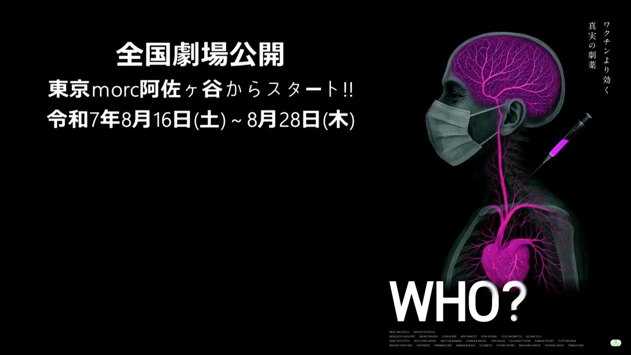 元の動画 → <a href="https://www.youtube.com/watch?v=f-sKnSpeX8g" target="_blank" rel="noopener nofollow">https://www.youtube.com/watch?v=f-sKnSpeX8g</a><br> 2025/08/15<br>🎥上映館一覧(順次発表) <br>▼特設サイト▼ <br><a href="https://www.who-movie.com/" target="_blank" rel="noopener nofollow">https://www.who-movie.com/</a> <br>監督:なるせゆうせい <br>出演:井上正康/林千勝/原口一博/奥野卓志/深田萌絵/茂木誠 松田学 他 <br>※各映画館の公開初日には出演者が日替わりで舞台挨拶を行います。 <br><br>📢【前売券をお持ちのお客様へ】 <br>公式サイト:<a href="https://www.who-movie.com/" target="_blank" rel="noopener nofollow">https://www.who-movie.com/</a> <br>※東京Morc阿佐ヶ谷 公開期間8/16~8/28 <br>上映10:30~/舞台挨拶12:10~ <br><br>満席8/16(土):なるせゆうせい監督・林千勝・高崎圭悟 <br>満席8/17(日):藤江成光/高橋清隆 <br>8/18(月):茂木誠/なるせゆうせい監督 <br>8/19(火):佐藤和夫/なるせゆうせい監督 <br>8/20(水):林千勝/なるせゆうせい監督 <br>劇場住所:東京都杉並区阿佐谷北2-12-19-B1F(Morc阿佐ヶ谷) <br><br>※8/10より劇場HPからオンラインチケット販売開始(お席の確保可能) <br>Morc阿佐ヶ谷HP:<a href="https://www.morc-asagaya.com/film/who/" target="_blank" rel="noopener nofollow">https://www.morc-asagaya.com/film/who/</a> <br>ーーーーーーーーーーーーーーーーーーー <br>令和7年8月30日(土)13時~16時 <br>”姫路おめざめ映画祭り” <br>映画「WHO?」上映会 <br> &なるせ監督トークイベント <br>【登壇者】井上正康先生 なるせゆうせい監督 <br> 佐野栄紀教授 藤江成光氏 <br>映画上映:13時~14時45分 <br>(10分間休憩) <br>トークイベント:14時55分~16時 <br>お申込:<a href="https://20250830who.hp.peraichi.com/who?" target="_blank" rel="noopener nofollow">https://20250830who.hp.peraichi.com/who?</a> <br>ーーーーーーーーーーーーーーーーーーー <br>9.23 国民大集会 WHO脱退デモ@新宿 <br>~パレードデモ&国民大集会~第5次国民運動開催! <br>日時:9月23日(火祝) <br>パレードデモ:10:00集会(受付9:00より)デモStart11:00-16:00終了 <br>集合場所:新宿区戸山公園箱根山地区東側 <br>デモコース:日本版CDC隣地3.2キロ <br><br>国民大集会(夜の部):18:00受付 18:30開始-21:15終了 <br>参加費:2,000円 <br>※こちらはお申込が必要です。先着順 <br>詳細&お申込:<a href="https://t.livepocket.jp/e/s3oys" target="_blank" rel="noopener nofollow">https://t.livepocket.jp/e/s3oys</a> <br>ーーーーーーーーーーーーーーーーーーー