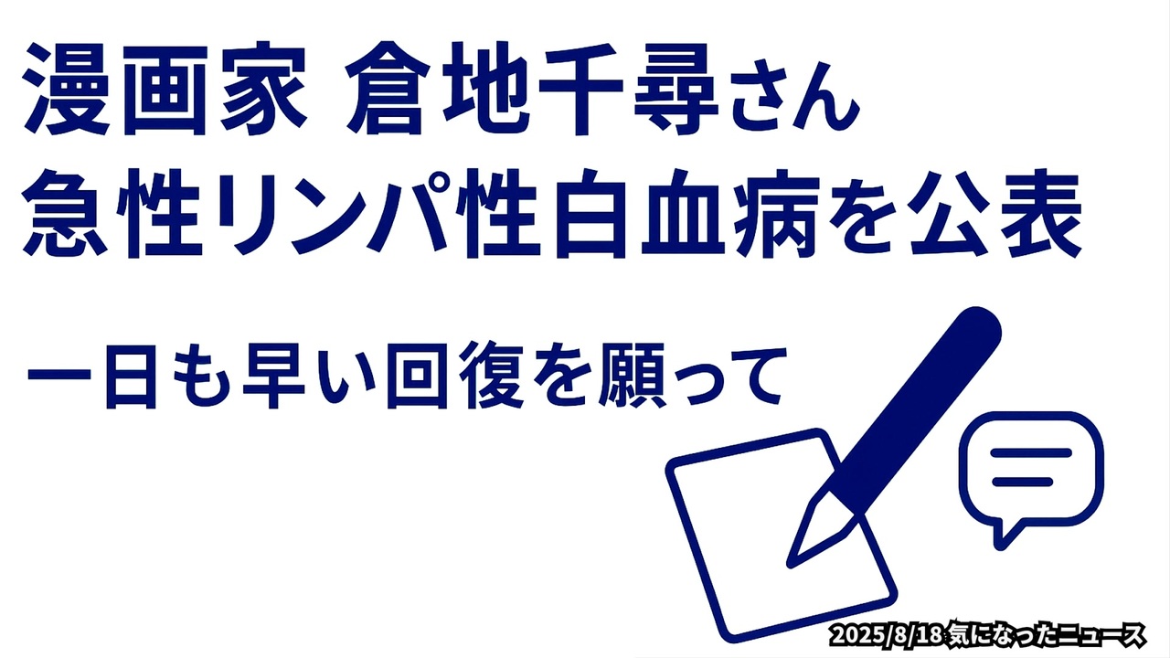 ◆漫画家の倉地千尋さん急性白血病を告白<br><br>漫画家の倉地千尋さんが2025年8月16日、急性リンパ性白血病を公表。2021年にはコロナワクチン接種の心境をSNSで語っていた。治療に専念する中、経験者の声では抗がん剤や放射線治療の辛さもあるが、筋力維持や髪の準備で対処可能。移植後の経過観察を経て、生存率は高く、回復の希望も。倉地さんの早期回復と再びの活躍を願う。<a href="https://news.yahoo.co.jp/articles/bdba75bfcb2e5d4686641f86f2d292cbe4d7861b" target="_blank" rel="noopener nofollow">https://news.yahoo.co.jp/articles/bdba75bfcb2e5d4686641f86f2d292cbe4d7861b</a><br><br><a href="https://x.com/kurachidesu/status/1956584243062063166?t=aPHJp-3dT35NLXIZ6TB4JA&s=19" target="_blank" rel="noopener nofollow">https://x.com/kurachidesu/status/1956584243062063166?t=aPHJp-3dT35NLXIZ6TB4JA&s=19</a><br><br>◆今回の台本<a href="https://keiichiro8140.hatenablog.com/entry/20250818888111" target="_blank" rel="noopener nofollow">https://keiichiro8140.hatenablog.com/entry/20250818888111</a><br><br>◆もしも(BAN)の時のためのマイリンク集<a href="https://lit.link/K16_888" target="_blank" rel="noopener nofollow">https://lit.link/K16_888</a><br><br>◆チャンネル登録よろしくお願いします<a href="https://youtube.com/@k16_888?si=1S8pLN1Tf9bGiJyV" target="_blank" rel="noopener nofollow">https://youtube.com/@k16_888?si=1S8pLN1Tf9bGiJyV</a><br><br>気になったニュース 2025/8/18<br><br />著作権、肖像権に配慮して作成しております。<br><br>◆気になったニュースの台本!?<br>メモ代わりに作った台本をそのままあげてます<br><a href="https://keiichiro8140.hatenablog.com/." target="_blank" rel="noopener nofollow">https://keiichiro8140.hatenablog.com/.</a><br><br><br>ここからはシリーズ紹介<br><br><br>◆ ワクチン解毒・デトックス<br><a href="https://x.gd/fZweg" target="_blank" rel="noopener nofollow">https://x.gd/fZweg</a><br><br>◆ウイリアム・マキス博士のがん治療(イベルメクチン・フェンベンダゾール等)<br><a href="https://x.gd/AtFYS" target="_blank" rel="noopener nofollow">https://x.gd/AtFYS</a><br><br>◆予防接種健康被害救済制度<br><a href="https://x.gd/0xK9x" target="_blank" rel="noopener nofollow">https://x.gd/0xK9x</a><br><br>◆気になったニュース #1501~<br><br>◆ 【ショートver】気になったニュース<br><a href="https://x.gd/7MxXC" target="_blank" rel="noopener nofollow">https://x.gd/7MxXC</a><br><br>◆ 気になったニュース #1001~<br><a href="https://x.gd/Lp8gv" target="_blank" rel="noopener nofollow">https://x.gd/Lp8gv</a><br><br>◆ 気になったニュース #501~<br><a href="https://x.gd/EmbS4" target="_blank" rel="noopener nofollow">https://x.gd/EmbS4</a><br><br>◆ 気になったニュース #1~#500<br><a href="https://x.gd/uPhNb" target="_blank" rel="noopener nofollow">https://x.gd/uPhNb</a><br><br>◆ X(旧Twitter)・テレグラムで気になった情報<br><a href="https://x.gd/YG6FT" target="_blank" rel="noopener nofollow">https://x.gd/YG6FT</a><br><br>◆ 日比谷5万人パレードデ⚪生放送アーカイブ動画<br><a href="https://x.gd/3CHJv" target="_blank" rel="noopener nofollow">https://x.gd/3CHJv</a><br><br>◆日比谷5万人パレード⚪モのマイリスト作ってみました<br><a href="https://nico.ms/mylist/76828848?ref=sp_other" target="_blank" rel="noopener nofollow">https://nico.ms/mylist/76828848?ref=sp_other</a><br><br>◆3.30 令和の百姓⚪⚪<br><a href="https://www.nicovideo.jp/series/511791?ref=garage_share_other" target="_blank" rel="noopener nofollow">https://www.nicovideo.jp/series/511791?ref=garage_share_other</a><br><br>◆ 及川幸久さんの【XNEWS】シリーズ<br><a href="https://x.gd/3k78K" target="_blank" rel="noopener nofollow">https://x.gd/3k78K</a><br><br>◆これまでの動画<a href="https://x.gd/sPXoJ" target="_blank" rel="noopener nofollow">https://x.gd/sPXoJ</a><br><br>◆もしも(BAN)の時のためのマイリンク集<a href="https://lit.link/K-16_News44" target="_blank" rel="noopener nofollow">https://lit.link/K-16_News44</a><br><br>