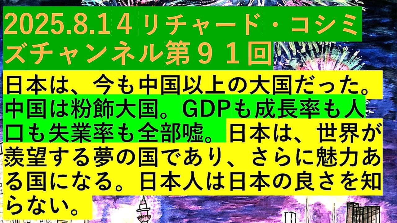 <span style="color: #cc0000;"><strong>◐『「 リチャード・コシミズ・チャンネル 」⦅ 第91回放送 ⦆⦅ 改良版 ⦆』</strong></span><br><br> <span style="color: #ff0000;"><strong>「『 日本 』は、『 今 』も『 中国 』以上の『 大国 』だった。『 中国 』は『 粉飾大国 』。『 GDP 』も『 成長率 』も『 人口 』も『 失業率 』も『 全部嘘 』。<br> 『 日本 』は、『 世界 』が『 羨望 』する『 夢 』の『 国 』であり、さらに『 魅力 』ある『 国 』になる。『 日本人 』は、『 日本 』の『 良さ 』を『 知らない 』」</strong></span><br><br> <span style="color: #38761d;"><strong>◐『 リチャード・コシミズ・チャンネル⦅ ニコニコ チャンネル ⦆』</strong></span><br> <span style="color: #0000ff;"><strong><a href="https://ch.nicovideo.jp/richardkoshimizu" target="_blank" rel="noopener nofollow">https://ch.nicovideo.jp/richardkoshimizu</a></strong></span><br><br> <span style="color: #38761d;"><strong>◐『 リチャード・コシミズ「 ニコニコ生放送⦅ LIVE ⦆」』</strong></span><br> <span style="color: #0000ff;"><strong><a href="https://www.nicovideo.jp/user/120930363/live_programs" target="_blank" rel="noopener nofollow">https://www.nicovideo.jp/user/120930363/live_programs</a></strong></span><br><br> <span style="color: #38761d;"><strong>◐『「 リチャード・コシミズ 講演会 」公式「 動画ギャラリー 」</strong></span><span style="color: #ff0000;"><strong>⦅ 最新動画 ⦆⦅ YouTube版 ⦆</strong></span><span style="color: #38761d;"><strong>』</strong></span><br> <span style="color: #0000ff;"><strong><a href="https://www.youtube.com/@richardkoshimizu-video-gallery" target="_blank" rel="noopener nofollow">https://www.youtube.com/@richardkoshimizu-video-gallery</a></strong></span><br>