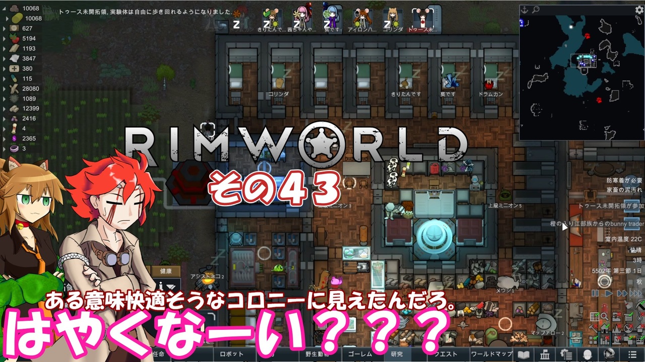 RIMWORLDの実況動画再開?でございます。<br>Ver1.6 アノマリー・バイオ・王侯貴族・イデオロギー・オデッセイDLCあり。<br>MODいっぱい!<br><br><a href="https://www.nicovideo.jp/watch/sm45271542" class="watch">sm45271542</a>← 前 次 → <a href="https://www.nicovideo.jp/watch/sm45352082" class="watch">sm45352082</a><br>マイリスト →<a href="https://www.nicovideo.jp/mylist/57448536" target="_blank" rel="noopener">mylist/57448536</a><br>作成動画その1リスト → <a href="https://www.nicovideo.jp/mylist/58364125" target="_blank" rel="noopener">mylist/58364125</a> <br><br>VOICEVOX:春日部つむぎ(ネコ耳) 九州そら(山城) 雨晴はう(妖夢) 青山龍星(ドラムカン) 東北きりたん(東北きりたん)<br>VOICEVOX他:中国うさぎ もち子さん No.7 四国めたん<br>Voiceroid:東北きりたん(立ち絵:このりEX様作 東北きりたん立ち絵素材5 <a href="https://seiga.nicovideo.jp/seiga/im10819054" target="_blank" rel="noopener">im10819054</a>)<br> 琴葉茜(立ち絵:戌田式琴葉姉妹立ち絵 Ver.2.2 <a href="https://seiga.nicovideo.jp/seiga/im11231844" target="_blank" rel="noopener">im11231844</a>)<br> 琴葉葵(立ち絵:戌田式琴葉姉妹立ち絵 Ver.2.2 <a href="https://seiga.nicovideo.jp/seiga/im11231844" target="_blank" rel="noopener">im11231844</a>)