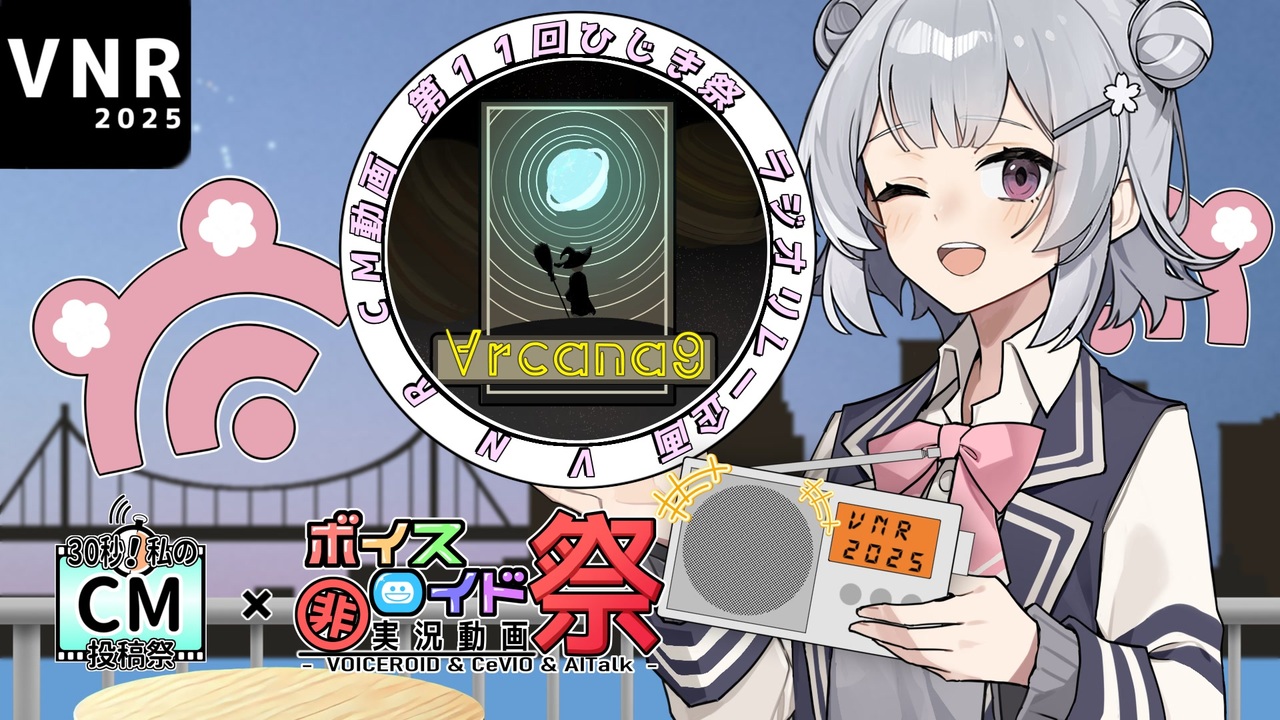 この動画は第11回ひじき祭が企画されたラジオリレー企画『VNR(<a href="https://www.nicovideo.jp/watch/sm45292188" class="watch">sm45292188</a>)』の<br>Aチーム『∀rcana 9(アルカナナイン)』のCM動画になります!<br>そしてCM動画ということで、ルーフェ様(<a href="https://www.nicovideo.jp/user/26664446" target="_blank" rel="noopener">user/26664446</a>)主催の投稿祭<br>『30秒!私のCM投稿祭(<a href="https://www.nicovideo.jp/watch/sm45013729" class="watch">sm45013729</a>)』へ参加させていただきます!<br>20日から始まる第11回ひじき祭、VNR、∀rcana 9のラジオ動画をどうぞよろしくお願いします!<br><br>▽Aチーム参加者:VNR動画リンク:CM内使用立ち絵<br>・十久灯くてん(<a href="https://www.nicovideo.jp/user/92895049" target="_blank" rel="noopener">user/92895049</a>):<a href="https://www.nicovideo.jp/watch/sm45309039" class="watch">sm45309039</a><br> L水奈瀬コウ&ついなちゃん / Aik(アイク)様(<a href="https://seiga.nicovideo.jp/user/illust/53316132" target="_blank" rel="noopener">user/illust/53316132</a>)<br>・東紀州(<a href="https://www.nicovideo.jp/user/96880681" target="_blank" rel="noopener">user/96880681</a>):<a href="https://www.nicovideo.jp/watch/sm45312071" class="watch">sm45312071</a><br> Lナースロボ_タイプT & 足立レイ / 大宮祝詞様(<a href="https://seiga.nicovideo.jp/user/illust/623905" target="_blank" rel="noopener">user/illust/623905</a>)<br>・ろーとる(<a href="https://www.nicovideo.jp/user/128674443" target="_blank" rel="noopener">user/128674443</a>):<a href="https://www.nicovideo.jp/watch/sm45325502" class="watch">sm45325502</a><br> Lナコ / 浅井麻様(<a href="https://seiga.nicovideo.jp/user/illust/89455213" target="_blank" rel="noopener">user/illust/89455213</a>)& 黒聡鵜月 / ごんずい様(<a href="https://seiga.nicovideo.jp/user/illust/39911624" target="_blank" rel="noopener">user/illust/39911624</a>)<br>・れぐるす♂:<a href="https://www.nicovideo.jp/watch/sm45331503" class="watch">sm45331503</a><br> L紲星あかり / 新島秋一様(<a href="https://seiga.nicovideo.jp/user/illust/16787311" target="_blank" rel="noopener">user/illust/16787311</a>)& IA / GEEHON.P様(<a href="https://seiga.nicovideo.jp/user/illust/120815414" target="_blank" rel="noopener">user/illust/120815414</a>)<br>・D.M(<a href="https://www.nicovideo.jp/user/84757291" target="_blank" rel="noopener">user/84757291</a>):<a href="https://www.nicovideo.jp/watch/sm45316391" class="watch">sm45316391</a><br> Lディアちゃん & アルマちゃん / おだぶつ様(<a href="https://seiga.nicovideo.jp/user/illust/33405638" target="_blank" rel="noopener">user/illust/33405638</a>)<br>・とるとら(<a href="https://www.nicovideo.jp/user/56039926" target="_blank" rel="noopener">user/56039926</a>):<a href="https://www.nicovideo.jp/watch/sm45337966" class="watch">sm45337966</a><br> L花隈千冬 / EST様(<a href="https://seiga.nicovideo.jp/user/illust/282985" target="_blank" rel="noopener">user/illust/282985</a>)<br>・ミ立(<a href="https://www.nicovideo.jp/user/136719373" target="_blank" rel="noopener">user/136719373</a>):<a href="https://www.nicovideo.jp/watch/sm45334004" class="watch">sm45334004</a><br> L琴葉茜 / あずももも様(<a href="https://seiga.nicovideo.jp/user/illust/1030763" target="_blank" rel="noopener">user/illust/1030763</a>)& 結月ゆかり / くのだ様(<a href="https://seiga.nicovideo.jp/user/illust/116734844" target="_blank" rel="noopener">user/illust/116734844</a>)<br>・ぉとうふ(<a href="https://www.nicovideo.jp/user/132192080" target="_blank" rel="noopener">user/132192080</a>):<a href="https://www.nicovideo.jp/watch/sm45341317" class="watch">sm45341317</a><br> L宮舞モカ & 夏色花梨 / 絃弥(イトヤ)様(<a href="https://seiga.nicovideo.jp/user/illust/84432369" target="_blank" rel="noopener">user/illust/84432369</a>)<br>・しろきつね(<a href="https://www.nicovideo.jp/user/132404462" target="_blank" rel="noopener">user/132404462</a>):<a href="https://www.nicovideo.jp/watch/sm45347566" class="watch">sm45347566</a><br> L双葉湊音 & 紡乃世詞音 / ゆめうつうつ様(<a href="https://seiga.nicovideo.jp/user/illust/50090448" target="_blank" rel="noopener">user/illust/50090448</a>)<br><br>◇小春六花 / 君臨德雷克(ドレイク レイ)様(<a href="https://seiga.nicovideo.jp/user/illust/50090448" target="_blank" rel="noopener">user/illust/50090448</a>)<br>