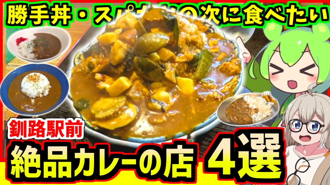 釧路は海鮮や肉だけでなく、カレーも美味しい街です<br>釧路駅前で楽しめる絶品カレーを4点ご紹介します<br><br>ベル&リキ <a href="https://tabelog.com/hokkaido/A0112/A011201/1015497/" target="_blank" rel="noopener nofollow">https://tabelog.com/hokkaido/A0112/A011201/1015497/</a><br>くしろたんちょう市場ぐるめ館・橋本商店 <a href="https://www.instagram.com/kushiro_gur..." target="_blank" rel="noopener nofollow">https://www.instagram.com/kushiro_gur...</a> <br>カフェコロン <a href="https://www.instagram.com/cafe.coron?..." target="_blank" rel="noopener nofollow">https://www.instagram.com/cafe.coron?...</a> <br>ちく半 <a href="http://tikuhan.ftw.jp" target="_blank" rel="noopener nofollow">http://tikuhan.ftw.jp</a><br><br><br>●音声ソフト VOICEVOX:ずんだもん VOICEVOX:中国うさぎ VOICEVOX:春歌ナナ VOICEVOX:青山龍星<br><br><br><br>●X:<a href="https://twitter.com/acerola_vitamin" target="_blank" rel="noopener nofollow">https://twitter.com/acerola_vitamin</a><br /><span style="color: #ff0000; font-size: 24px;"><strong>釧路を紹介するブログ始めました</strong></span>:<a href="https://946de2100.com" target="_blank" rel="noopener nofollow">https://946de2100.com</a><br><br><span style="color: #ff0000; font-size: 16px;"><strong>●おススメ動画:</strong></span><span style="color: #ff0000; font-size: 18px;"><strong>【歴史解説】かつて 釧路を支配していたのは佐賀だった ~釧路元町の始まりと佐野孫右衛門の盛衰~</strong></span><br><br><a href="https://www.nicovideo.jp/watch/sm44267722" class="watch">sm44267722</a><br><br><br><span style="color: #ff0000; font-size: 18px;"><strong>●YouTubeチャンネルも登録よろしくお願いします</strong></span><br><strong>釧路チャンネル <a href="https://www.youtube.com/@znd-kaisetu" target="_blank" rel="noopener nofollow">https://www.youtube.com/@znd-kaisetu</a></strong><br>恋結シラリカソロチャンネル <a href="https://www.youtube.com/@enmusubi-shirarika" target="_blank" rel="noopener nofollow">https://www.youtube.com/@enmusubi-shirarika</a><br><br><br>ほしいものリスト <a href="https://www.amazon.jp/hz/wishlist/ls/2OUUB1JQSRUWG?ref_=wl_share" target="_blank" rel="noopener nofollow">https://www.amazon.jp/hz/wishlist/ls/2OUUB1JQSRUWG?ref_=wl_share</a><br>クリエイターサポート<a href="https://creator-support.nicovideo.jp/registration/116665199" target="_blank" rel="noopener nofollow">https://creator-support.nicovideo.jp/registration/116665199</a>