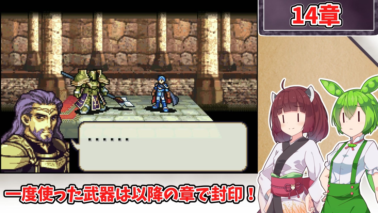 <span style="color: #85200c; font-size: 24px;"><strong><i>正直言って帝国将軍達も全員これくらいの強さにして欲しかった</i></strong></span><br><br><br><span style="font-size: 16px;"><strong>1:一度使用した武器種は、以降の章で使用する事を禁止する。<br>2:武器の使用の定義は『その武器を装備した状態で敵との戦闘が発生したタイミング』<br>または『その武器を売却したタイミング』<br>杖の場合は『対象に対して使用した時点(命中の可否は問わない)』とする。 </strong></span><br><span style="color: #ff0000; font-size: 16px;"><strong>※同盟軍、演出による戦闘イベントでは使用した判定にはならないこととする。</strong></span><span style="font-size: 16px;"><strong> <br>3:仲間候補のユニットを全員加入、生存させた状態でゲームをクリアする。<br>4:上級クラスのユニットは「武器を装備した状態」での戦闘を禁止する。<br>5:バグ技禁止</strong></span><br><br>この動画シリーズ【<a href="https://www.nicovideo.jp/series/516459" target="_blank" rel="noopener">series/516459</a>】<br>『トラ7』の同縛りプレイ【<a href="https://www.nicovideo.jp/series/482976" target="_blank" rel="noopener">series/482976</a>】<br>『烈火』の同縛りプレイ【<a href="https://www.nicovideo.jp/series/406473" target="_blank" rel="noopener">series/406473</a>】<br>『封印』の同縛りプレイ【<a href="https://www.nicovideo.jp/series/316824" target="_blank" rel="noopener">series/316824</a>】<br><br>前:【<a href="https://www.nicovideo.jp/watch/sm45286287" class="watch">sm45286287</a>】次:【<a href="https://www.nicovideo.jp/watch/sm45350177" class="watch">sm45350177</a>】<br><br><strong>使用したソフト</strong><br>VOICEROID+東北きりたんEX<br>VOICEROID+東北ずん子EX<br>VOICEROID2 東北イタコ<br>VOICEVOX:ずんだもん<br>VOICEPEAK:ずんだもん<br><strong>お借りした素材</strong><br>ニコニコモンズの皆様(コンテンツツリー参照)