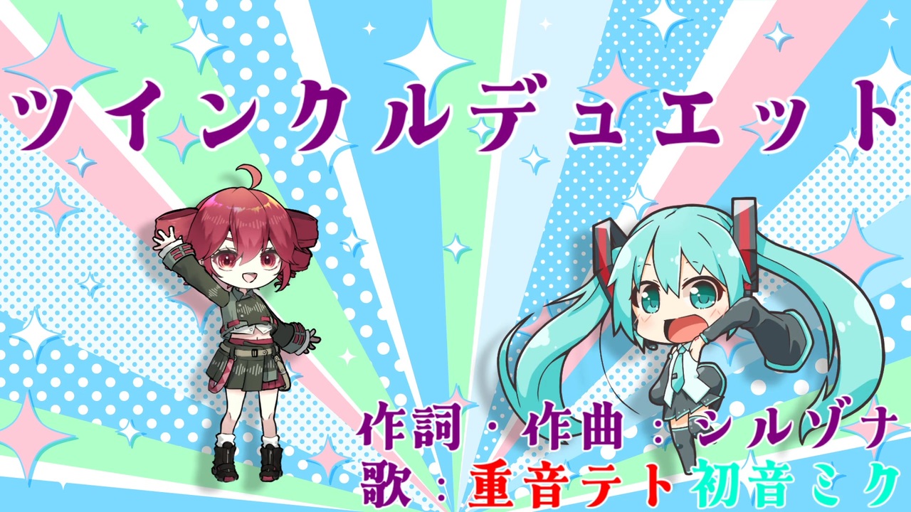 ■ボカコレ2025夏ルーキーランキング参加曲です。『The VOCALOID Collection(ボカコレ)』はボカロ文化をきっかけに生まれたインターネット等で活動するクリエイターやユーザー、企業などボカロに関わる全ての方が参加できるボカロ文化の祭典です。<a href="https://vocaloid-collection.jp/" target="_blank" rel="noopener nofollow">https://vocaloid-collection.jp/</a><br><br>シルゾナです!ボカコレ2025夏ルーキー2曲参加の1曲目です!初音ミクと重音テトのキャラらしさを歌詞に出せるようにこだわりました!<br><br>「ツインクルデュエット」<br>作詞・作曲:シルゾナ<br>歌:初音ミク × 重音テト<br><br>inst音源<br><a href="https://drive.google.com/drive/folders/1WST5LAyA8Q4YxuG9BV6LJzew3_SBseQX?usp=drive_link" target="_blank" rel="noopener nofollow">https://drive.google.com/drive/folders/1WST5LAyA8Q4YxuG9BV6LJzew3_SBseQX?usp=drive_link</a><br><br>ー歌詞ー<br>せーの!僕と私で最強だもん!Hey!<br>ほれ!風切って登場 今宵も始まるパーリナイ<br>さあ相棒と共に行こう<br>膨らむ想像 ウォーミングアップが済んだら<br>飛び込んでいこうよ いちにのさんしで冒険だ<br>そりゃ!張り切ってゴーズオン どうにもならない未来も<br>二人で共闘 キモサベだ<br>冷めきった表情どうした嫌なことあったか<br>返してNo!No!すべてを忘れたメッセンジャー<br>初めての音たちにありがとうを込めて<br>手と手を重ねて行くよ100点の声で<br>無敵のツインクルデュエット!ツインクルデュエット!<br>君と手取り合ってその先へ<br>伝説級のツインクルデュエット!ツインクルデュエット!<br>だから見くびらないで痛い目見るぞ!<br>最大効力発揮中思い込めたこのユニゾンを<br>絶対的中待ったなしだって私(僕)たち最強だもん!Hey!<br>吐いた妄言を紡いでヒカリへ<br>音色を転送 電子の歌姫<br>ミントグリーンで世界染めて<br>クルリンとクイーンの髪靡く<br>奏でるよsay yo!さあさあ交代ね<br>音色の幻想 嘘の歌姫<br>テンションゲージ真っ赤にツインのリズムで<br>ドリルが五線譜を飛び回る<br>音で重なっているから私(僕)たちは無敵!<br>一人じゃ届かないことだってあるが<br>声が重なる奇跡もある<br>重ねた声で理想論だって嘘から出た誠みたいに<br>完全無欠ツインクルデュエット!ツインクルデュエット!<br>君と手取り合ってその先へ<br>伝説級のツインクルデュエット!ツインクルデュエット!<br>だから見くびらないで痛い目見るぞ!<br>最大効力発揮中思い込めたこのユニゾンを<br>絶対的中待ったなしだって私(僕)たち最強で無敵だもん!Hey!<br>