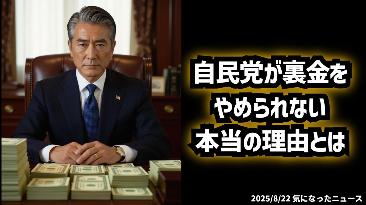 ◆自民党が裏金をやめられない本当の理由とは<br><br>あらすじ<br>自民党の「裏金問題」は、なぜ何度も繰り返されるのか。<br>単なる一部議員の不祥事ではなく、党の体質そのものに深く根ざした仕組みがあります。<br>裏金を悪いと思わない感覚、依存症のように抜けられない構造、そしてバレてもノーダメージという現実。<br>さらに、法律の甘さや制度の抜け道、そして有権者の容認まで。<br>この国をむしばむ“政治とカネ”の実態を知ったとき、視聴者は「次の一票」にどう向き合うべきかを考えざるを得なくなるでしょう。<br><br>◆今回の台本<a href="https://keiichiro8140.hatenablog.com/entry/20250822444888999" target="_blank" rel="noopener nofollow">https://keiichiro8140.hatenablog.com/entry/20250822444888999</a><br><br>◆もしも(BAN)の時のためのマイリンク集<a href="https://lit.link/K16_888" target="_blank" rel="noopener nofollow">https://lit.link/K16_888</a><br><br>◆チャンネル登録よろしくお願いします<a href="https://youtube.com/@k16_888?si=1S8pLN1Tf9bGiJyV" target="_blank" rel="noopener nofollow">https://youtube.com/@k16_888?si=1S8pLN1Tf9bGiJyV</a><br><br>ご視聴ありがとうございます<br>気になったニュース 2025/8/22<br><br />著作権、肖像権に配慮して作成しております。<br><br>◆気になったニュースの台本!?<br>メモ代わりに作った台本をそのままあげてます<br><a href="https://keiichiro8140.hatenablog.com/." target="_blank" rel="noopener nofollow">https://keiichiro8140.hatenablog.com/.</a><br><br><br>ここからはシリーズ紹介<br><br><br>◆ ワクチン解毒・デトックス<br><a href="https://x.gd/fZweg" target="_blank" rel="noopener nofollow">https://x.gd/fZweg</a><br><br>◆ウイリアム・マキス博士のがん治療(イベルメクチン・フェンベンダゾール等)<br><a href="https://x.gd/AtFYS" target="_blank" rel="noopener nofollow">https://x.gd/AtFYS</a><br><br>◆予防接種健康被害救済制度<br><a href="https://x.gd/0xK9x" target="_blank" rel="noopener nofollow">https://x.gd/0xK9x</a><br><br>◆気になったニュース #1501~<br><br>◆ 【ショートver】気になったニュース<br><a href="https://x.gd/7MxXC" target="_blank" rel="noopener nofollow">https://x.gd/7MxXC</a><br><br>◆ 気になったニュース #1001~<br><a href="https://x.gd/Lp8gv" target="_blank" rel="noopener nofollow">https://x.gd/Lp8gv</a><br><br>◆ 気になったニュース #501~<br><a href="https://x.gd/EmbS4" target="_blank" rel="noopener nofollow">https://x.gd/EmbS4</a><br><br>◆ 気になったニュース #1~#500<br><a href="https://x.gd/uPhNb" target="_blank" rel="noopener nofollow">https://x.gd/uPhNb</a><br><br>◆ X(旧Twitter)・テレグラムで気になった情報<br><a href="https://x.gd/YG6FT" target="_blank" rel="noopener nofollow">https://x.gd/YG6FT</a><br><br>◆ 日比谷5万人パレードデ⚪生放送アーカイブ動画<br><a href="https://x.gd/3CHJv" target="_blank" rel="noopener nofollow">https://x.gd/3CHJv</a><br><br>◆日比谷5万人パレード⚪モのマイリスト作ってみました<br><a href="https://nico.ms/mylist/76828848?ref=sp_other" target="_blank" rel="noopener nofollow">https://nico.ms/mylist/76828848?ref=sp_other</a><br><br>◆3.30 令和の百姓⚪⚪<br><a href="https://www.nicovideo.jp/series/511791?ref=garage_share_other" target="_blank" rel="noopener nofollow">https://www.nicovideo.jp/series/511791?ref=garage_share_other</a><br><br>◆ 及川幸久さんの【XNEWS】シリーズ<br><a href="https://x.gd/3k78K" target="_blank" rel="noopener nofollow">https://x.gd/3k78K</a><br><br>◆これまでの動画<a href="https://x.gd/sPXoJ" target="_blank" rel="noopener nofollow">https://x.gd/sPXoJ</a><br><br>◆もしも(BAN)の時のためのマイリンク集<a href="https://lit.link/K-16_News44" target="_blank" rel="noopener nofollow">https://lit.link/K-16_News44</a><br><br>