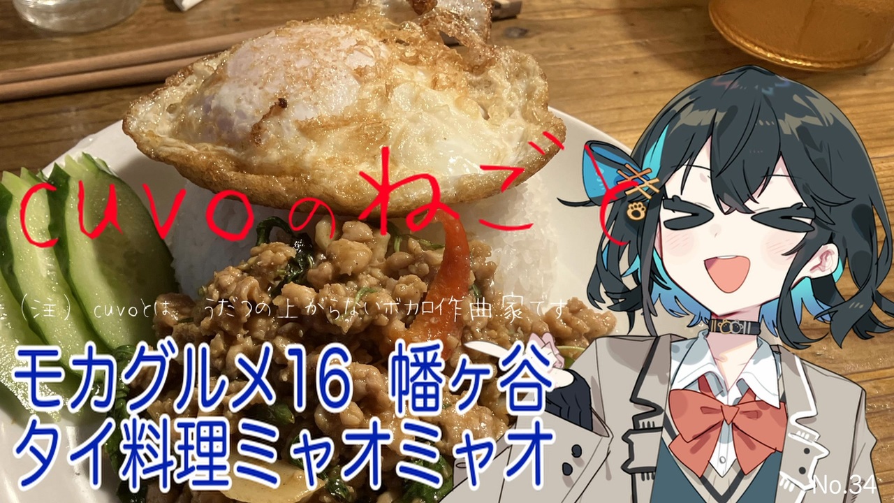 こんにちは!<br>cuvoのねごと、第34回です!<br><br>久々ですが<br>シリーズ「モカグルメ」の<br>第16弾をお届けします!<br><br>今回は幡ヶ谷にある<br>タイ料理ミャオミャオに行ってきました<br><br>久々にガパオを食べましたよー<br><br>「これが至福ってやつですかぁ!」<br><br>気になった方は、ぜひ行ってみてくださいね!<br><br>ーーーーーーー<br>▼Xで発信中!cuvoのねごと<br><a href="https://twitter.com/cuvo_jpn" target="_blank" rel="noopener nofollow">https://twitter.com/cuvo_jpn</a><br><br><br>▼エンディングテーマ<br>「飲みに行こう」<br>曲:cuvo / 詞:vie<br>歌:seven(neutrino)<br><br>↓ニコ動<br><a href="https://nico.ms/sm41946436" target="_blank" rel="noopener nofollow">https://nico.ms/sm41946436</a><br><br>↓YouTube<br><a href="https://youtu.be/aJWyRuT7cGk" target="_blank" rel="noopener nofollow">https://youtu.be/aJWyRuT7cGk</a><br><br>ーーーーーーーーーーーーーーーーー<br>