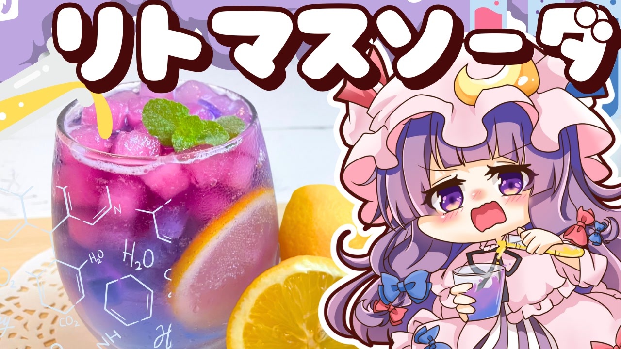 【概要欄にレシピあります🧪】コメントも気軽にしてくださいね! <br><br><br>ふふふ、今回の動画はどうだったかしら? <br>ちょっと途中でお勉強みたいになってしまったけど… <br>魔女のさがかわからないけど 「実験」って響きはワクワクするのよね<br><br>え?なに?サムネの化学式がめちゃくちゃだって?<br> Byパチュリー<br><br>┈┈┈┈┈┈┈┈┈┈┈┈┈┈┈┈┈┈┈<br><br>Youtube投稿日:2024/09/13<br>ー--------------<br><br>▼各種リンク一覧<br><a href="https://lit.link/koumakan-kichin" target="_blank" rel="noopener nofollow">https://lit.link/koumakan-kichin</a><br><br>▼紅魔館キッチンTwitter<br><a href="https://twitter.com/koumakankitchen?s=21&t=KYO6d_6EU-UVPuTV1rlWYw" target="_blank" rel="noopener nofollow">https://twitter.com/koumakankitchen?s=21&t=KYO6d_6EU-UVPuTV1rlWYw</a><br><br>▼紅魔キッチンYoutube<br><a href="https://www.youtube.com/@%E7%B4%85%E9%AD%94%E9%A4%A8%E3%82%AD%E3%83%83%E3%83%81%E3%83%B3" target="_blank" rel="noopener nofollow">https://www.youtube.com/@%E7%B4%85%E9%AD%94%E9%A4%A8%E3%82%AD%E3%83%83%E3%83%81%E3%83%B3</a><br><br><br>∴∵∴∴∵∴∴∵∴∴∵∴∴∵∴∴∵∴∴∵∴∴∵∴<br><br><br>【⠀リトマスソーダ 】 <br><br>○バタフライピー …1袋 <br>○サンルージュ …1袋 <br>○レモン汁 適量(実験) <br>○お好み炭酸ジュース …適量 <br>○レモン …1スライス <br><br><br>⚠️バタフライピーは一日に多量にとると体に良くないような話も聞くので、<br>体調に合わせて調整してみてください! <br><br>ちなみに、使うジュースは主張が激しすぎない、<br>すっきりした味がおススメです!(レモンと相性の良いものが◎)<br> <br>∴∵∴∴∵∴∴∵∴∴∵∴∴∵∴∴∵∴∴∵∴∴∵∴<br><br><br>~クレジット~<br><br>◇編集ソフト:YMM4(ライセンス購入済)<br>◇立ち絵 :自作<br>以下、よくお借りする素材(敬称略)<br>◇音楽:効果音ラボ<br>OtoLogic<br>◇BGM: 甘茶の音楽工房、DOVA SYNDROME<br>◇その他イラスト:イラストAC、いらすとや、ニコニココモンズ等…<br><br>※この動画は【東方project】【上海アリス幻樂団】を<br>元に作成した二次創作作品となります。<br>(二次創作ガイドライン:<a href="https://touhou-project.news/guideline/)" target="_blank" rel="noopener nofollow">https://touhou-project.news/guideline/)</a><br>#東方 #ゆっくり #ゆっくり料理 #ゆっくり実況 #ゆっくり茶番