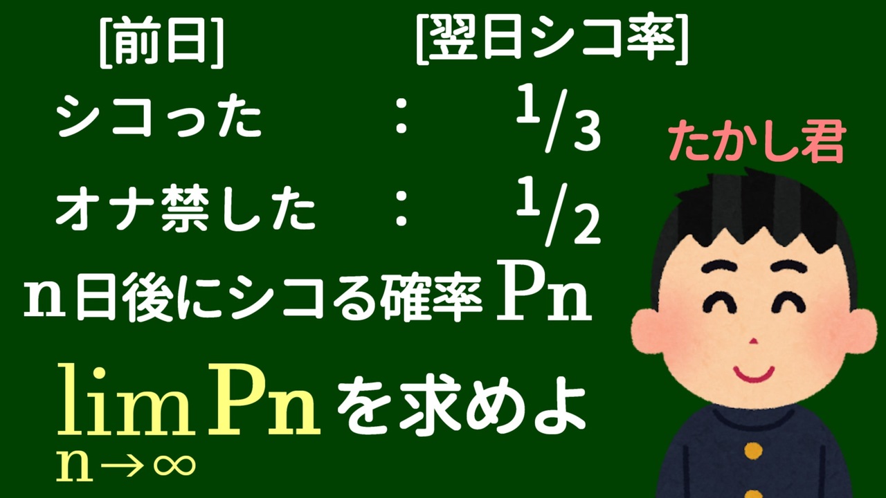 木村わいPです。<br>大学入試で頻出の確率の問題を解説します。<br><br>おっ〇いで学ぶ必要条件・十分条件:<a href="https://www.nicovideo.jp/watch/sm44812044" class="watch">sm44812044</a><br><br>◇投稿したボカロ曲:<a href="https://www.nicovideo.jp/mylist/34084050" target="_blank" rel="noopener">mylist/34084050</a><br>◇twitter:<a href="https://x.com/kimura_yp_hinan" target="_blank" rel="noopener nofollow">https://x.com/kimura_yp_hinan</a><br>◇LINEスタンプ:<a href="https://store.line.me/stickershop/author/1774014/ja" target="_blank" rel="noopener nofollow">https://store.line.me/stickershop/author/1774014/ja</a><br><br>Youtube版:<a href="https://youtu.be/xhxPPR4oqek" target="_blank" rel="noopener nofollow">https://youtu.be/xhxPPR4oqek</a>