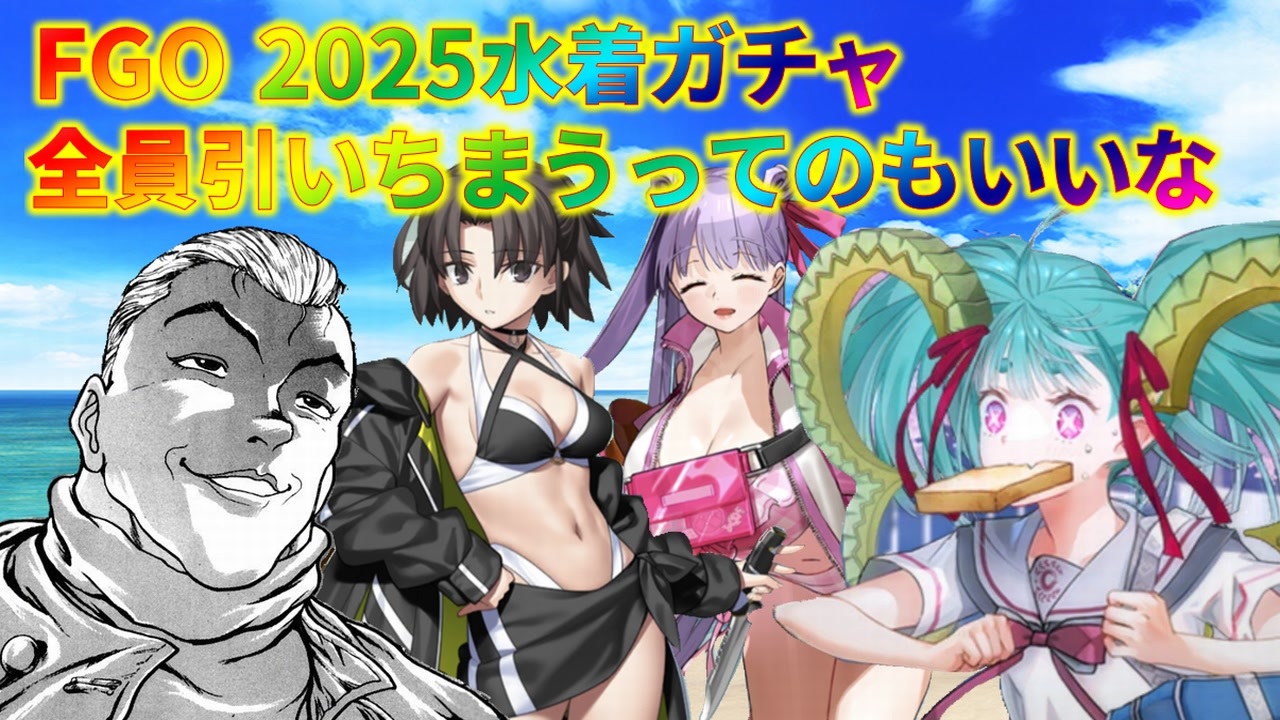 2025年水着ガチャ、全員引きましょう( ゚Д゚)<br>最近録画環境のせいか分かりませんが、妙に動画がチラつくことが多いです。<br>許し亭許して<br><br>前 ⇒ U-オルガマリー宝具5 <a href="https://www.nicovideo.jp/watch/sm45069025" class="watch">sm45069025</a><br>次 ⇒星5エリちゃん <a href="https://www.nicovideo.jp/watch/sm45557661" class="watch">sm45557661</a><br><br>FGOガチャ動画マイリスト ⇒ <a href="https://www.nicovideo.jp/mylist/57723852" target="_blank" rel="noopener">mylist/57723852</a><br>ビーナスイレブンびびっど! ⇒ <a href="https://www.nicovideo.jp/mylist/66096625" target="_blank" rel="noopener">mylist/66096625</a><br>閃乱カグラ ⇒ <a href="https://www.nicovideo.jp/mylist/57723845" target="_blank" rel="noopener">mylist/57723845</a><br>幻獣契約クリプトラクト ⇒ <a href="https://www.nicovideo.jp/mylist/66096613" target="_blank" rel="noopener">mylist/66096613</a><br>天下百剣イリヤコラボ ⇒ <a href="https://www.nicovideo.jp/watch/sm35476389" class="watch">sm35476389</a><br>