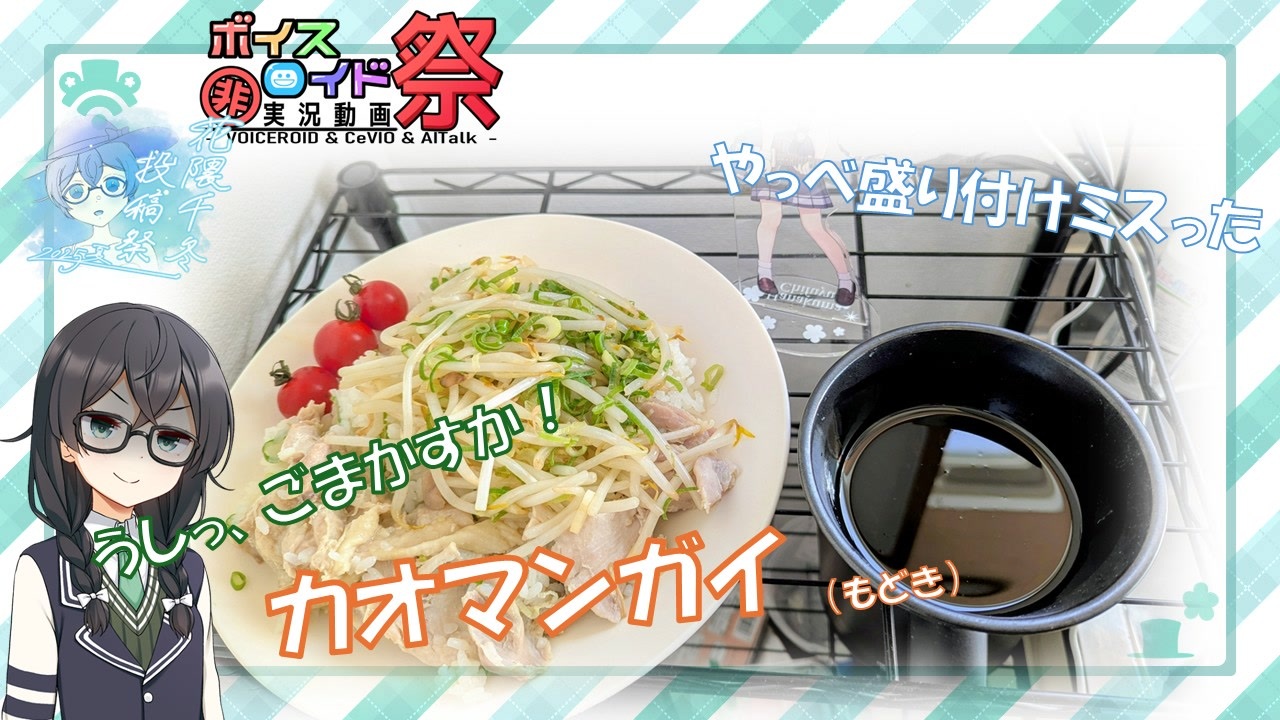 料理素人がタイ料理(諸説あり)のカオマンガイを作った話です。まーじで普段まったく料理しないんですけど、ノリと勢いで作ってみました。カオマンガイという料理自体もこのリレーで知ったんですけどね。<br>注意書きにもある通り、「カオマンガイの宴」「花隈千冬投稿祭 ‘25・夏」「第11回ひじき祭」参加作品です。<br>今回は千冬ちゃんと湊音ちゃんです。<br>お借りした立ち絵<br>花隈千冬(CeVIO AI)・・・ユメノオワリ様、りょうご様<br>双葉湊音(CeVIO AI)・・・ユメノオワリ様、akihiyo様、はやしゅう様<br>小春六花(CeVIO AI)・・・はやしゅう様<br>