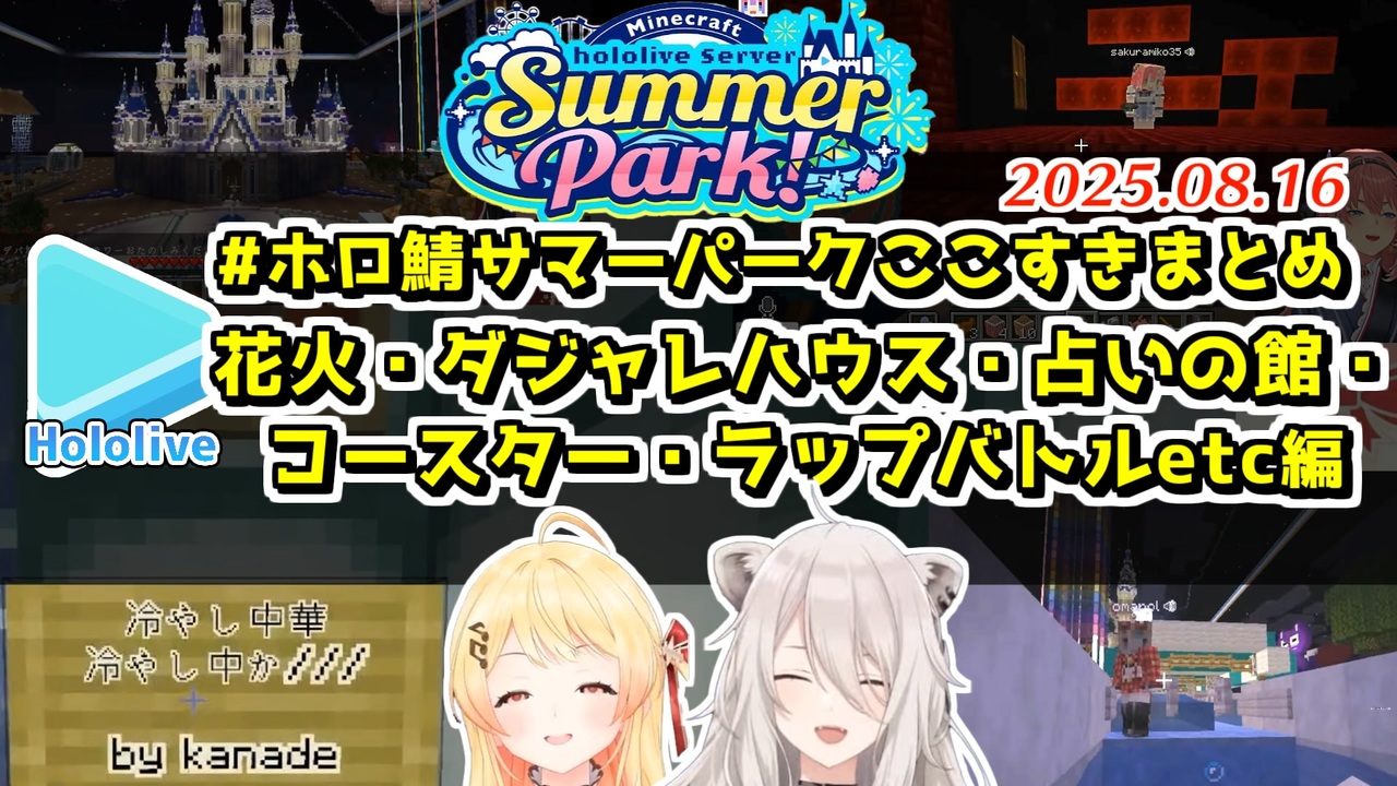 時系列順です<br>ころね視点はありませんでした<br><br><a href="#" class="seekTime" data-seekTime="00:00" onclick="seekNicoPlayer('#00:00'); return false;">#00:00</a> ホロ鯖サマーパーク開園<br><a href="#" class="seekTime" data-seekTime="00:56" onclick="seekNicoPlayer('#00:56'); return false;">#00:56</a> おにかんスバルで笑虎のコースターへ<br><a href="#" class="seekTime" data-seekTime="05:19" onclick="seekNicoPlayer('#05:19'); return false;">#05:19</a> メリーゴーランド<br><a href="#" class="seekTime" data-seekTime="06:39" onclick="seekNicoPlayer('#06:39'); return false;">#06:39</a> ロボ子さんのさむい家<br><a href="#" class="seekTime" data-seekTime="09:00" onclick="seekNicoPlayer('#09:00'); return false;">#09:00</a> 奏の威厳<br><a href="#" class="seekTime" data-seekTime="10:01" onclick="seekNicoPlayer('#10:01'); return false;">#10:01</a> みこスバで占いの館<br><a href="#" class="seekTime" data-seekTime="14:52" onclick="seekNicoPlayer('#14:52'); return false;">#14:52</a> みこスバでラップバトル<br><a href="#" class="seekTime" data-seekTime="17:17" onclick="seekNicoPlayer('#17:17'); return false;">#17:17</a> いろはが寒い家へ<br><a href="#" class="seekTime" data-seekTime="18:22" onclick="seekNicoPlayer('#18:22'); return false;">#18:22</a> 寒い家で1人ホットになる奏<br><a href="#" class="seekTime" data-seekTime="23:33" onclick="seekNicoPlayer('#23:33'); return false;">#23:33</a> 尻相撲でハプニング<br><a href="#" class="seekTime" data-seekTime="25:05" onclick="seekNicoPlayer('#25:05'); return false;">#25:05</a> みんなで寒い家へ<br><a href="#" class="seekTime" data-seekTime="27:26" onclick="seekNicoPlayer('#27:26'); return false;">#27:26</a> 花火打ち上げ<br><a href="#" class="seekTime" data-seekTime="36:08" onclick="seekNicoPlayer('#36:08'); return false;">#36:08</a> ホーニェットマンション1<br><a href="#" class="seekTime" data-seekTime="42:51" onclick="seekNicoPlayer('#42:51'); return false;">#42:51</a> スライダーではぶられポルカ<br><a href="#" class="seekTime" data-seekTime="44:58" onclick="seekNicoPlayer('#44:58'); return false;">#44:58</a> おかゆのティーポットハウス<br><a href="#" class="seekTime" data-seekTime="45:55" onclick="seekNicoPlayer('#45:55'); return false;">#45:55</a> 占いの館大繁盛<br><a href="#" class="seekTime" data-seekTime="55:51" onclick="seekNicoPlayer('#55:51'); return false;">#55:51</a> AZKiのダジャレ朗読<br><a href="#" class="seekTime" data-seekTime="58:09" onclick="seekNicoPlayer('#58:09'); return false;">#58:09</a> トワヴィヴィでわため展望台<br><a href="#" class="seekTime" data-seekTime="59:19" onclick="seekNicoPlayer('#59:19'); return false;">#59:19</a> ホーニェットマンション2<br><a href="#" class="seekTime" data-seekTime="63:06" onclick="seekNicoPlayer('#63:06'); return false;">#63:06</a> おにかんで寒い家へ<br><a href="#" class="seekTime" data-seekTime="65:38" onclick="seekNicoPlayer('#65:38'); return false;">#65:38</a> ヴィヴィの寒い家<br><a href="#" class="seekTime" data-seekTime="66:34" onclick="seekNicoPlayer('#66:34'); return false;">#66:34</a> わためは悪くないよねぇ?<br><a href="#" class="seekTime" data-seekTime="67:37" onclick="seekNicoPlayer('#67:37'); return false;">#67:37</a> ホーニェットマンション3<br><a href="#" class="seekTime" data-seekTime="71:37" onclick="seekNicoPlayer('#71:37'); return false;">#71:37</a> おにかんで展望台<br><a href="#" class="seekTime" data-seekTime="72:07" onclick="seekNicoPlayer('#72:07'); return false;">#72:07</a> ホーニェットマンション4<br><a href="#" class="seekTime" data-seekTime="77:36" onclick="seekNicoPlayer('#77:36'); return false;">#77:36</a> AZKiのやつあたり罵倒<br><a href="#" class="seekTime" data-seekTime="78:32" onclick="seekNicoPlayer('#78:32'); return false;">#78:32</a> ころねと花火<br><a href="#" class="seekTime" data-seekTime="81:16" onclick="seekNicoPlayer('#81:16'); return false;">#81:16</a> おかころてぇてぇ<br><a href="#" class="seekTime" data-seekTime="82:55" onclick="seekNicoPlayer('#82:55'); return false;">#82:55</a> AZKiのすうはあデッドコースター<br><a href="#" class="seekTime" data-seekTime="84:01" onclick="seekNicoPlayer('#84:01'); return false;">#84:01</a> おかころてぇてぇ2<br><a href="#" class="seekTime" data-seekTime="89:23" onclick="seekNicoPlayer('#89:23'); return false;">#89:23</a> わたちはヴィアーニャで一発芸勝負<br><br>文字数オーバーなので元動画様URLはつべ版の概要欄からどうぞ<br><a href="https://youtu.be/VzCq8nrM_lU" target="_blank" rel="noopener nofollow">https://youtu.be/VzCq8nrM_lU</a><br /><span style="color: #b7b7b7; font-size: 10px;">ホロライブ切り抜き/なめたけ <a href="https://t.co/CBwJLnYR2c" target="_blank" rel="noopener nofollow">https://t.co/CBwJLnYR2c</a></span>