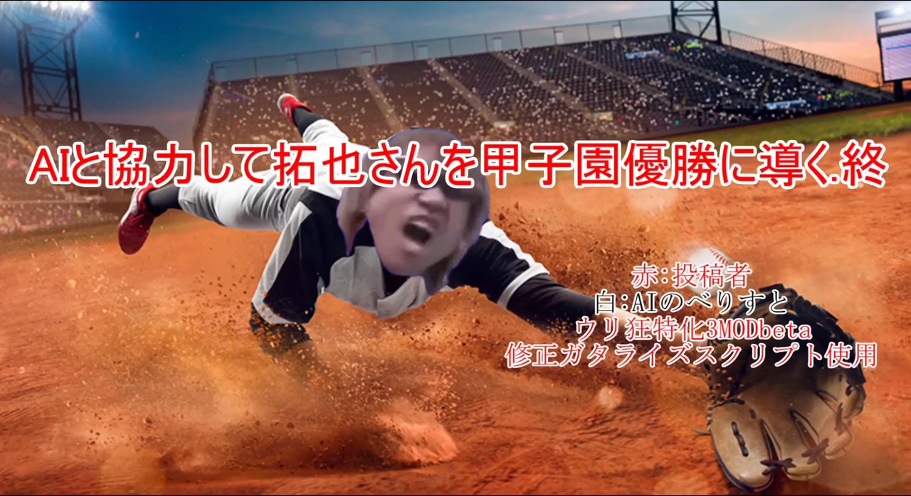 Takuya Video Dumpより転載<br>元動画:<a href="https://www.nicovideo.jp/watch/sm41888457" class="watch">sm41888457</a><br>投稿者:草加拓也<br>以下説明文<br><br>こうして、オレの物語は終わる。<br>物語は終わっても、人生は続く 。<br>「めでたしめでたし」で視聴者は動画を閉じることができても、<br>オレたちの努力が終わることはな い。<br>そう。 みんな歩き続けるのだ。<br><br>初完結です。<br>ノムリッシュ忙しい!ので1年以上?2年以下?新作はないです。<br><br>たくさんの広告、いいね、マイリスト、本当にありがとナス!<br><br>追記:(いないと思いますが)プロ野球編や裏サクセス編等作りたかったら自由に作ってもあっいいすよ(快諾)<br>要望があれば大田先輩たちの立ち絵とかキャラクターブックも公開しまっす<br /><br><br>【再投稿拓也】<br>ほぼ削除:<a href="https://www.nicovideo.jp/series/449801" target="_blank" rel="noopener">series/449801</a><br><br> 非公開:<a href="https://www.nicovideo.jp/series/507594" target="_blank" rel="noopener">series/507594</a><br><br><br>【ここからオレの↓】<br>同人拓也(人力拓也)<br><a href="https://www.nicovideo.jp/series/438451" target="_blank" rel="noopener">series/438451</a><br><br>ai拓也<br><a href="https://www.nicovideo.jp/series/435212" target="_blank" rel="noopener">series/435212</a><br><br>再翻訳とか改変とかタクヤ学<br><a href="https://www.nicovideo.jp/series/437379" target="_blank" rel="noopener">series/437379</a><br><br>bb<br><a href="https://www.nicovideo.jp/series/446026" target="_blank" rel="noopener">series/446026</a>