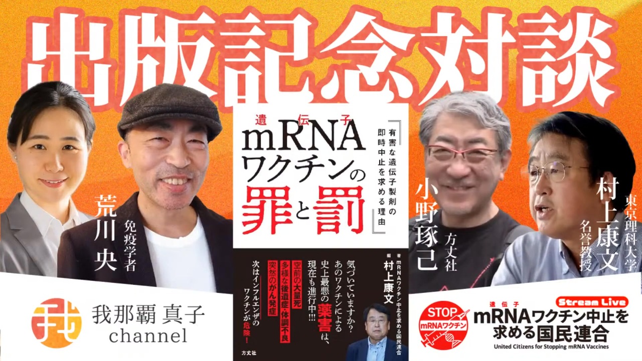 元の動画 → <a href="https://youtu.be/5dvzRcCdTjI" target="_blank" rel="noopener nofollow">https://youtu.be/5dvzRcCdTjI</a><br> 2025/08/23 にライブ配信<br>【生配信】8月23日21時〜国民連合 初の書籍 「mRNAワクチンの罪と罰」出版! 村上康文✖️荒川央✖️小野琢己✖️我那覇真子 <br><br>mRNAワクチン中止を求める国民連合がこれまでの活動をまとめ、そしてさらにこれから懸念される問題について一冊の本を出版しました。 <br><br>レプリコンの危険性を世に広め、危機的状況を回避した成果を持つ国民連合ですが、先見の目を持った国民連合の活動は、まだまだ世に必要なものです。<br><br>国民の8割が打った注射問題は、終わっていません。 <br><br>医療現場で日々患者さんを診ているお医者さん達の最新の医療現場のお話も満載。 大事な家族を守るため、すでに打ってしまって後遺症に悩んでいる人を助けるため、そして身近な誰かが新たな犠牲とならないようにするために、是非この本を一度手に取って欲しいと思います。 <br><br>今回の配信は、国民連合の副代表村上康文先生、免疫学者の荒川央先生、出版社方丈社の小野琢己さんと我那覇の4名で新著に関してお話しします。 <br><br>⚫︎mRNAワクチン中止を求める国民連合から出版のお知らせ <br><br>国民連合 初の書籍 「mRNAワクチンの罪と罰」発売! <br>2025年9月2日 に、当連合より初の書籍として、 <br>「mRNAワクチンの罪と罰」 <br>が発売されます。多大なる被害を現在も出し続けているmRNAワクチンについて、書籍でも真実をお伝えします。 <br><br>プロモーションビデオもあります。 <br>是非以下のリンクからご覧ください↓ <br><a href="https://stop-mrna.com/news-0809-book/" target="_blank" rel="noopener nofollow">https://stop-mrna.com/news-0809-book/</a><br><br><br><a href="https://www.youtube.com/@masakoganaha" target="_blank" rel="noopener nofollow">https://www.youtube.com/@masakoganaha</a><br>我那覇真子チャンネル<br>説明<br>Masako Ganaha from Okinawa, Japan! I love to hang out with patriots! <br><br>我那覇真子(がなはまさこ)と申します。 沖縄在住です。よろしくお願い致します。<br><br>リンク<br>Book Club 読書会 <a href="https://www.youtube.com/@masakoganaha8659" target="_blank" rel="noopener nofollow">https://www.youtube.com/@masakoganaha8659</a><br>セカンドチャンネル2 <a href="https://www.youtube.com/channel/UCylvaAj9QR8GArJqA5b6UKA" target="_blank" rel="noopener nofollow">https://www.youtube.com/channel/UCylvaAj9QR8GArJqA5b6UKA</a><br>チャンネル3 <a href="https://www.youtube.com/channel/UCmaAj0Ki6f0E7H3kh5Fickg/channels" target="_blank" rel="noopener nofollow">https://www.youtube.com/channel/UCmaAj0Ki6f0E7H3kh5Fickg/channels</a>
