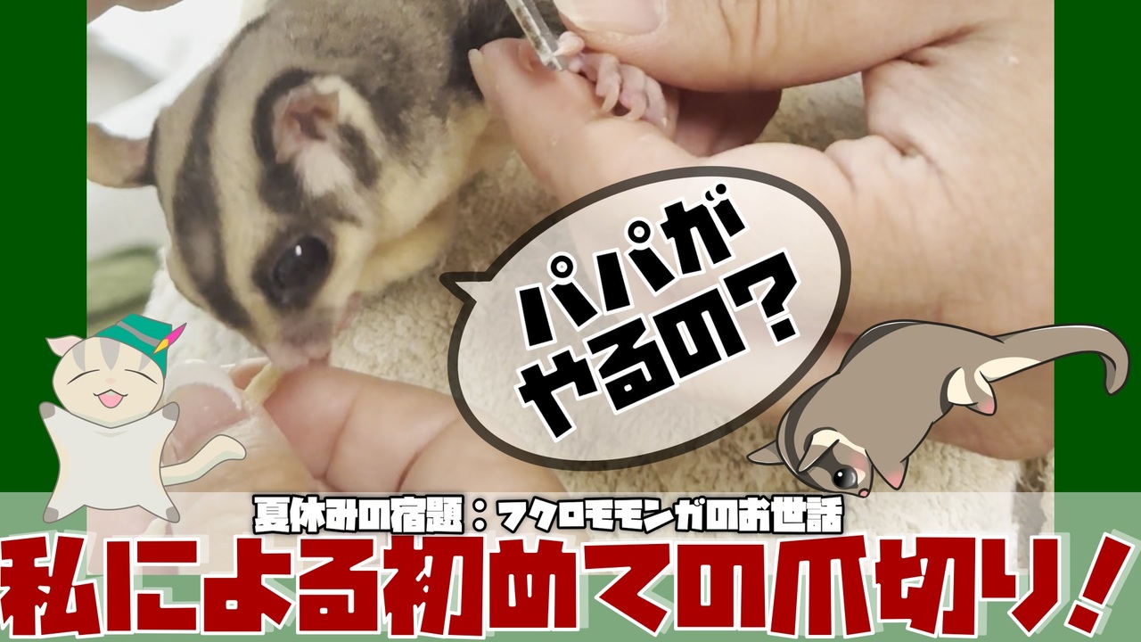 いつも妻に任せていたので、私も練習しようかなと<br><br>-----<br>#sugerglider #フクモモ #蜜袋鼯 #슈가글라이더 #animal #pet #ペット #動物 #小動物 #smallpet #smallpets #シュガーグライダー <br><br>-----<br><br>我が家のフクロモモンガの家系図などはこちらをどうぞ<br><a href="https://www.gelehrte.com/sugarglider/" target="_blank" rel="noopener nofollow">https://www.gelehrte.com/sugarglider/</a><br><br>サブチャンネルもよろしくね<br>ゲレの工房 games<br><a href="https://www.youtube.com/channel/UCgnfLlMe4mYJSX7bD3tbYhw/playlists" target="_blank" rel="noopener nofollow">https://www.youtube.com/channel/UCgnfLlMe4mYJSX7bD3tbYhw/playlists</a><br><br>-----<br>BGM<br><a href="https://commons.nicovideo.jp/works/nc416219" target="_blank" rel="noopener">nc416219</a><br><a href="https://commons.nicovideo.jp/works/nc416532" target="_blank" rel="noopener">nc416532</a><br><a href="https://commons.nicovideo.jp/works/nc417069" target="_blank" rel="noopener">nc417069</a><br />-----<br><br>質問などがありましたらコメントへ<br>もしくはmondやマシュマロへお願いします。雑談のテーマにさせていただきます。<br><a href="https://mond.how/ja/gelehrte" target="_blank" rel="noopener nofollow">https://mond.how/ja/gelehrte</a><br><a href="https://marshmallow-qa.com/gelehrte_crest?t=32mCWZ&utm_medium=url_text&utm_source=promotion" target="_blank" rel="noopener nofollow">https://marshmallow-qa.com/gelehrte_crest?t=32mCWZ&utm_medium=url_text&utm_source=promotion</a><br><br>-----<br>素材<br><br>もみじちゃんねる<br><a href="https://www.youtube.com/channel/UC_8XpcBi0WxI8W9SB4KVSIg" target="_blank" rel="noopener nofollow">https://www.youtube.com/channel/UC_8XpcBi0WxI8W9SB4KVSIg</a><br>ニコニ・コモンズ<br>吹き出し<br><a href="https://commons.nicovideo.jp/works/nc311201" target="_blank" rel="noopener">nc311201</a><br>きりたん<br><a href="https://commons.nicovideo.jp/works/nc192539" target="_blank" rel="noopener">nc192539</a><br><br>エンディングBGM<br>[フリーBGM] ピアノをメインとしたエンディング曲<br><a href="https://youtu.be/pArwh7YWpQ4" target="_blank" rel="noopener nofollow">https://youtu.be/pArwh7YWpQ4</a><br><a href="https://commons.nicovideo.jp/works/nc407623" target="_blank" rel="noopener">nc407623</a>