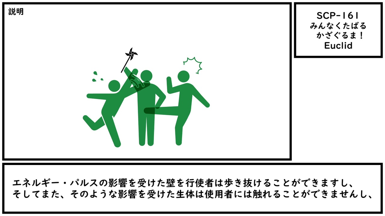 SCP-161には様々な強さでエネルギー・パルスを発する能力があると完全に確信します。<br><br>原語版タイトル: SCP-161 - Pinwheel of Doom!<br>訳者: yamada tarou<br>原語版作者: AdminBright<br>ソース: <a href="http://scp-jp.wikidot.com/scp-161" target="_blank" rel="noopener nofollow">http://scp-jp.wikidot.com/scp-161</a><br>原語版ソース: <a href="http://scp-wiki.wikidot.com/scp-161" target="_blank" rel="noopener nofollow">http://scp-wiki.wikidot.com/scp-161</a><br>ライセンス: CC BY-SA 3.0<br>作成年: 2015<br>原語版作成年: 2010 <br><br>この作品は株式会社アクエストのライセンス(ID:AQALCNTUSR02072507)に基づいて生成された音声データを含んでいます。