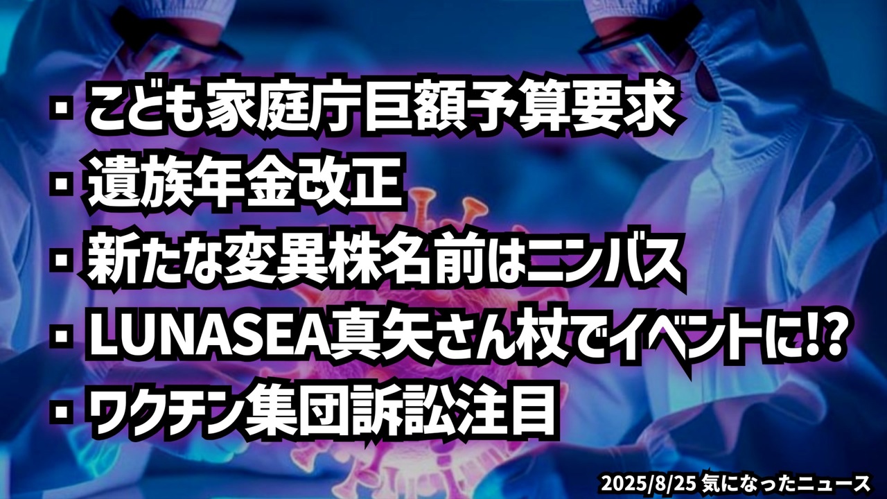 ◆こども家庭庁巨額予算要求・遺族年金改正・新たな変異株の名前はニンバス・LUNASEA真矢さん杖でイベントに!?・ワクチン集団訴訟注目<br><br>あらすじ<br>こども家庭庁は2026年度予算として過去最大の7兆4229億円を要求。少子化対策とされていますが、関係委員の過去の問題も指摘され国民の不信感は高まっています。また、2028年4月から遺族厚生年金制度が大きく変更され、子どもがいない配偶者は原則5年限定の有期給付に。新型コロナウイルス新たな変異株、名前はニンバス。さらにLUNA SEAの真矢さんが杖をついてイベント参加予告、そして新型コロナワクチン被害者の集団訴訟も間近に。複数のニュースが国民生活に直結する重要な動きです。<br><br>自民党 ガソリン暫定税率廃止・新税検討 国民負担変わらず懸念<br><a href="https://news.yahoo.co.jp/articles/7e3779de24d432609b7006a782e7ca248c49d367?source=sns&dv=pc&mid=other&date=20250824&ctg=bus&bt=tw_up" target="_blank" rel="noopener nofollow">https://news.yahoo.co.jp/articles/7e3779de24d432609b7006a782e7ca248c49d367?source=sns&dv=pc&mid=other&date=20250824&ctg=bus&bt=tw_up</a><br><br>LUNA SEA大人気メンバー「まともに立つ事も歩く事もできない」杖をついてイベント出席のお知らせに心配集まる<br><a href="https://news.yahoo.co.jp/articles/d6345e57a3be0a5a5d340160724b6ba488bcff1e" target="_blank" rel="noopener nofollow">https://news.yahoo.co.jp/articles/d6345e57a3be0a5a5d340160724b6ba488bcff1e</a><br><br>新型コロナワクチン被害者遺族と被害者の合同集団訴訟の第3回公判が9月8日東京地裁<br><a href="https://x.com/sousyou13/status/1959801737742532796?t=847aa8ltCrtUjQYKMd7Ulg&s=19" target="_blank" rel="noopener nofollow">https://x.com/sousyou13/status/1959801737742532796?t=847aa8ltCrtUjQYKMd7Ulg&s=19</a><br><br>◆今回の台本<a href="https://keiichiro8140.hatenablog.com/entry/20250825555111" target="_blank" rel="noopener nofollow">https://keiichiro8140.hatenablog.com/entry/20250825555111</a><br><br>◆もしも(BAN)の時のためのマイリンク集<a href="https://lit.link/K16_888" target="_blank" rel="noopener nofollow">https://lit.link/K16_888</a><br><br>◆チャンネル登録よろしくお願いします<a href="https://youtube.com/@k16_888?si=1S8pLN1Tf9bGiJyV" target="_blank" rel="noopener nofollow">https://youtube.com/@k16_888?si=1S8pLN1Tf9bGiJyV</a><br><br>ご覧いただきありがとうございます<br>m(_ _)m<br>気になったニュース 2025/8/25<br><br />著作権、肖像権に配慮して作成しております。<br><br>◆気になったニュースの台本!?<br>メモ代わりに作った台本をそのままあげてます<br><a href="https://keiichiro8140.hatenablog.com/." target="_blank" rel="noopener nofollow">https://keiichiro8140.hatenablog.com/.</a><br><br><br>ここからはシリーズ紹介<br><br><br>◆ ワクチン解毒・デトックス<br><a href="https://x.gd/fZweg" target="_blank" rel="noopener nofollow">https://x.gd/fZweg</a><br><br>◆ウイリアム・マキス博士のがん治療(イベルメクチン・フェンベンダゾール等)<br><a href="https://x.gd/AtFYS" target="_blank" rel="noopener nofollow">https://x.gd/AtFYS</a><br><br>◆予防接種健康被害救済制度<br><a href="https://x.gd/0xK9x" target="_blank" rel="noopener nofollow">https://x.gd/0xK9x</a><br><br>◆気になったニュース #1501~<br><br>◆ 【ショートver】気になったニュース<br><a href="https://x.gd/7MxXC" target="_blank" rel="noopener nofollow">https://x.gd/7MxXC</a><br><br>◆ 気になったニュース #1001~<br><a href="https://x.gd/Lp8gv" target="_blank" rel="noopener nofollow">https://x.gd/Lp8gv</a><br><br>◆ 気になったニュース #501~<br><a href="https://x.gd/EmbS4" target="_blank" rel="noopener nofollow">https://x.gd/EmbS4</a><br><br>◆ 気になったニュース #1~#500<br><a href="https://x.gd/uPhNb" target="_blank" rel="noopener nofollow">https://x.gd/uPhNb</a><br><br>◆ X(旧Twitter)・テレグラムで気になった情報<br><a href="https://x.gd/YG6FT" target="_blank" rel="noopener nofollow">https://x.gd/YG6FT</a><br><br>◆ 日比谷5万人パレードデ⚪生放送アーカイブ動画<br><a href="https://x.gd/3CHJv" target="_blank" rel="noopener nofollow">https://x.gd/3CHJv</a><br><br>◆日比谷5万人パレード⚪モのマイリスト作ってみました<br><a href="https://nico.ms/mylist/76828848?ref=sp_other" target="_blank" rel="noopener nofollow">https://nico.ms/mylist/76828848?ref=sp_other</a><br><br>◆3.30 令和の百姓⚪⚪<br><a href="https://www.nicovideo.jp/series/511791?ref=garage_share_other" target="_blank" rel="noopener nofollow">https://www.nicovideo.jp/series/511791?ref=garage_share_other</a><br><br>◆ 及川幸久さんの【XNEWS】シリーズ<br><a href="https://x.gd/3k78K" target="_blank" rel="noopener nofollow">https://x.gd/3k78K</a><br><br>◆これまでの動画<a href="https://x.gd/sPXoJ" target="_blank" rel="noopener nofollow">https://x.gd/sPXoJ</a><br><br>◆もしも(BAN)の時のためのマイリンク集<a href="https://lit.link/K-16_News44" target="_blank" rel="noopener nofollow">https://lit.link/K-16_News44</a><br><br>