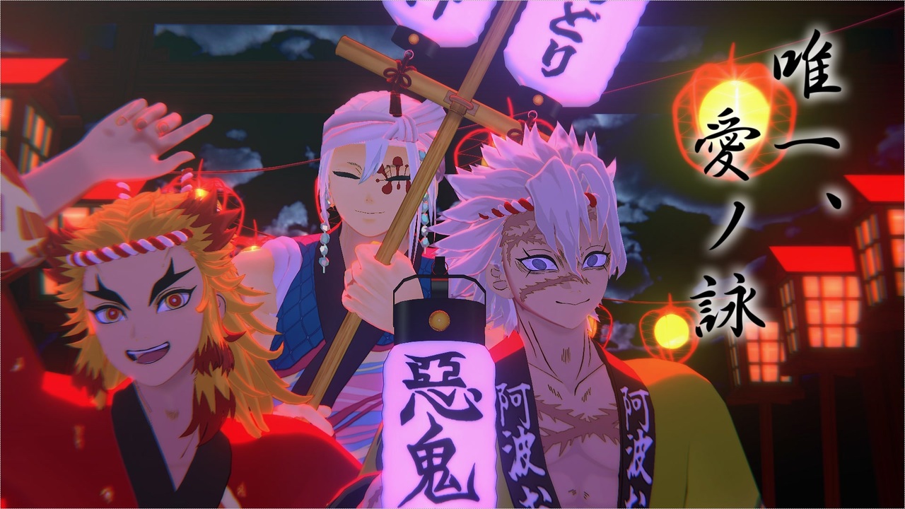 阿波踊りの素敵なお衣装をお借りし、踊って頂きました <br><strong>制作者の皆様、ご覧になって頂きました皆様に、心より感謝を致します </strong><br>~お借りしたもの~【原曲】唯一、愛ノ詠 作詞作曲編曲:梅とら 【唄】巡音ルカ・初音ミク・GUMI・IA・鏡音リン【振付】KARASU(from SLH), 明香里(from ATY)【ダンスモーション】【リップ・表情・カメラ】ヨーグルト姉【モデル】kazii式煉獄杏寿郎・kazii式不死川実弥・つる式宇髄天元【衣装・アクセサリー】Rudy【スカイドーム】怪獣対若大将P・Ai 【ステージ】蒼すずめ【エフェクト】そぼろP・のりしお・P.I.P・くるりんぽん・ましまし・ikeno・ハル・glam・びみ・下っ腹P・すの・びーと・カヤ・針金・ミーフォ茜・ジノク・微・RedialC・セルゆかり・non0【ツール】MikuMikuDance(樋口優)・MMEffect(舞力介入P)・PMXエディタ(極北P)・ AviUtl(KENくん)・BowlRoll 敬称略 <br>失礼ありましたら、すみません