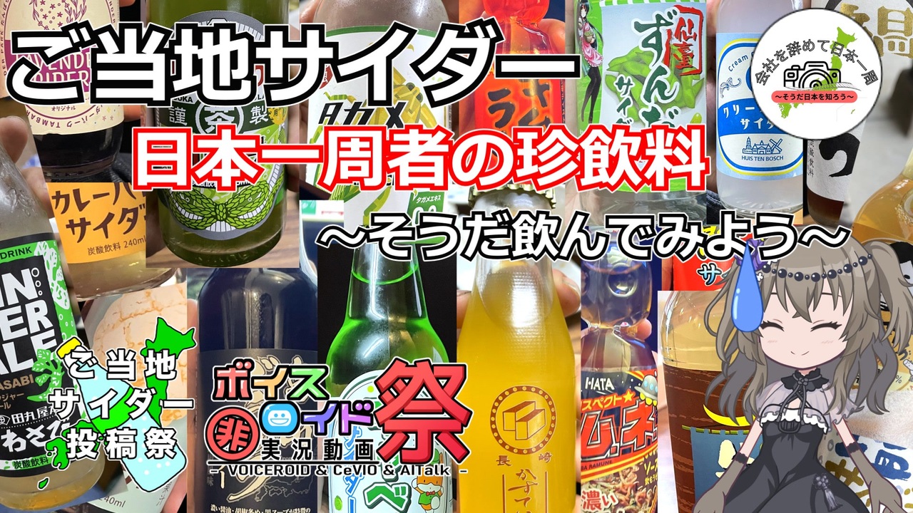 no=name(ナナシ)様主催の『ご当地サイダー投稿祭』<span style="font-size: 24px;"><strong>(告知→<a href="https://www.nicovideo.jp/watch/sm45028359" class="watch">sm45028359</a>)</strong></span><br><br>『第11回ひじき祭』<span style="font-size: 24px;"><strong>(告知→<a href="https://www.nicovideo.jp/watch/sm44932816" class="watch">sm44932816</a>)</strong></span><br><br>の同時参加動画です<br><br>日本一周に行く前から飲んでいた珍飲料もとい<br>ご当地サイダーたちと<br>日本一周中に見つけて購入して飲んだサイダーをご紹介<br>動画は撮ってないので写真だけになるのはご了承ください<br>(まさかこんな動画祭あると思ってなくて動画なんて撮ってなかったんや・・・・)<br><br>最後の「そういうことですね……」(本編で出てくる)<br><br><span style="font-size: 24px;"><strong>「すんだサイダー」の時の表記が「餃子サイダー」のままでしたーー!!<br>すみません!!</strong></span><br><br>シリーズ一覧 <a href="https://www.nicovideo.jp/series/518714" target="_blank" rel="noopener">series/518714</a><br><br>動画編集ソフトゆっくりムービーメーカー(YMM)<br><br>使用SE・BGM<br>DOVA-SYNDROME:<a href="https://dova-s.jp/" target="_blank" rel="noopener nofollow">https://dova-s.jp/</a><br>ニコニコモンズ:<a href="https://commons.nicovideo.jp/" target="_blank" rel="noopener nofollow">https://commons.nicovideo.jp/</a><br>効果音ラボ:<a href="https://soundeffect-lab.info/" target="_blank" rel="noopener nofollow">https://soundeffect-lab.info/</a><br>MusMus:<a href="https://musmus.main.jp/" target="_blank" rel="noopener nofollow">https://musmus.main.jp/</a><br>BGMer:<a href="https://bgmer.net/" target="_blank" rel="noopener nofollow">https://bgmer.net/</a><br><br><br>霊夢<br>立ち絵:ふにちか様 <a href="https://seiga.nicovideo.jp/seiga/im9999918" target="_blank" rel="noopener nofollow">https://seiga.nicovideo.jp/seiga/im9999918</a><br><br>VOICEVOX:冥鳴ひまり<br>立ち絵:カミヨシ様 <a href="https://seiga.nicovideo.jp/seiga/im11325328" target="_blank" rel="noopener nofollow">https://seiga.nicovideo.jp/seiga/im11325328</a><br> <a href="https://seiga.nicovideo.jp/seiga/im11601628" target="_blank" rel="noopener nofollow">https://seiga.nicovideo.jp/seiga/im11601628</a><br> <a href="https://seiga.nicovideo.jp/seiga/im11632137" target="_blank" rel="noopener nofollow">https://seiga.nicovideo.jp/seiga/im11632137</a><br><br>X(旧Twitter)→<a href="https://twitter.com/effirstlatter" target="_blank" rel="noopener nofollow">https://twitter.com/effirstlatter</a><br>youtube→<a href="https://www.youtube.com/channel/UCtUGJqkXAnzdQnfMK_2gGXw" target="_blank" rel="noopener nofollow">https://www.youtube.com/channel/UCtUGJqkXAnzdQnfMK_2gGXw</a><br>