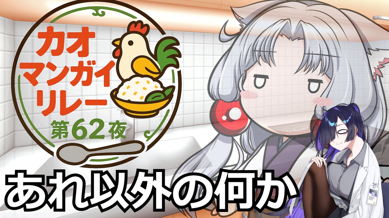 カオマンガイリレーに参加させていただきました<br>やめて、石を投げないで!!<br>これが私の精一杯なんです<br>ちゃんとバトン受け渡し出来てよかった、、、、<br><br>ロゴはチャットgptに作ってもらいました<br><br>VOICEPEAK 東北イタコ<br>A.I.VOICE 夜語トバリ<br><br>【主催】<br>物体B様 <br>告知動画?<br><a href="https://www.nicovideo.jp/watch/sm45195512" class="watch">sm45195512</a><br><br>【立ち絵】<br>たばすこ様 ちびタコさん立ち絵素材<br><a href="https://seiga.nicovideo.jp/seiga/im10703444" target="_blank" rel="noopener">im10703444</a><br><br>なごにや様<br>なごにや式夜語トバリ座り立ち絵<br><a href="https://seiga.nicovideo.jp/seiga/im11213837" target="_blank" rel="noopener">im11213837</a><br><br><br>【背景】<br>みんちり様<br>キッチン <br><a href="https://commons.nicovideo.jp/works/nc228369" target="_blank" rel="noopener">nc228369</a><br><br>【セリフ枠】<br>アストロノーカ風のセリフ枠1(約1750×350)<br><a href="https://commons.nicovideo.jp/works/nc297375" target="_blank" rel="noopener">nc297375</a><br><br>【BGM】<br>物体B様 <br>でんでらりゅうばテクノ <br><a href="https://commons.nicovideo.jp/works/nc419905" target="_blank" rel="noopener">nc419905</a>