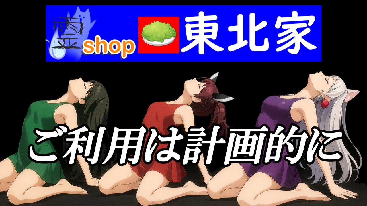 浮気相手・会社の上司等にお悩みの方。<br>呪いをお貸しできます。<br>(年利(命) 44.4%~66.6%)<br>返済を考えたお貸し入れを。<br>【霊ショップ東北家】<br><br>※ 武富士CMのパロディです。<br><br><span style="color: #ff0000;">【他のシリーズ】</span><br><span style="color: #9900ff;">遊戯王ゆかりモンスターズ【遊戯王DMパロ】⇒<a href="https://www.nicovideo.jp/watch/sm44494072" class="watch">sm44494072</a></span><br><span style="color: #ff00ff;">AIで動くボイロシリーズ⇒<a href="https://www.nicovideo.jp/series/529421" target="_blank" rel="noopener">series/529421</a></span><br>