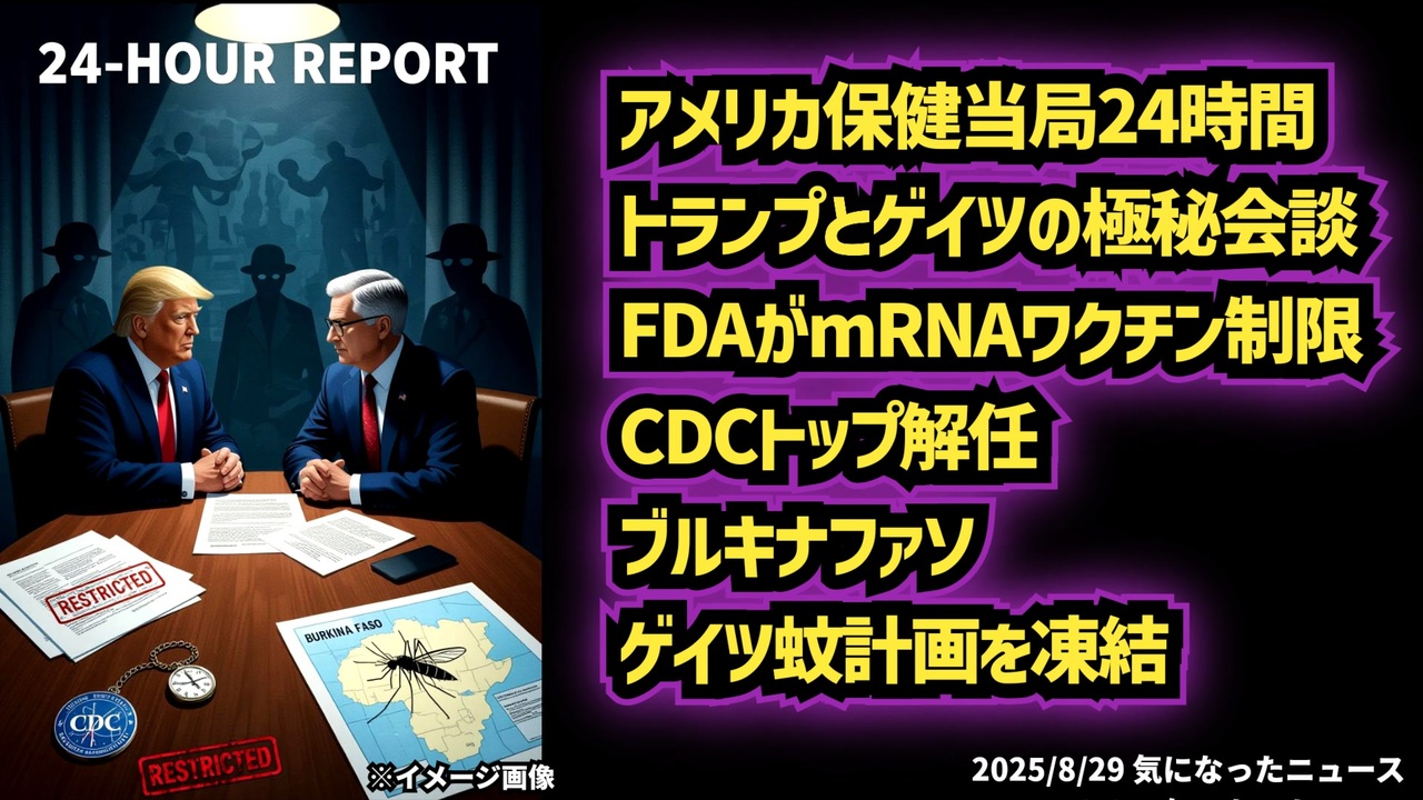 ◆アメリカ保健当局24時間の衝撃:トランプとゲイツの極秘会談、FDAがmRNAワクチン制限、CDCトップ解任、ブルキナファソがゲイツ蚊計画を凍結<br><br>あらすじ<br>アメリカ保健当局が24時間で激変!トランプ大統領とビル・ゲイツ氏がホワイトハウスで極秘会談、テーマはグローバル保健。FDAはmRNAワクチンの緊急使用許可を撤回し、限定承認へ移行。CDCではモナレス所長解任、上級職員4名辞任で波紋。ブルキナファソはゲイツ関連の遺伝子組み換え蚊プロジェクトを停止。保健政策の裏で何が動くのか?改革か混乱か、緊迫の24時間を追う!<a href="https://x.com/NicHulscher/status/1960912396152676627?t=smHZxb82xMSY5qLXNQir7A&s=19" target="_blank" rel="noopener nofollow">https://x.com/NicHulscher/status/1960912396152676627?t=smHZxb82xMSY5qLXNQir7A&s=19</a><br><br>偏向報道阻止<a href="https://x.com/VigilantFox/status/1961121422841188826?t=YIqlIkjtSx4CaQm2PXEXCg&s=19" target="_blank" rel="noopener nofollow">https://x.com/VigilantFox/status/1961121422841188826?t=YIqlIkjtSx4CaQm2PXEXCg&s=19</a><br><br>ビル・ゲイツ遺伝子組み換え蚊プロジェクト停止<a href="https://x.com/Junika2022/status/1960678736535413096?t=so1DmuFt6KcsTErJJnxU_A&s=19" target="_blank" rel="noopener nofollow">https://x.com/Junika2022/status/1960678736535413096?t=so1DmuFt6KcsTErJJnxU_A&s=19</a><br><br>◆今回の台本<a href="https://keiichiro8140.hatenablog.com/entry/20250829999111" target="_blank" rel="noopener nofollow">https://keiichiro8140.hatenablog.com/entry/20250829999111</a><br><br>◆もしも(BAN)の時のためのマイリンク集<a href="https://lit.link/K16_888" target="_blank" rel="noopener nofollow">https://lit.link/K16_888</a><br><br>◆チャンネル登録よろしくお願いします<a href="https://youtube.com/@k16_888?si=1S8pLN1Tf9bGiJyV" target="_blank" rel="noopener nofollow">https://youtube.com/@k16_888?si=1S8pLN1Tf9bGiJyV</a><br><br>ご覧いただきありがとうございます<br>m(_ _)m<br>気になったニュース 2025/8/29<br><br />著作権、肖像権に配慮して作成しております。<br><br>◆気になったニュースの台本!?<br>メモ代わりに作った台本をそのままあげてます<br><a href="https://keiichiro8140.hatenablog.com/." target="_blank" rel="noopener nofollow">https://keiichiro8140.hatenablog.com/.</a><br><br><br>ここからはシリーズ紹介<br><br><br>◆ ワクチン解毒・デトックス<br><a href="https://x.gd/fZweg" target="_blank" rel="noopener nofollow">https://x.gd/fZweg</a><br><br>◆ウイリアム・マキス博士のがん治療(イベルメクチン・フェンベンダゾール等)<br><a href="https://x.gd/AtFYS" target="_blank" rel="noopener nofollow">https://x.gd/AtFYS</a><br><br>◆予防接種健康被害救済制度<br><a href="https://x.gd/0xK9x" target="_blank" rel="noopener nofollow">https://x.gd/0xK9x</a><br><br>◆気になったニュース #1501~<br><br>◆ 【ショートver】気になったニュース<br><a href="https://x.gd/7MxXC" target="_blank" rel="noopener nofollow">https://x.gd/7MxXC</a><br><br>◆ 気になったニュース #1001~<br><a href="https://x.gd/Lp8gv" target="_blank" rel="noopener nofollow">https://x.gd/Lp8gv</a><br><br>◆ 気になったニュース #501~<br><a href="https://x.gd/EmbS4" target="_blank" rel="noopener nofollow">https://x.gd/EmbS4</a><br><br>◆ 気になったニュース #1~#500<br><a href="https://x.gd/uPhNb" target="_blank" rel="noopener nofollow">https://x.gd/uPhNb</a><br><br>◆ X(旧Twitter)・テレグラムで気になった情報<br><a href="https://x.gd/YG6FT" target="_blank" rel="noopener nofollow">https://x.gd/YG6FT</a><br><br>◆ 日比谷5万人パレードデ⚪生放送アーカイブ動画<br><a href="https://x.gd/3CHJv" target="_blank" rel="noopener nofollow">https://x.gd/3CHJv</a><br><br>◆日比谷5万人パレード⚪モのマイリスト作ってみました<br><a href="https://nico.ms/mylist/76828848?ref=sp_other" target="_blank" rel="noopener nofollow">https://nico.ms/mylist/76828848?ref=sp_other</a><br><br>◆3.30 令和の百姓⚪⚪<br><a href="https://www.nicovideo.jp/series/511791?ref=garage_share_other" target="_blank" rel="noopener nofollow">https://www.nicovideo.jp/series/511791?ref=garage_share_other</a><br><br>◆ 及川幸久さんの【XNEWS】シリーズ<br><a href="https://x.gd/3k78K" target="_blank" rel="noopener nofollow">https://x.gd/3k78K</a><br><br>◆これまでの動画<a href="https://x.gd/sPXoJ" target="_blank" rel="noopener nofollow">https://x.gd/sPXoJ</a><br><br>◆もしも(BAN)の時のためのマイリンク集<a href="https://lit.link/K-16_News44" target="_blank" rel="noopener nofollow">https://lit.link/K-16_News44</a><br><br>