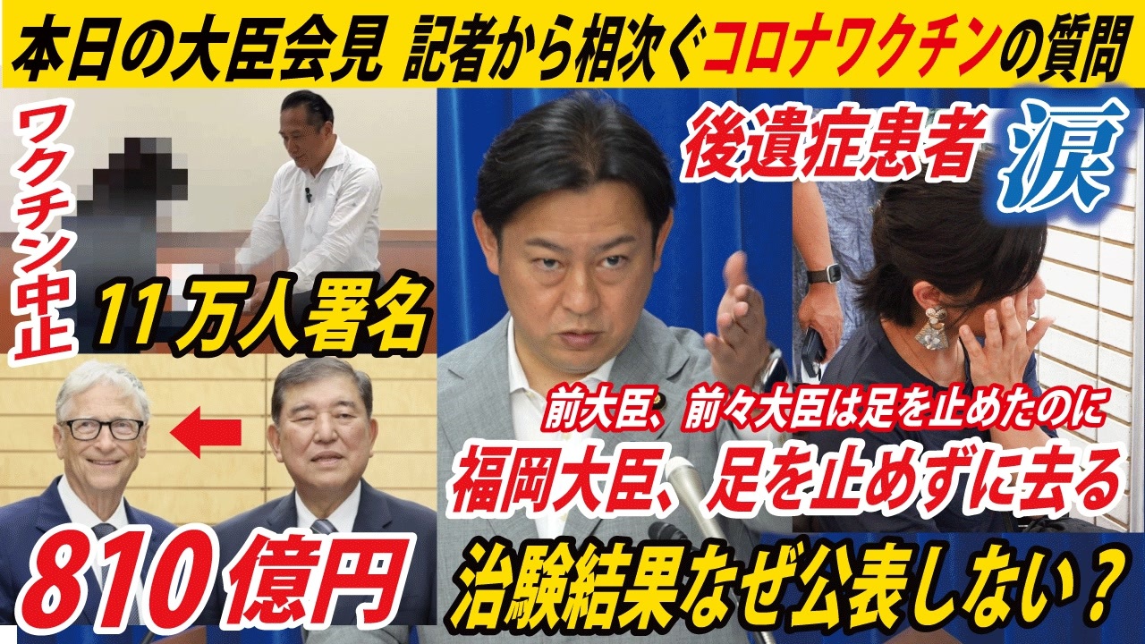 令和7月8日29日 厚生労働大臣記者会見<br>この動画は投稿者が現地で撮影したものを編集し公開しています。<br><br>❑藤江の講演等の予定はこちら<br><a href="https://nicochannel.jp/fujie/articles/news/ar3Rff79Fgycs6HaZGBAVbNN" target="_blank" rel="noopener nofollow">https://nicochannel.jp/fujie/articles/news/ar3Rff79Fgycs6HaZGBAVbNN</a><br><br>❑2025年4月22日発売 <br>「おかしくないですか⁉ 日本人・謎の大量死──知ってください、衝撃の事実」<br> <a href="https://amzn.to/424jnwO" target="_blank" rel="noopener nofollow">https://amzn.to/424jnwO</a><br><br>Amazonアソシエイトプログラムに参加しています。<br><br>―――――――――――――――――――――――――――――――<br><br>❑「世界を欺いた〇〇〇〇〇〇〇」(宝島社新書)<br><a href="https://amzn.to/3ymDfgr" target="_blank" rel="noopener nofollow">https://amzn.to/3ymDfgr</a><br>鳥集徹(著) 闇のダディ(著) 藤江成光(著)←私<br><br>―――――――――――――――――――――――――――――――<br><br>❑藤江の「真の」日本人増加計画(ニコニコチャンネル+)<br><a href="https://nicochannel.jp/fujie/" target="_blank" rel="noopener nofollow">https://nicochannel.jp/fujie/</a><br><br>❏藤江の活動を支援していただける方向け<br>【藤江支援口座】のご案内<br>住信SBIネット銀行 ミカン支店(店番号103)<br>口座番号 3107694<br>口座名義 フジエ マサミツ<br><br>――――――――――――――――――――――――――――――<br><br>地域と日本の存続のためニ!【藤江2ndチャンネル】<br><a href="https://www.youtube.com/channel/UCfBh4rv5UT7D-qR6KsoZrsA" target="_blank" rel="noopener nofollow">https://www.youtube.com/channel/UCfBh4rv5UT7D-qR6KsoZrsA</a><br><br>今こそ!三千年の底力【藤江3rdチャンネル】<br><a href="https://www.youtube.com/channel/UC5Yrsm8-X8nZj4uKgvE7CBw" target="_blank" rel="noopener nofollow">https://www.youtube.com/channel/UC5Yrsm8-X8nZj4uKgvE7CBw</a><br><br>四海兄弟【藤江4thチャンネル】<br><a href="https://www.youtube.com/channel/UCiyJNO57quj80Ysy7nOABvA" target="_blank" rel="noopener nofollow">https://www.youtube.com/channel/UCiyJNO57quj80Ysy7nOABvA</a><br><br>藤江のX(Twitter)<br><a href="https://twitter.com/JINKOUZOUKA_jp" target="_blank" rel="noopener nofollow">https://twitter.com/JINKOUZOUKA_jp</a>