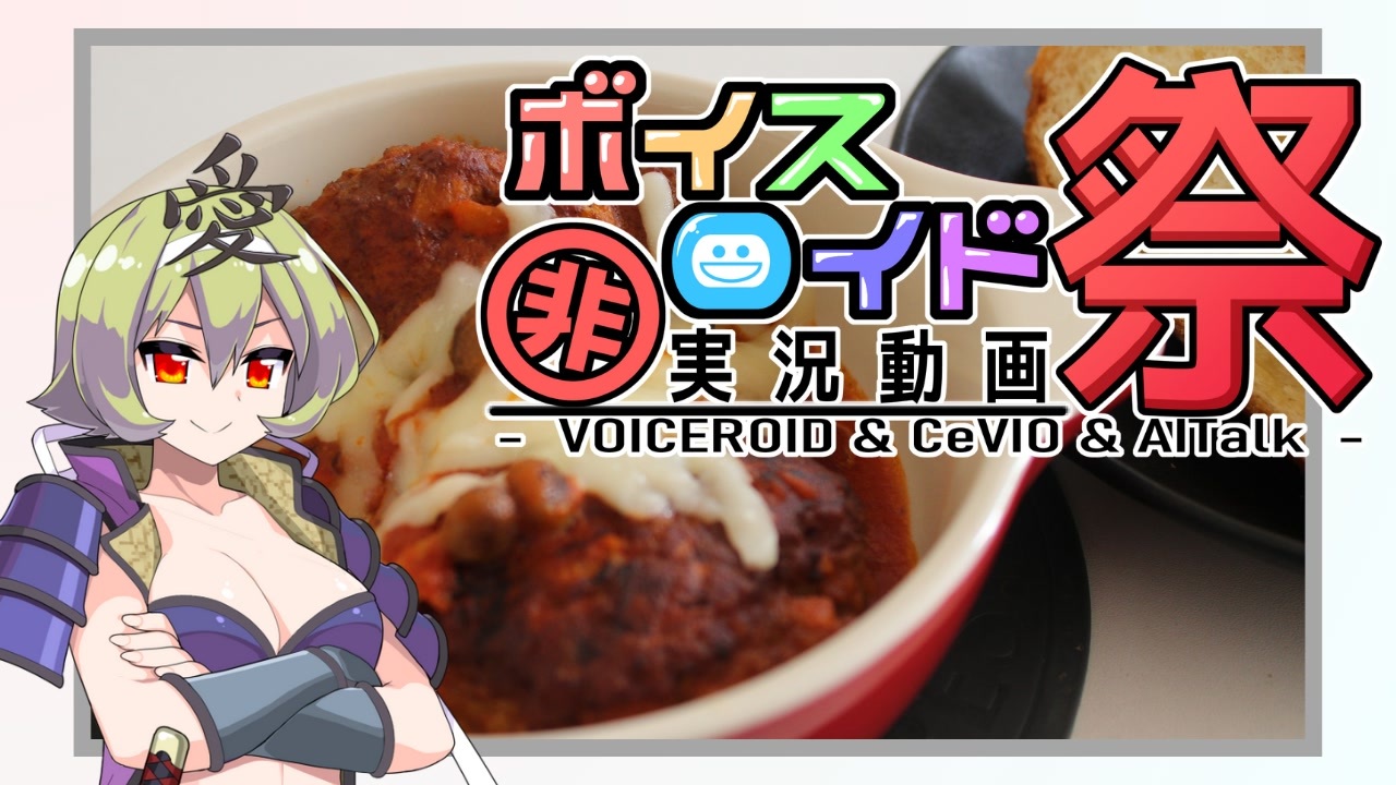 「第11回VOICEROID非実況動画祭」(<a href="https://www.nicovideo.jp/watch/sm44932816" class="watch">sm44932816</a>)の参加動画です。<br><br>ビィちゃんに「ハンバーグ!」と言わせたいからハンバーグを作りました。<br>ビィちゃんの可愛さにメロメロになってひかれている人を出したかったのでつるぎさんを出しました。<br>ビィちゃんに「せんせー!」と言ってもらいので剣崎先生を出しました。<br>ビィちゃんひとりじゃあまり話さなかったのでアルも出しました。<br>ありがとうございます。<br><br>使用音声<br>VOICEVOX:中部つるぎ<br>VOICEVOX:猫使ビィ<br>VOICEVOX:猫使アル<br>VOICEVOX:剣崎雌雄<br><br>立ち絵<br>あいくろう様<br>おチビ立ち絵 <a href="https://seiga.nicovideo.jp/seiga/im11480506" target="_blank" rel="noopener">im11480506</a><br>moiky様<br>中部つるぎ立ち絵素材 <a href="https://seiga.nicovideo.jp/seiga/im11543405" target="_blank" rel="noopener">im11543405</a><br>剣崎雌雄・人間形態立ち絵素材 <a href="https://seiga.nicovideo.jp/seiga/im11645930" target="_blank" rel="noopener">im11645930</a><br><br>動画・画像素材<br>イラストACより鼠の王国製作所様<br>キッチン 温かみのあるキッチン<br>ムビデコ様<br>ななめのトランジェンション<br>OKUMONO様<br>非実況動画祭_運営様<br>非実況動画祭(ひじき祭)ロゴ <a href="https://commons.nicovideo.jp/works/nc231508" target="_blank" rel="noopener">nc231508</a><br>RεïзN様<br>灰色のボウル <a href="https://commons.nicovideo.jp/works/nc234659" target="_blank" rel="noopener">nc234659</a><br><br>BGM<br>鷹尾まさき様<br>わくわくクッキングタイム的なBGM <a href="https://commons.nicovideo.jp/works/nc132272" target="_blank" rel="noopener">nc132272</a><br>効果音ラボ様<br>シーン切り替え1 <a href="https://commons.nicovideo.jp/works/nc278377" target="_blank" rel="noopener">nc278377</a><br>紙を広げる1 <a href="https://commons.nicovideo.jp/works/nc135071" target="_blank" rel="noopener">nc135071</a><br><br>フォント<br>あずきフォント<br>じゆうちょうフォント<br>いろはマル<br>モッチ―ポップ<br>玉ねぎ楷書「激」 <a href="https://www.nicovideo.jp/watch/sm38673088" class="watch">sm38673088</a><br>うたミンフォント 小1版 <a href="https://seiga.nicovideo.jp/seiga/im5414314" target="_blank" rel="noopener">im5414314</a><br>殴り書きクレヨン